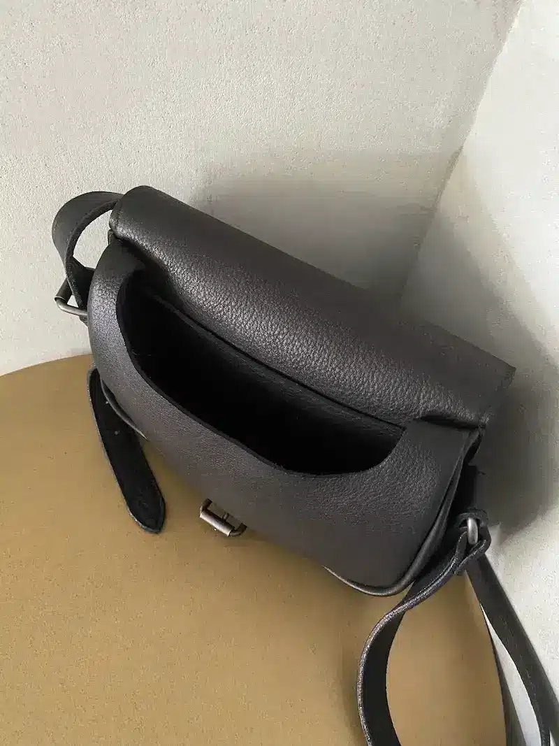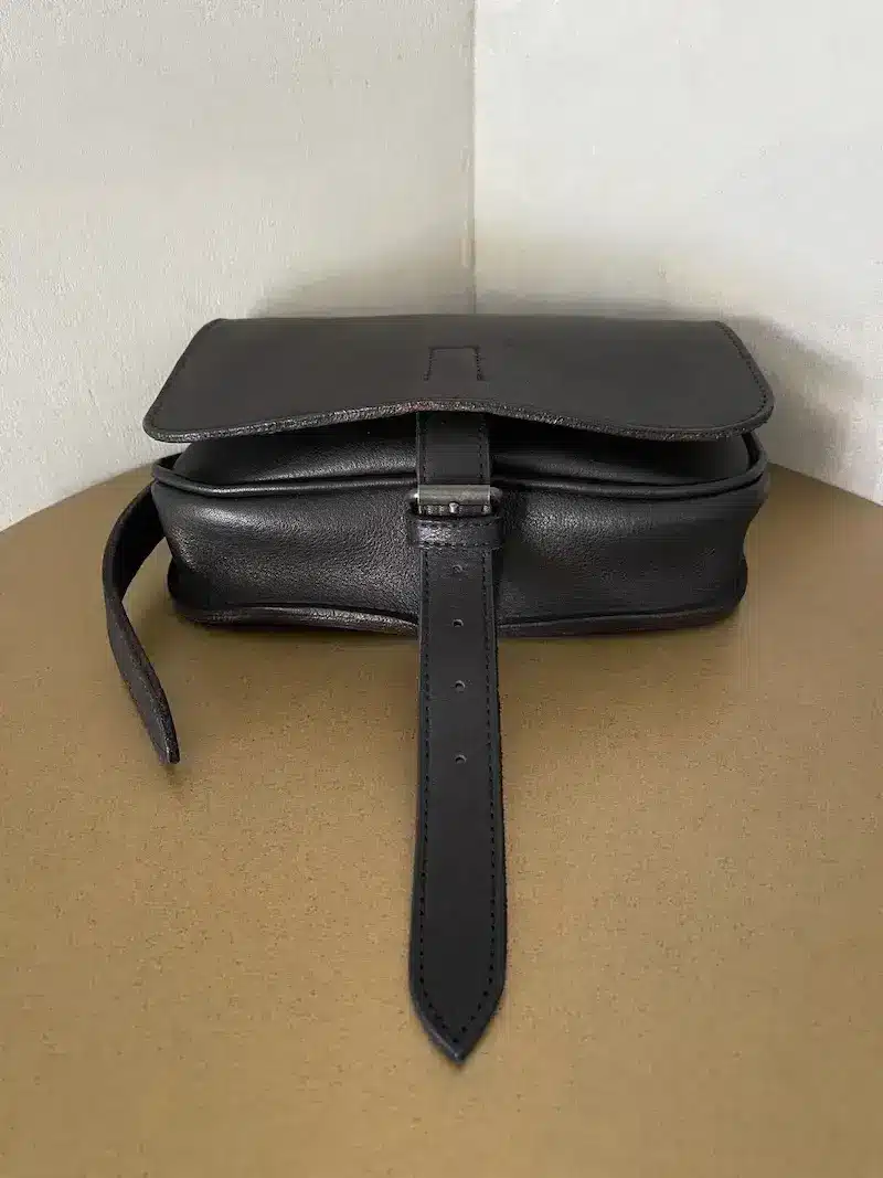 Small black leather shoulder bag with two internal pockets, buckle closure, and strap. Dimensions: H 17 cm, W 21 cm, D 5 cm. Made in Japan.