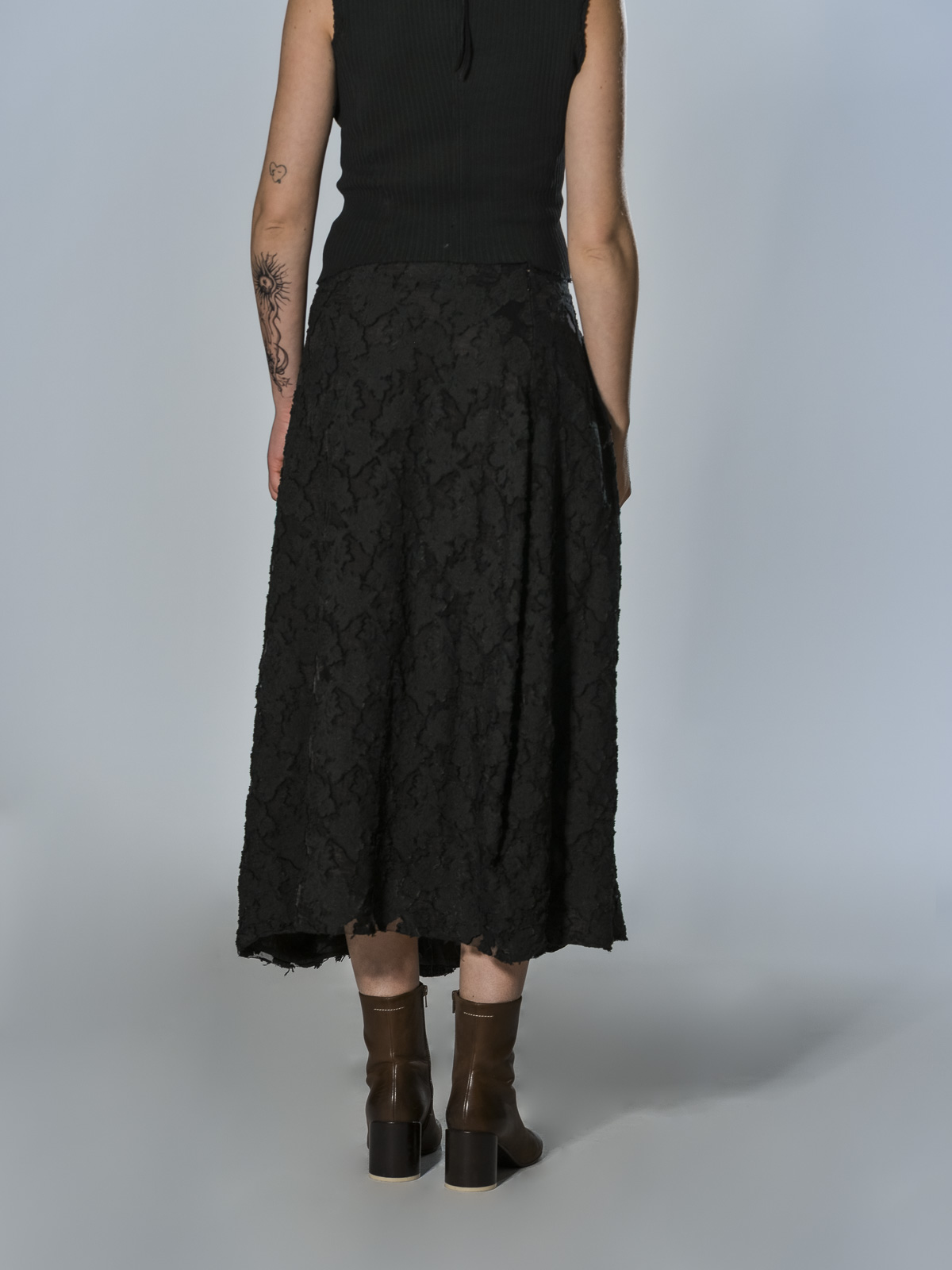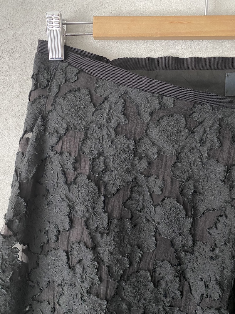 A burnout floral skirt crafted from burnout fabric, creating a sheer, textured effect. Fully lined in cotton, it features a grosgrain waistband with an invisible zip. It features a loose fit with a structured front panel, a knee-length silhouette, and an irregular, raw-cut hem.