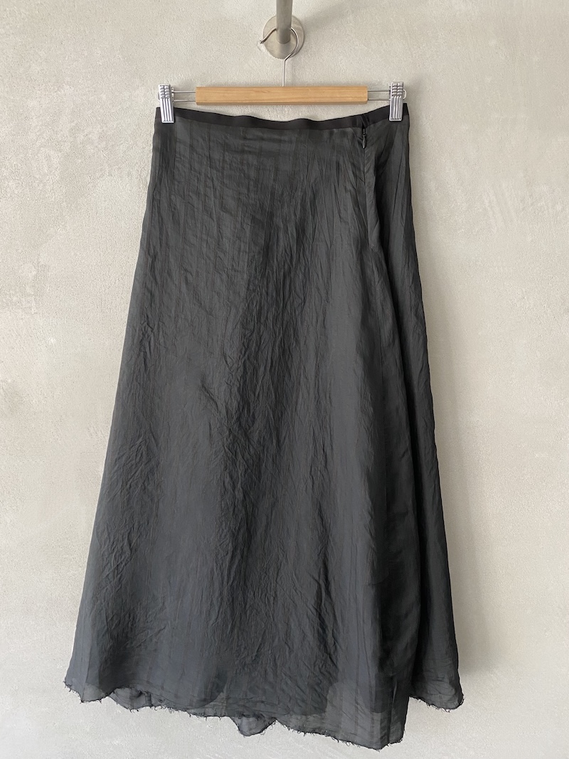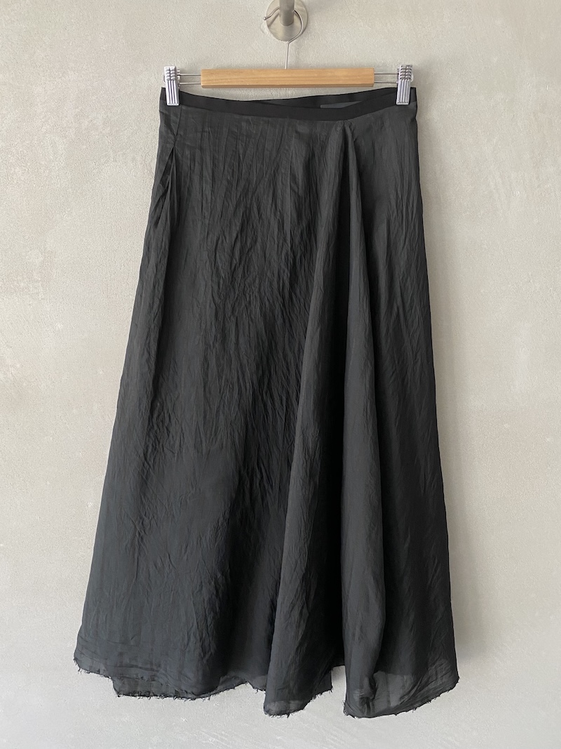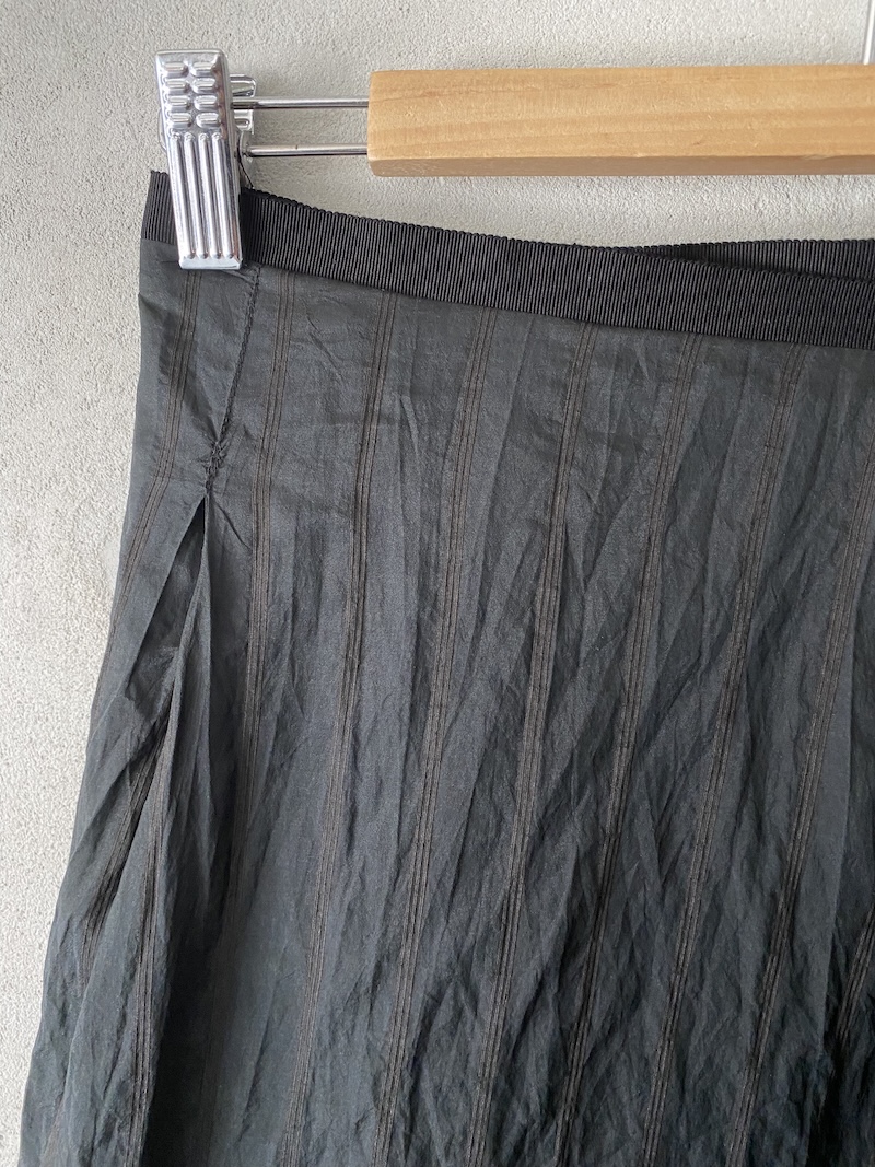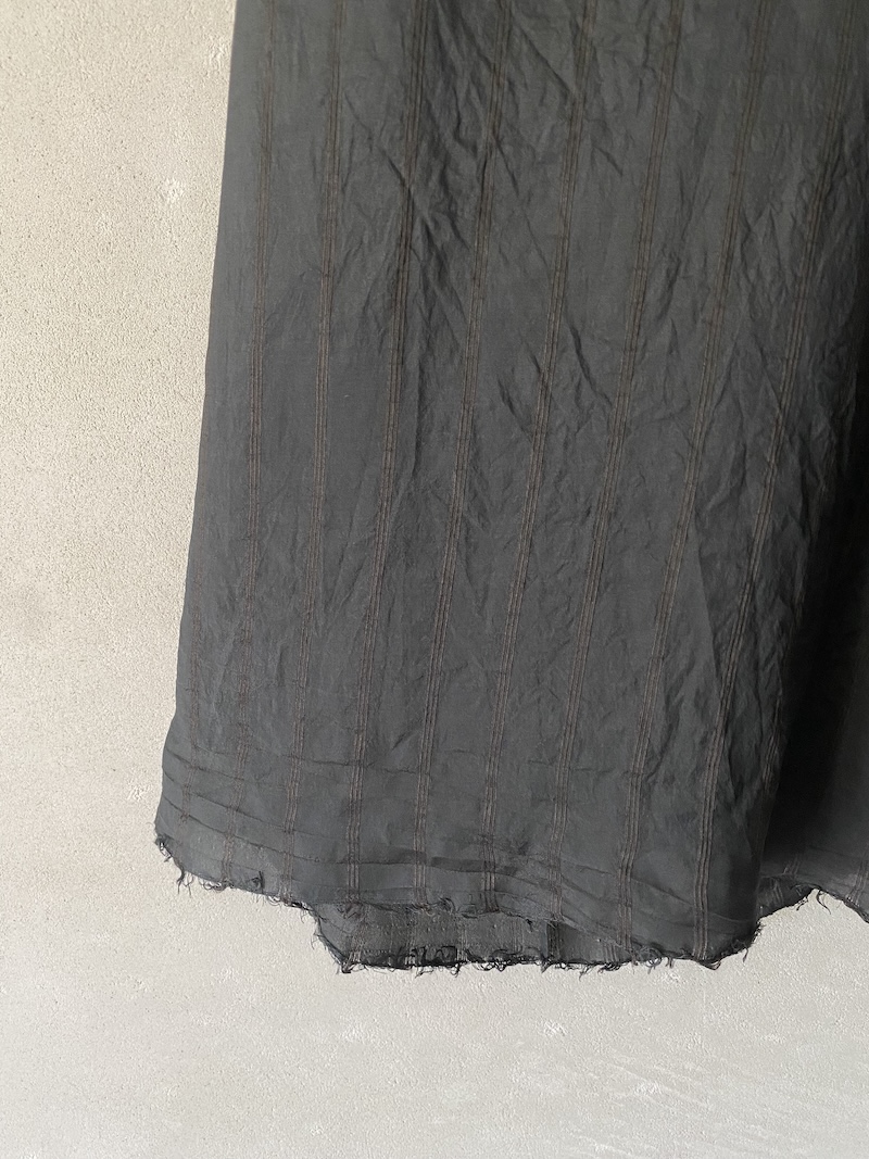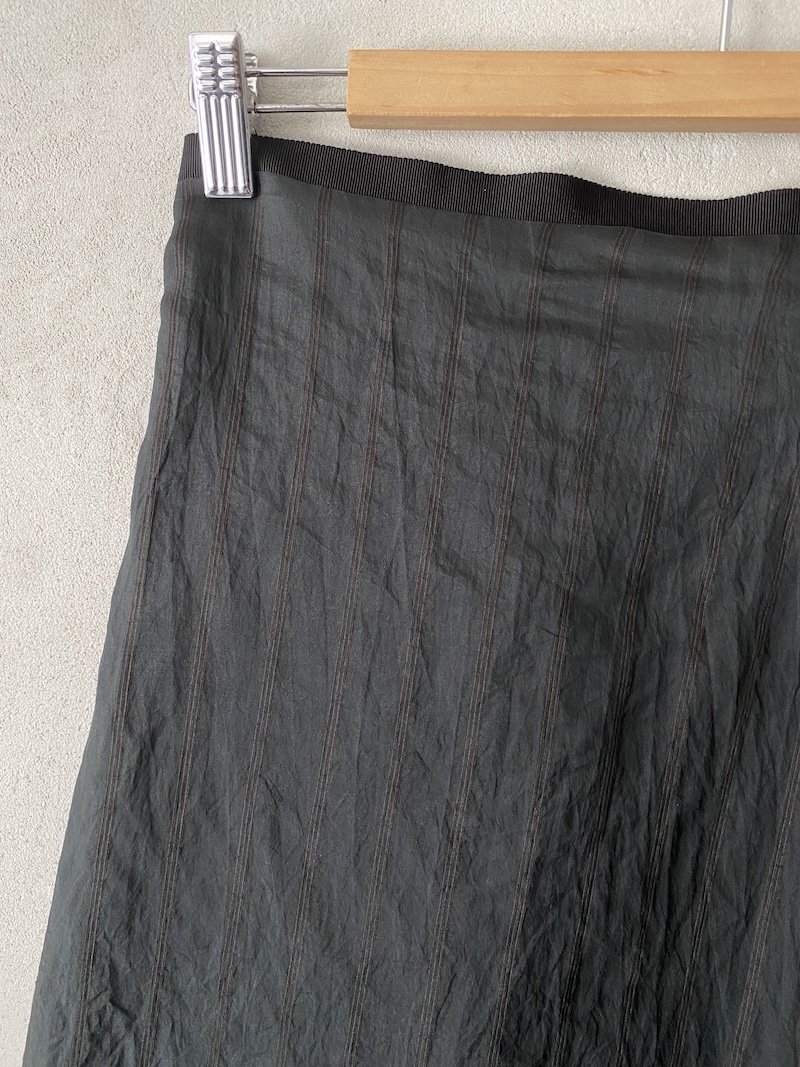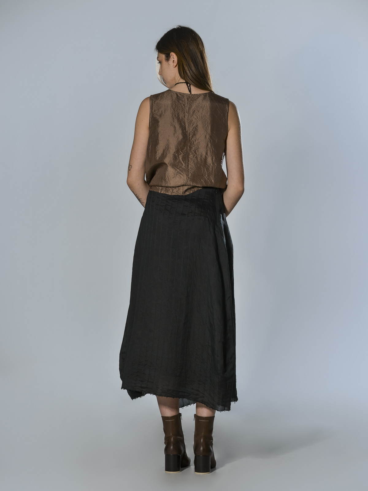 Silk and linen skirt with a raised stripe pattern, fully lined in silk. It features a waistband with an invisible zip closure, a loose fit with structured volume and a pleat at the front, and an irregular, raw-cut hem.