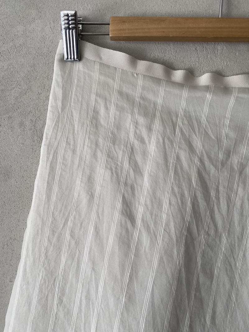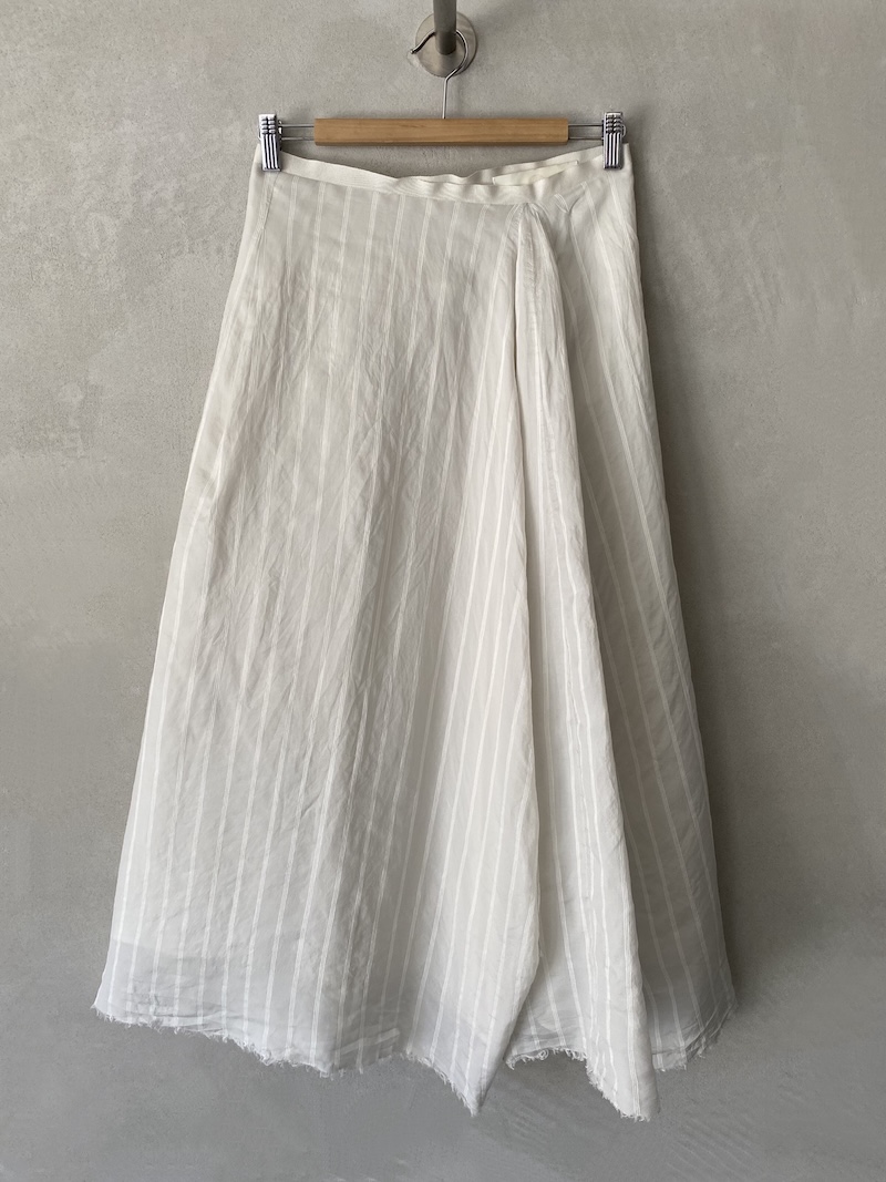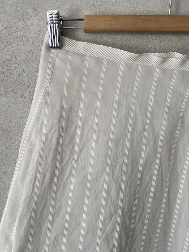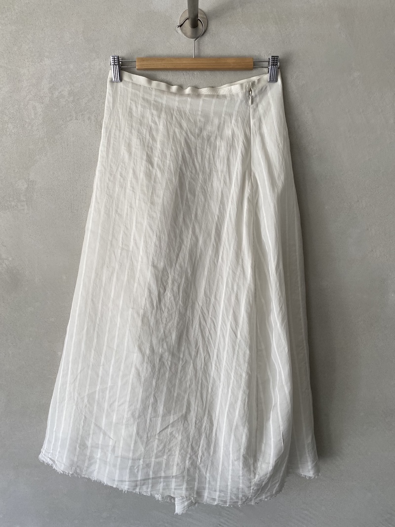 Silk and linen skirt with a raised stripe pattern, fully lined in silk. It features a waistband with an invisible zip closure, a loose fit with structured volume and a pleat at the front, and an irregular, raw-cut hem.