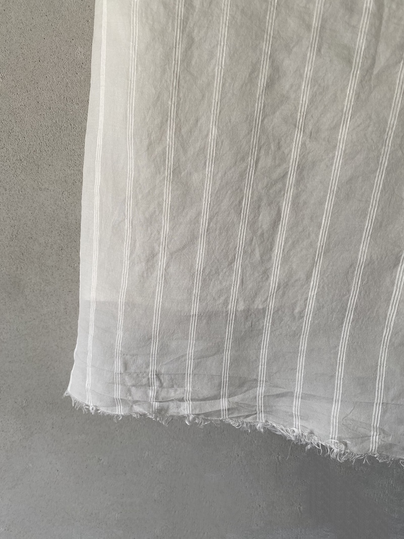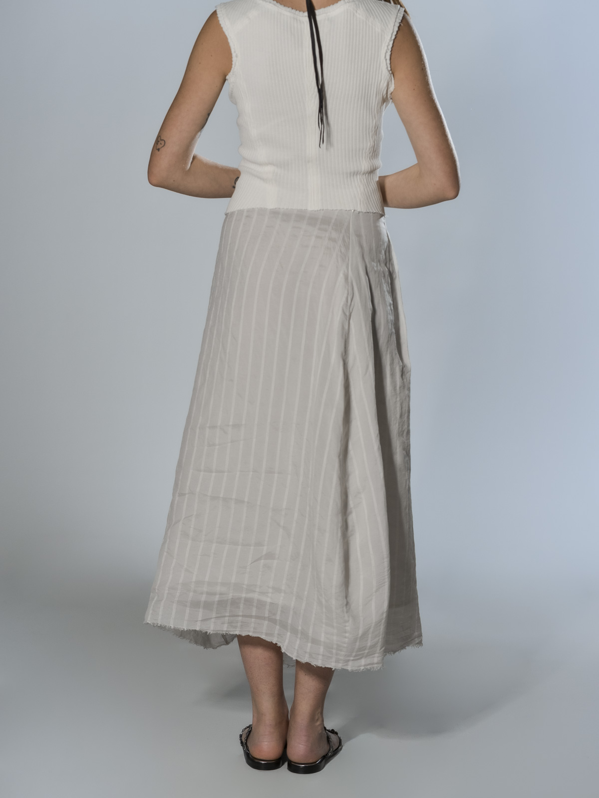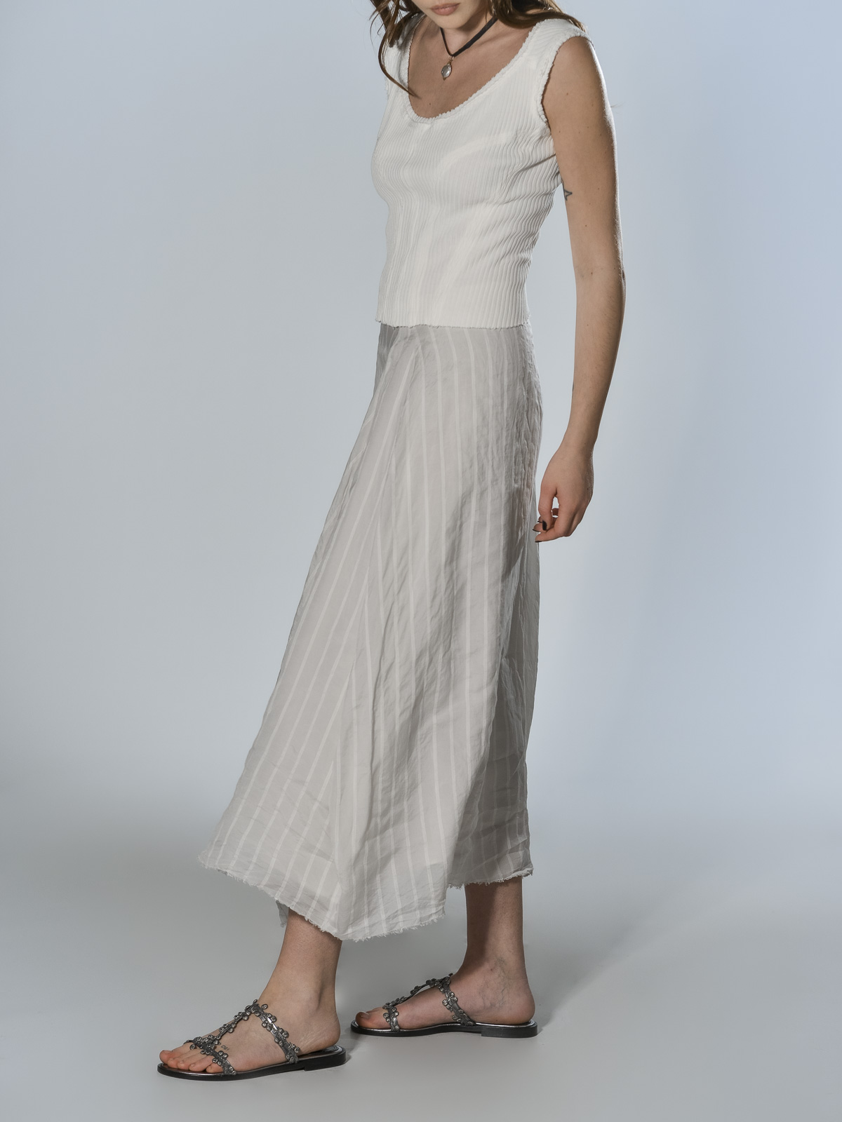 Silk and linen skirt with a raised stripe pattern, fully lined in silk. It features a waistband with an invisible zip closure, a loose fit with structured volume and a pleat at the front, and an irregular, raw-cut hem.