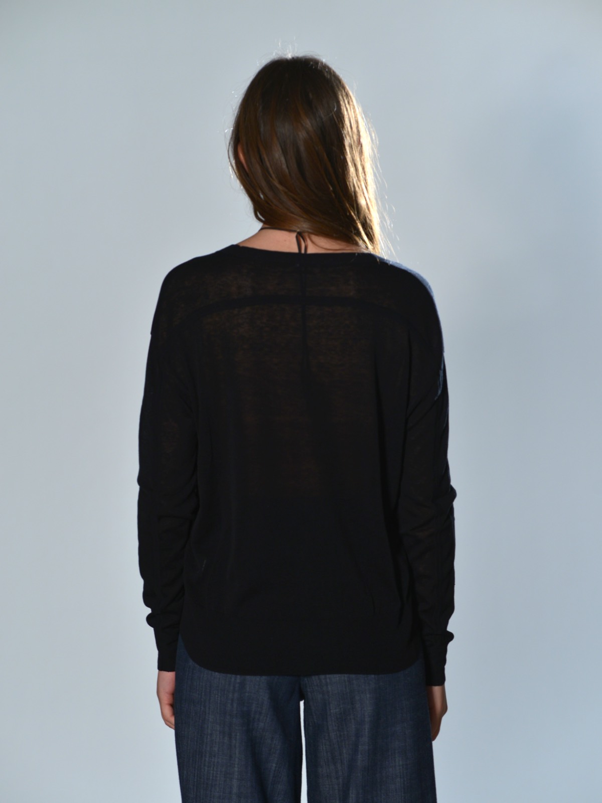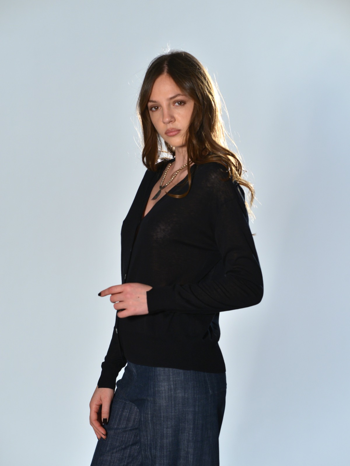 Slightly sheer silk and cotton cardigan. Deep V-neck with six-button center front closure and ribbed trim. Dropped shoulders and long sleeves with ribbed cuffs. Ribbed hem creates a subtle blouse effect.