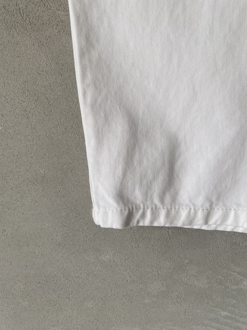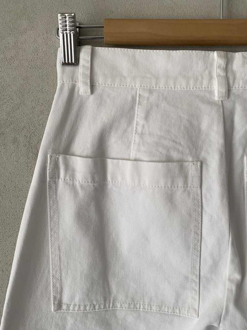 Cotton trousers. Belt loops at the waist, front zip, and button closure. Two front patch pockets and two back patch pockets. Horizontal knee seam. Wide, straight leg. Topstitched hem.
