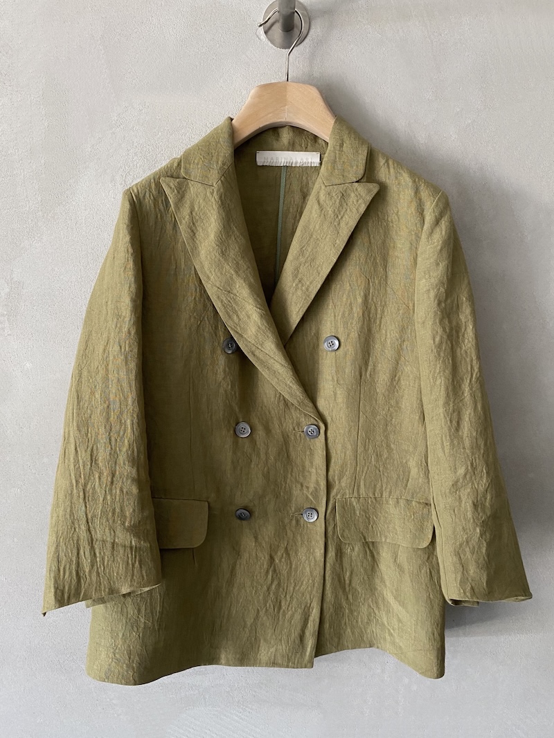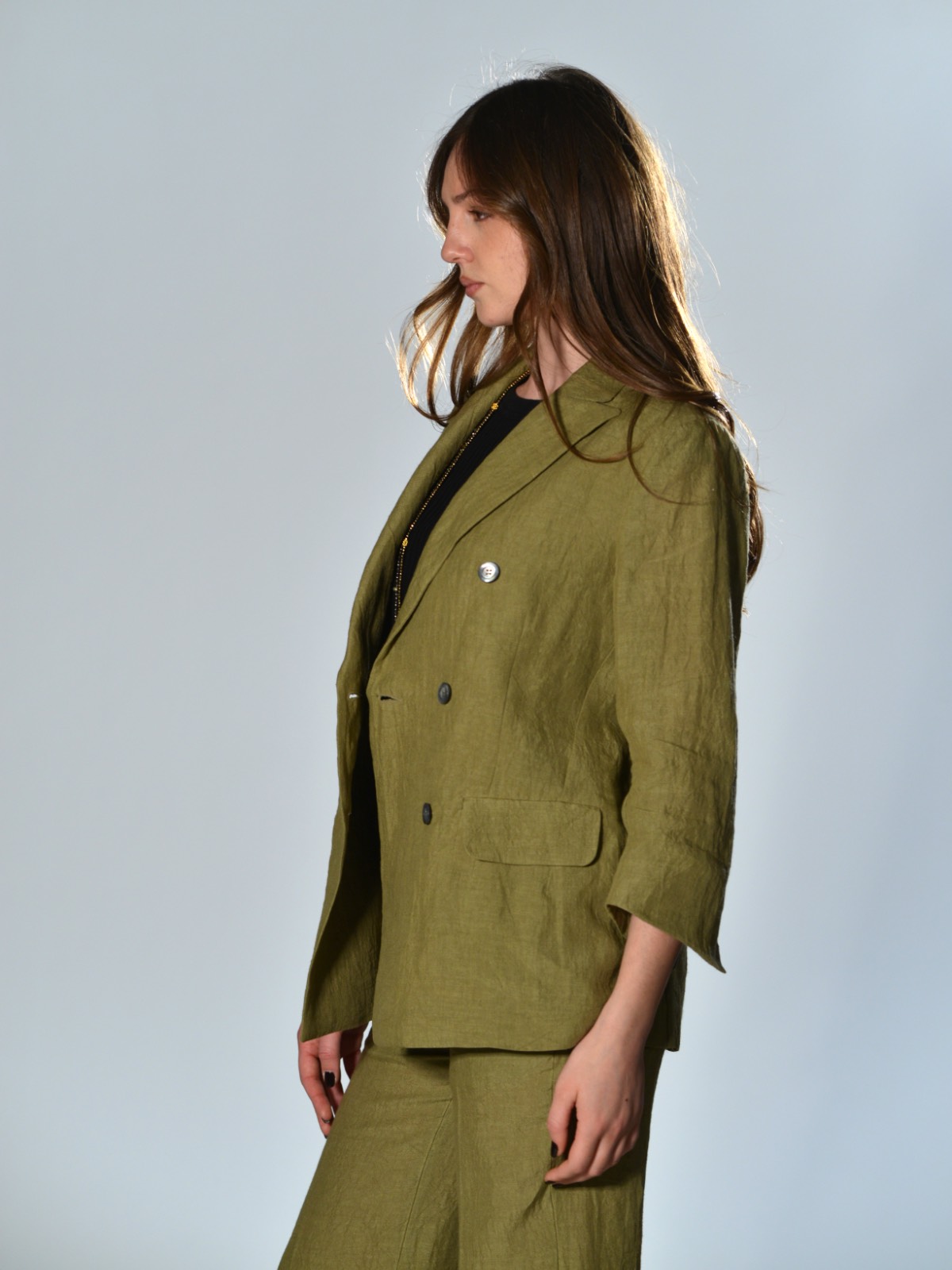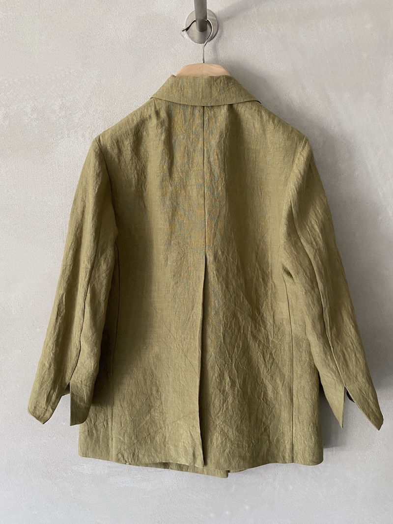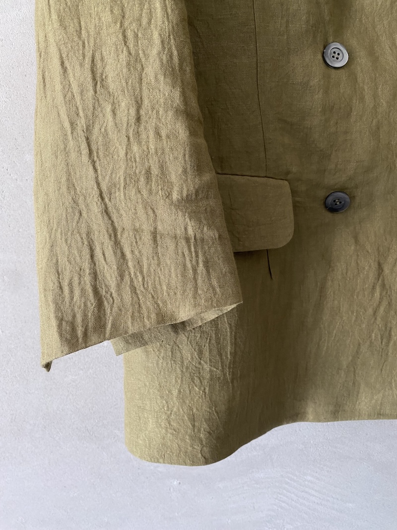 Unlined double-breasted jacket in slightly creased linen fabric. It fastens with six mother-of-pearl buttons at the front. It features two welt pockets with flaps, long sleeves with slits at the bottom, and a high center vent at the back.