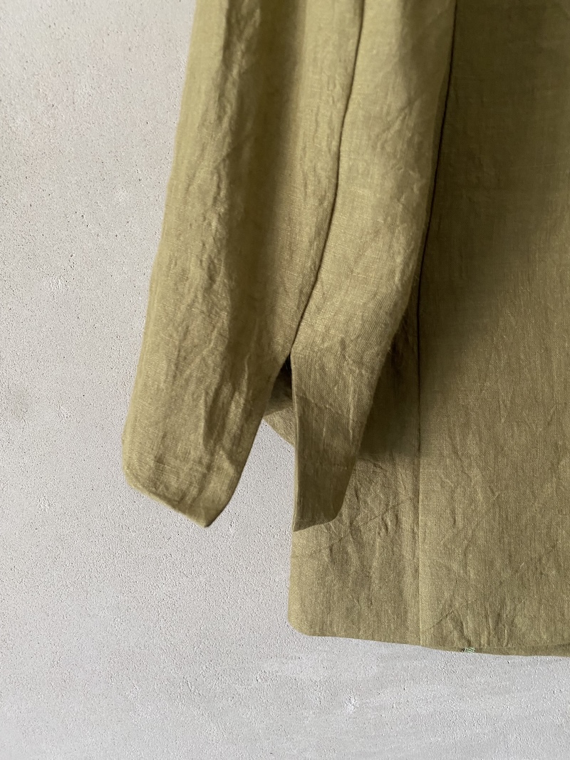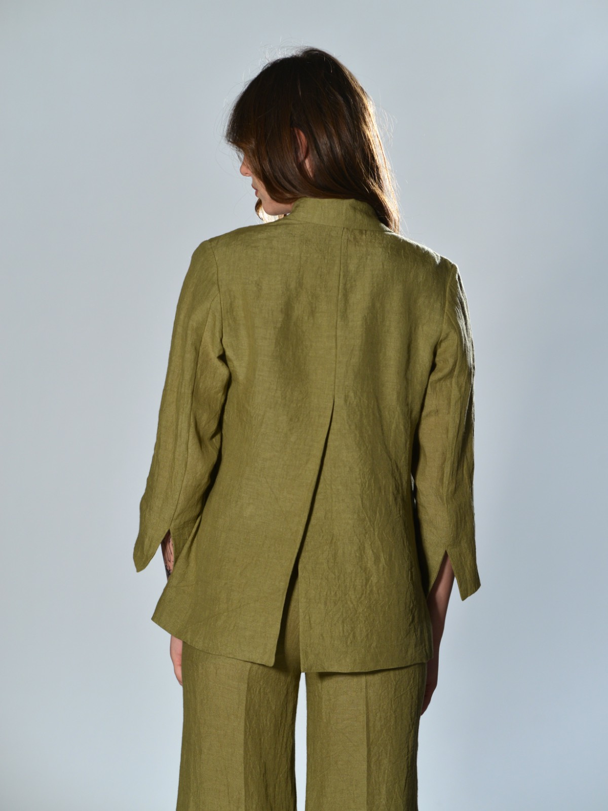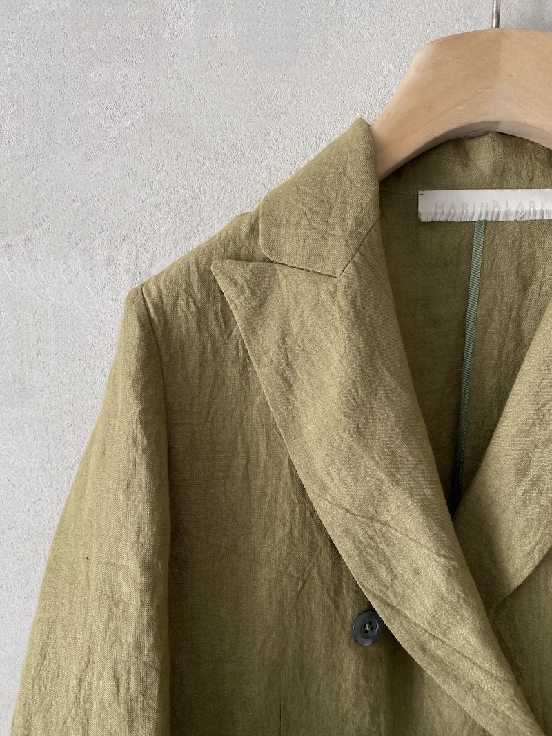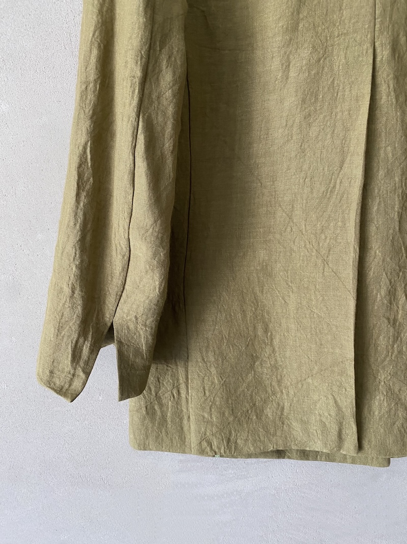 Unlined double-breasted jacket in slightly creased linen fabric. It fastens with six mother-of-pearl buttons at the front. It features two welt pockets with flaps, long sleeves with slits at the bottom, and a high center vent at the back.