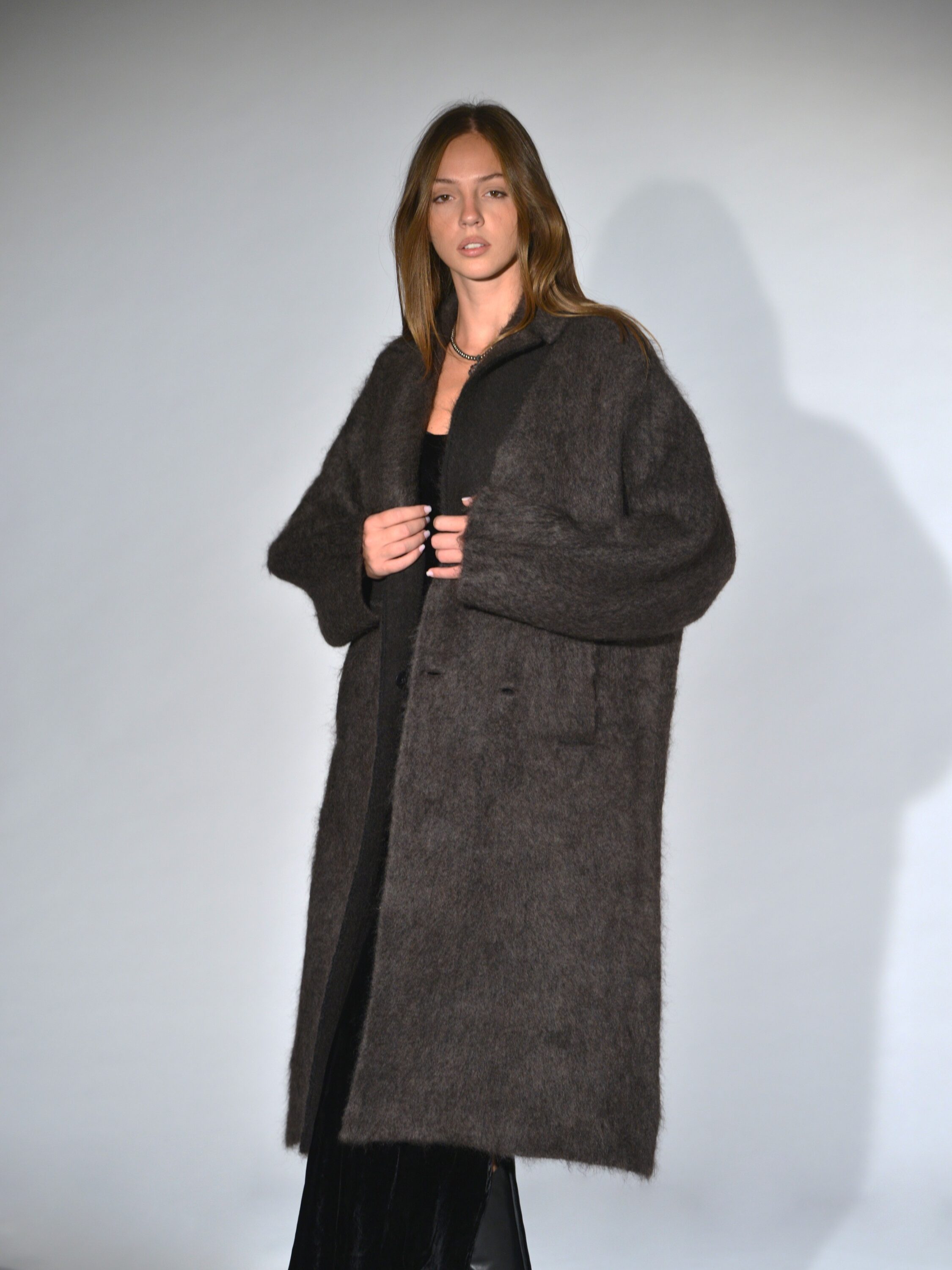 Double-breasted coat in mixed melange yarns. This garment is especially soft and warm, featuring an oversized fit made entirely in Italy. Dropped shoulder, wide sleeve turn, closed with four buttonholes and concealed buttons, two vertical flap pockets. . Size XS measurements: length 114 cm, chest width 60 cm. Later size measurements will increase 2 cm in length and 4 cm in circumference.