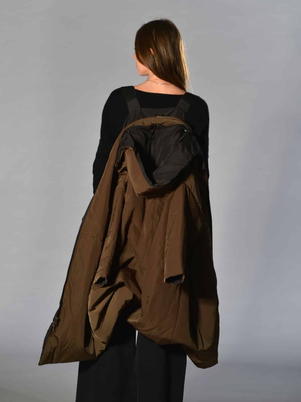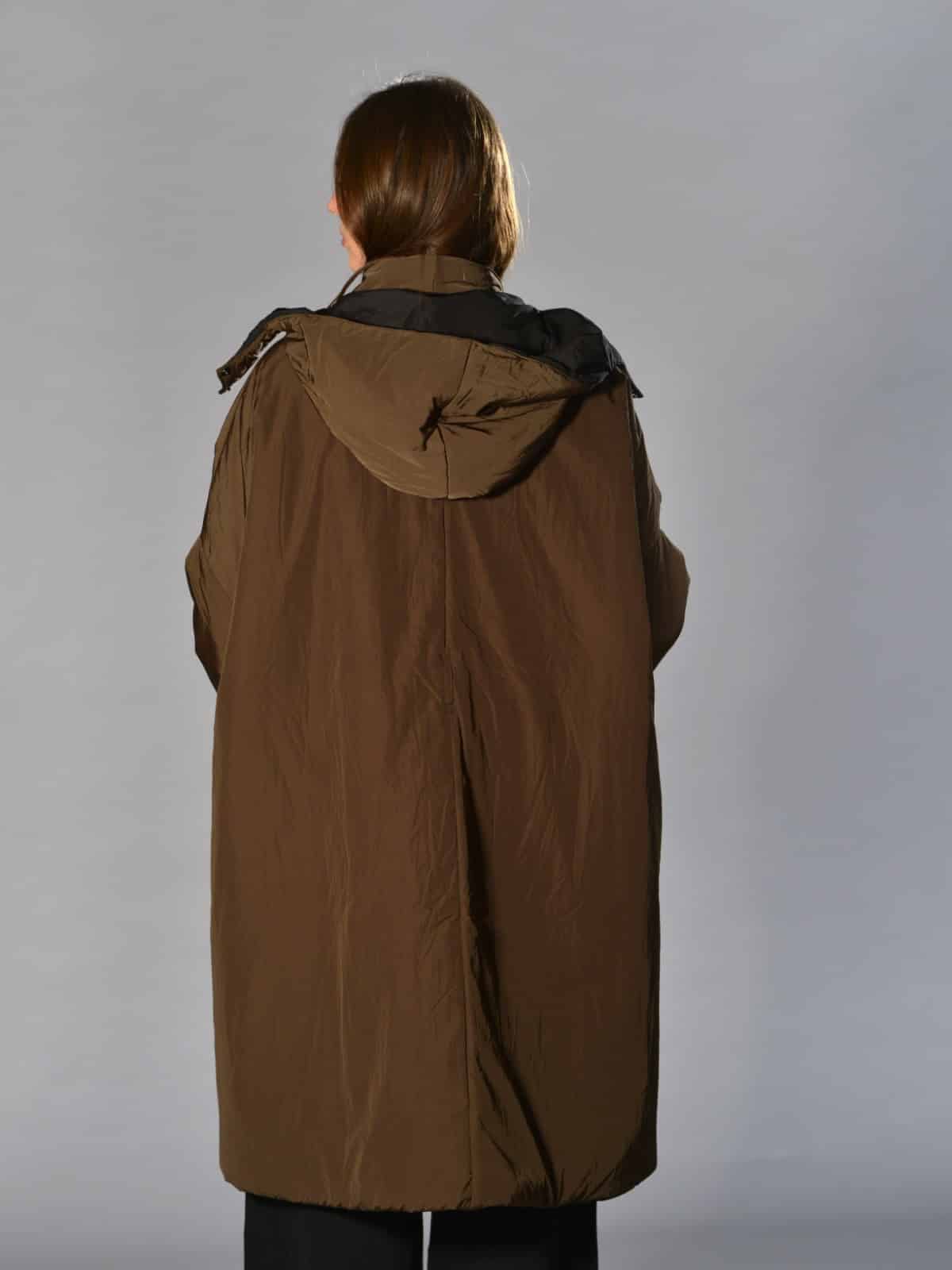 Cappotto piumino oversize Kimonorain reversibile senape/nero, con cappuccio e cintura rimovibili, chiusura con zip, tasche laterali e imbottitura leggera
