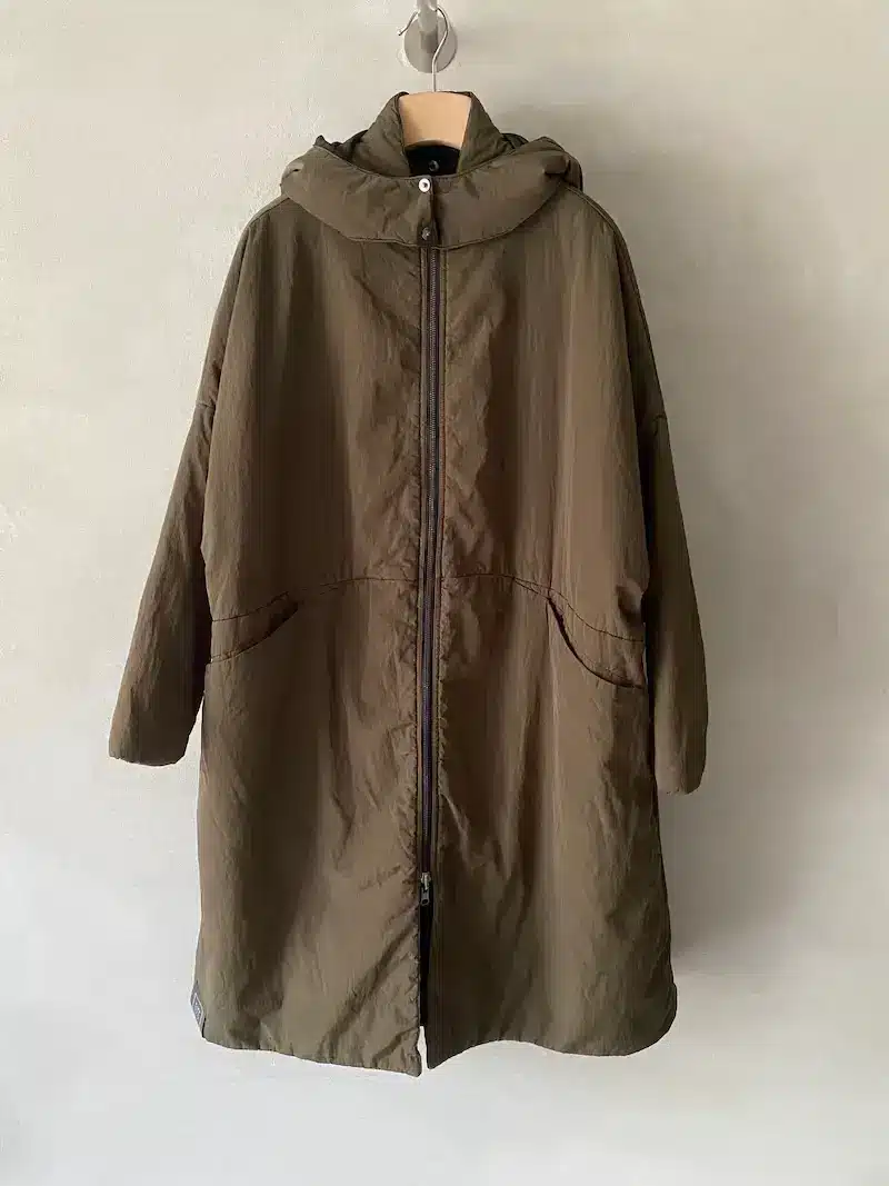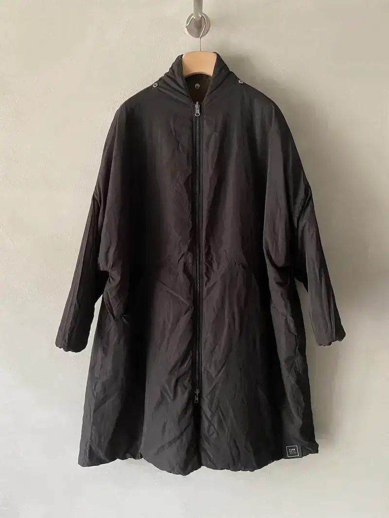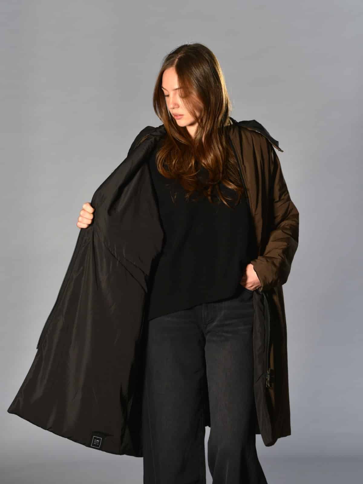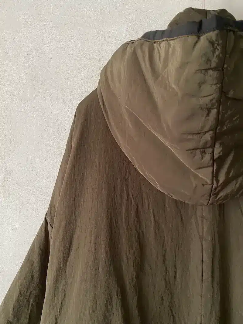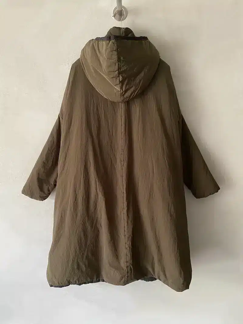 Fully reversible oversized down coat in two colours, removable hood and belt, central front fastening with visible zip, 2 large side pockets, light padding. Size XS measurements: length 100 cm, width 75 cm. The measurements of subsequent sizes will increase 4 cm in circumference and 2 cm in length.