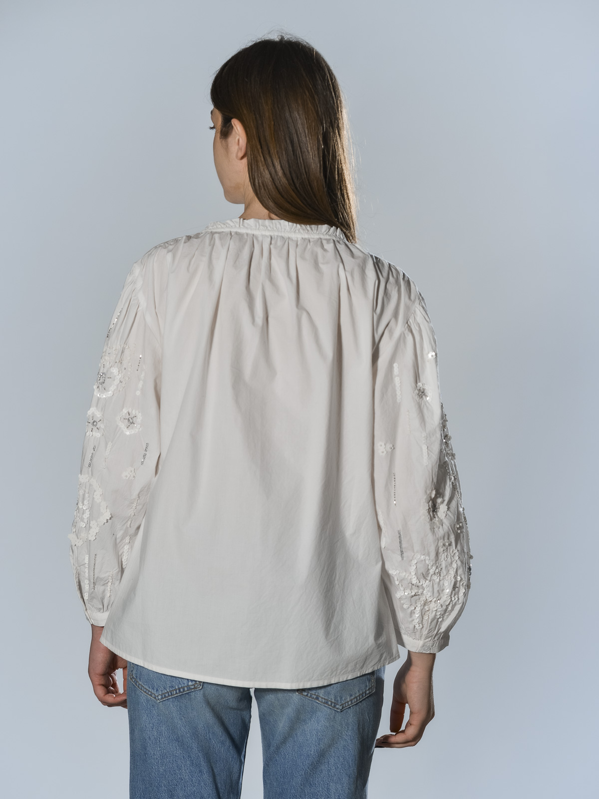 Cotton blouse with tone-on-tone embroidery and sequin appliqués, a lightweight fabric with a soft feel. It features a V-neck with a gathered collar, a front opening with four buttons, slightly dropped shoulders, long, loose-fitting sleeves with low buttoned cuffs, a flared fit with flowing volume, and a rounded hem with clean finishes. Loose fit.