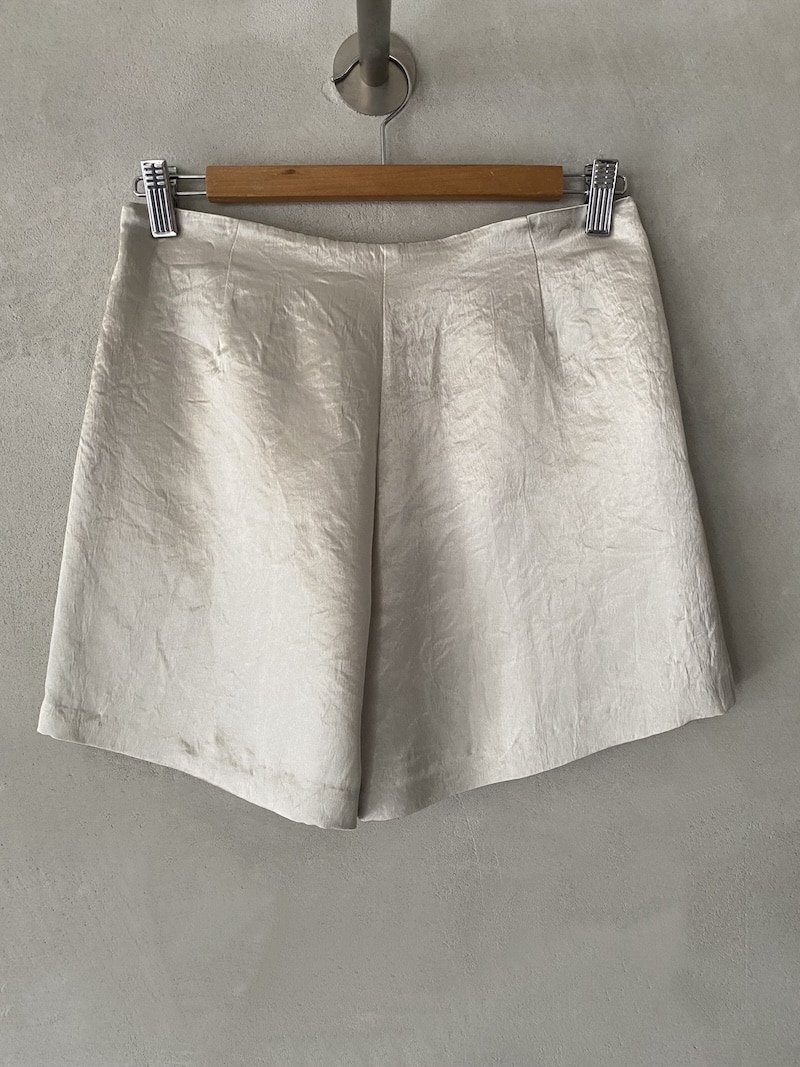 Shorts in acetate fabric with a slightly creased finish. Regular waist with a clean cut and invisible side zip closure. Two slanted side pockets. Slightly flared with a simple hem. Regular fit.