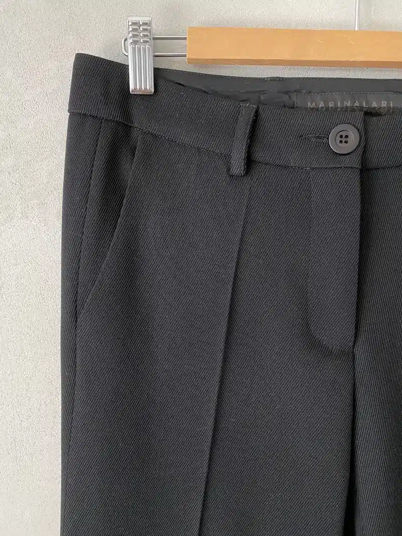 Straight leg slightly flared trousers, melange fabric with diagonal weave, low waist, belt loops fastened with 1 button, center front zipper and flap closure, 2 side slant pockets, 2 back welt pockets secured with button and buttonhole. Measurements size 38: length 103 cm, waist circumference 76 cm, hip circumference 92 cm. The measurements of subsequent sizes will increase by 1 cm in length and 4 cm in circumference.