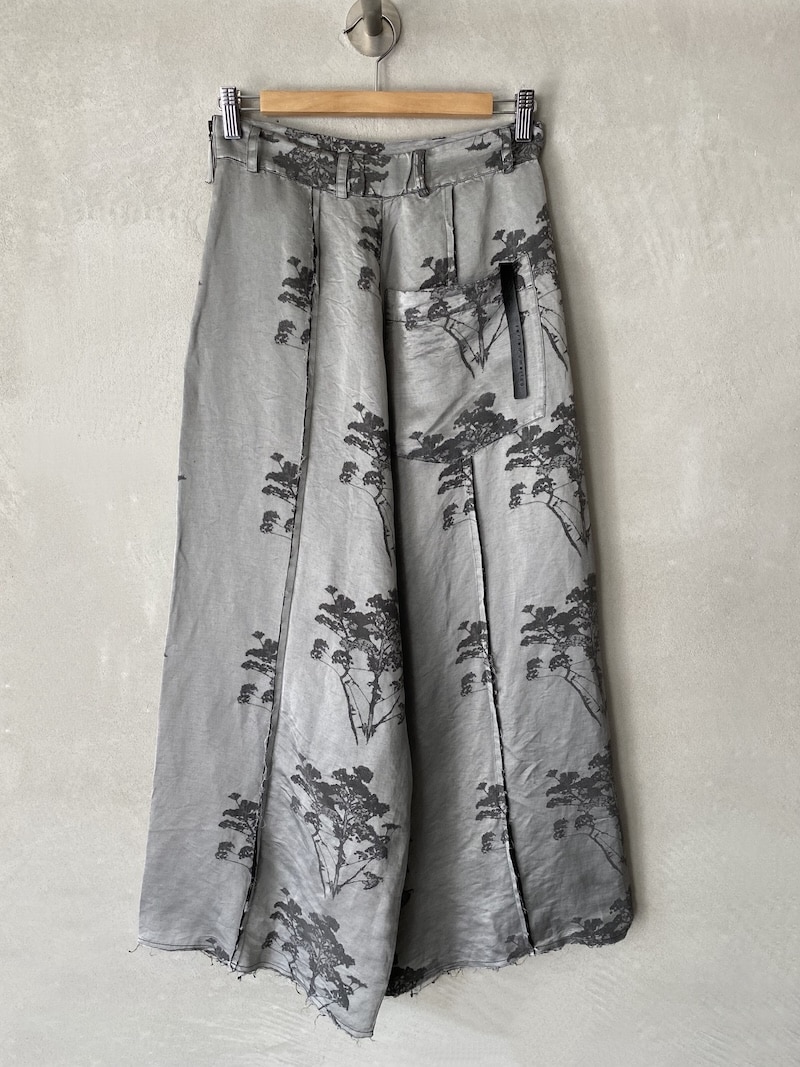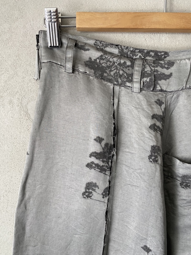 Oversized trousers in damask jacquard fabric with a woven botanical motif on a gray background. Featuring a low crotch and a wide fit, they feature asymmetrical panels that create movement and a slightly deconstructed effect on the front. Waistband with belt loops and exposed zip closure. Inset side pockets and a large patch pocket on the right back. Extra-wide legs with raw-cut hems and topstitching. Oversized fit.