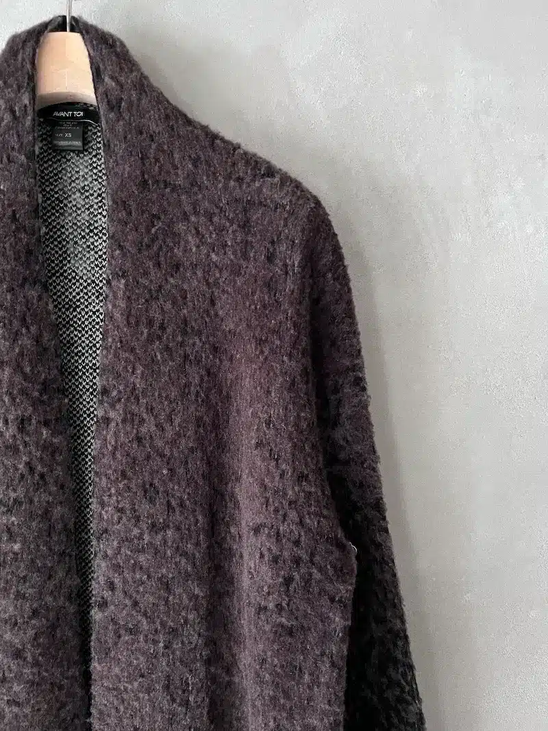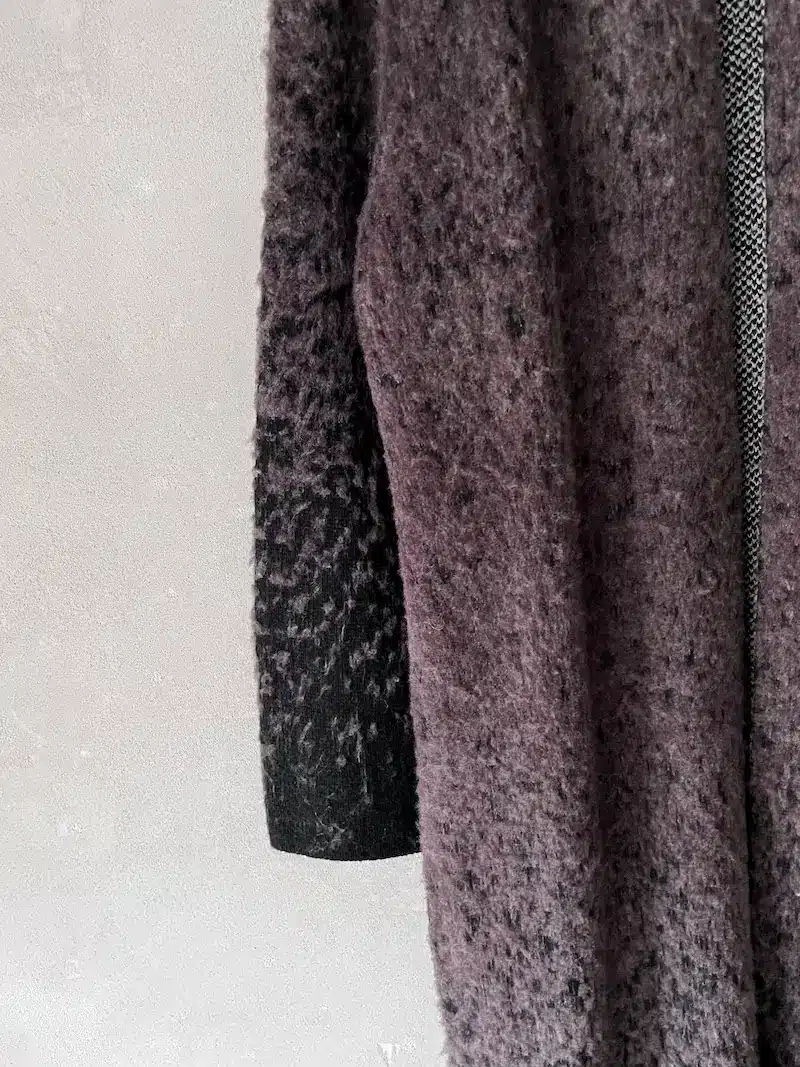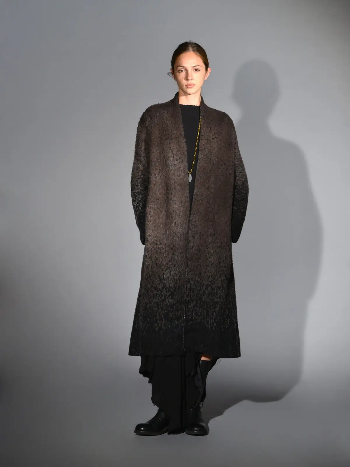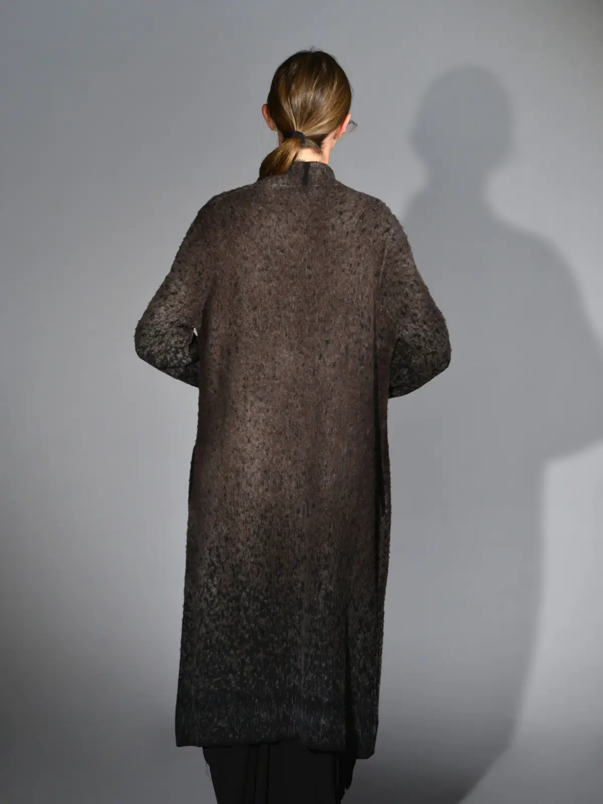 Hand-painted jacquard knit midi coat, open front, buttonless, shawl collar, two side seam pockets. Size XS measurements: length 120 cm, chest width 54 cm. Later size measurements will increase by 2 cm in length and 4 cm in circumference.