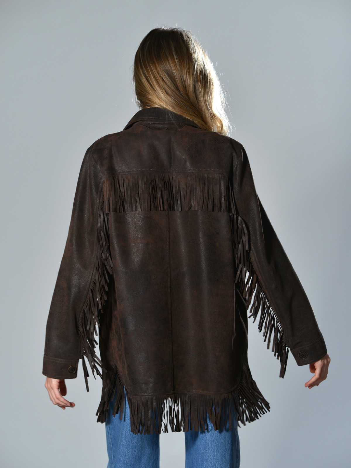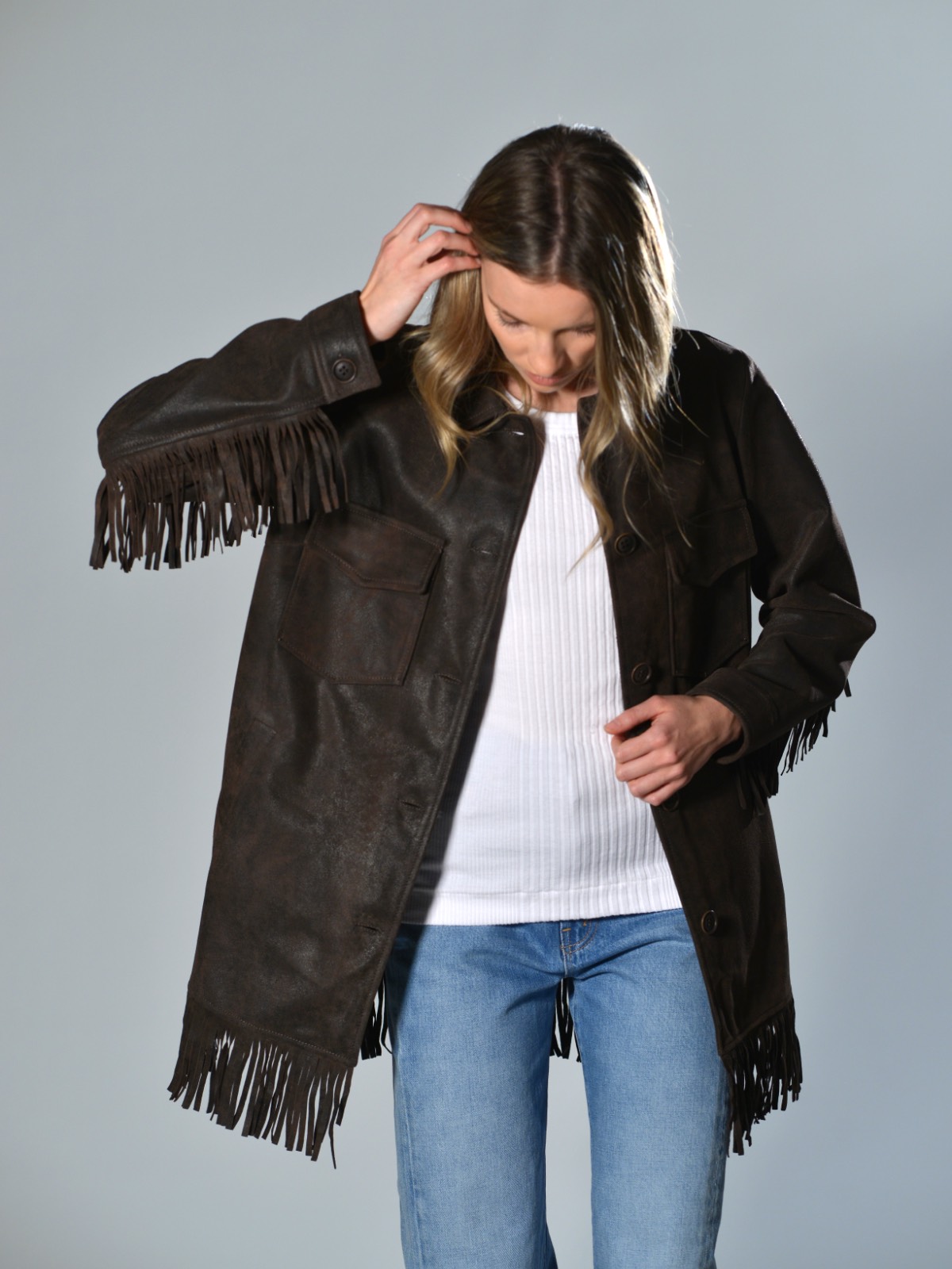 3/4 jacket in aged suede. Fully unlined with decorative fringing on shoulders, sleeves, and hem. Central front fastening with four buttons and buttonholes. Equipped with two high patch pockets with a flap and two slanted pockets. Shoulders, sleeves and hem finished with fringes Long sleeves with buttoned cuffs. Regular fit.