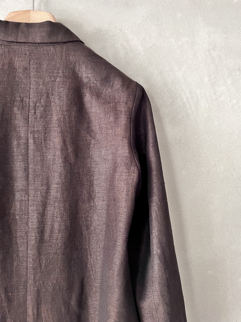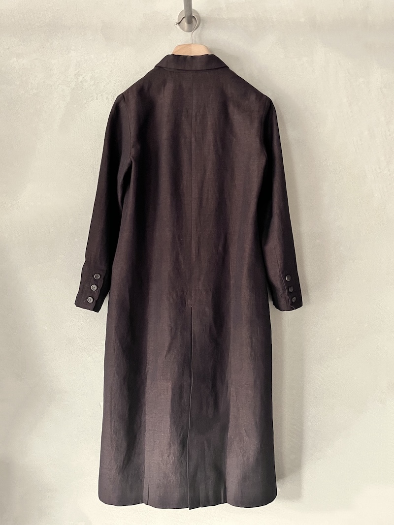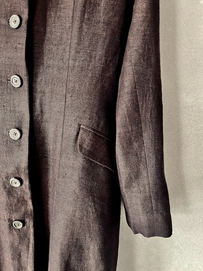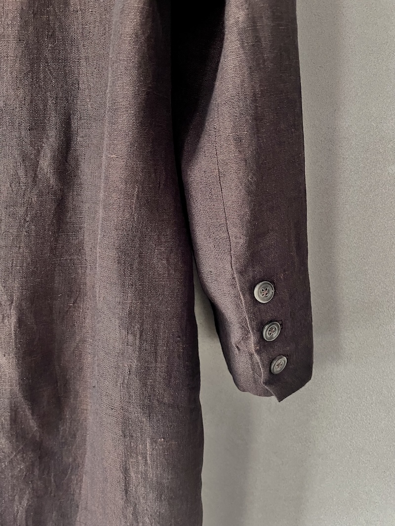 Linen coat with cotton lining, a lightweight fabric with a natural feel. Garment-dyed with natural dyes. It features a lapel collar, regular shoulders, long straight sleeves, a straight fit with a relaxed fit, a straight hem with clean finishes, welt pockets with flaps, and a front button closure. Regular fit.