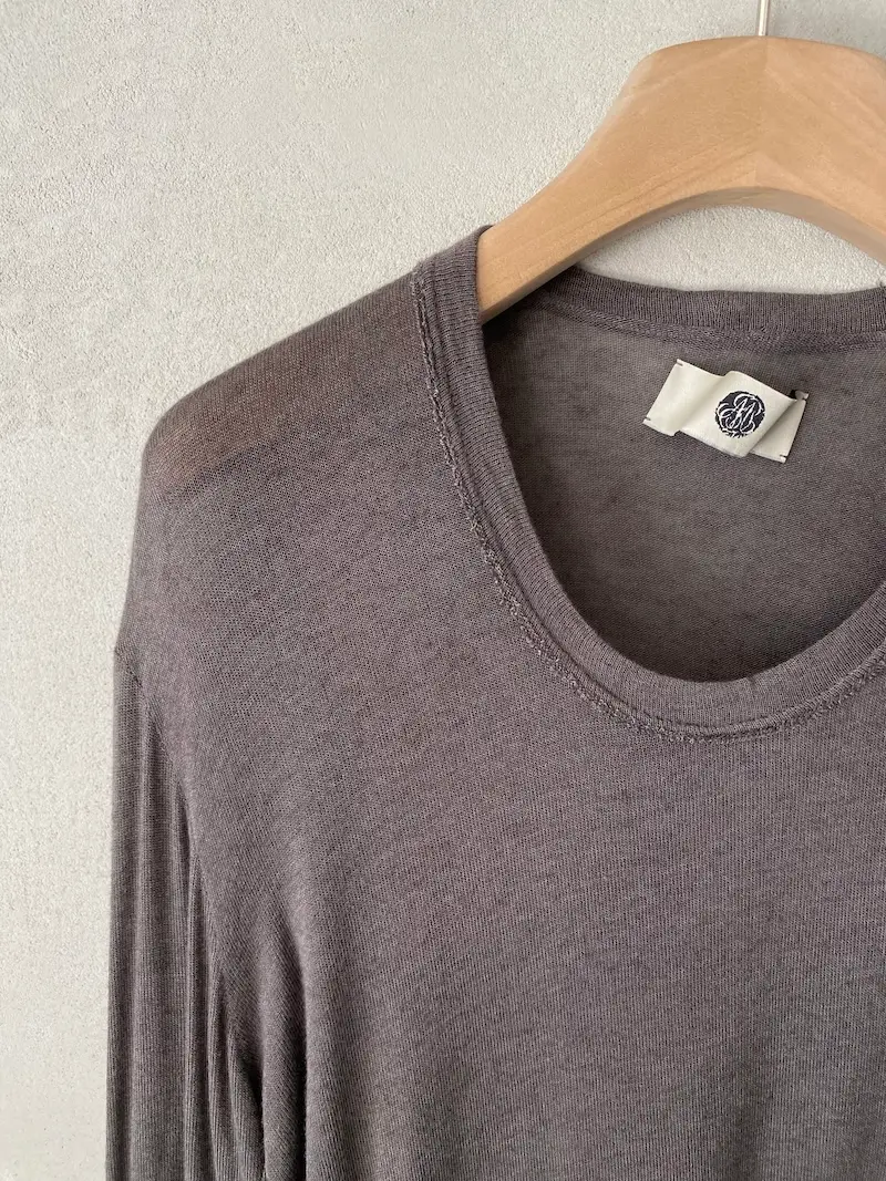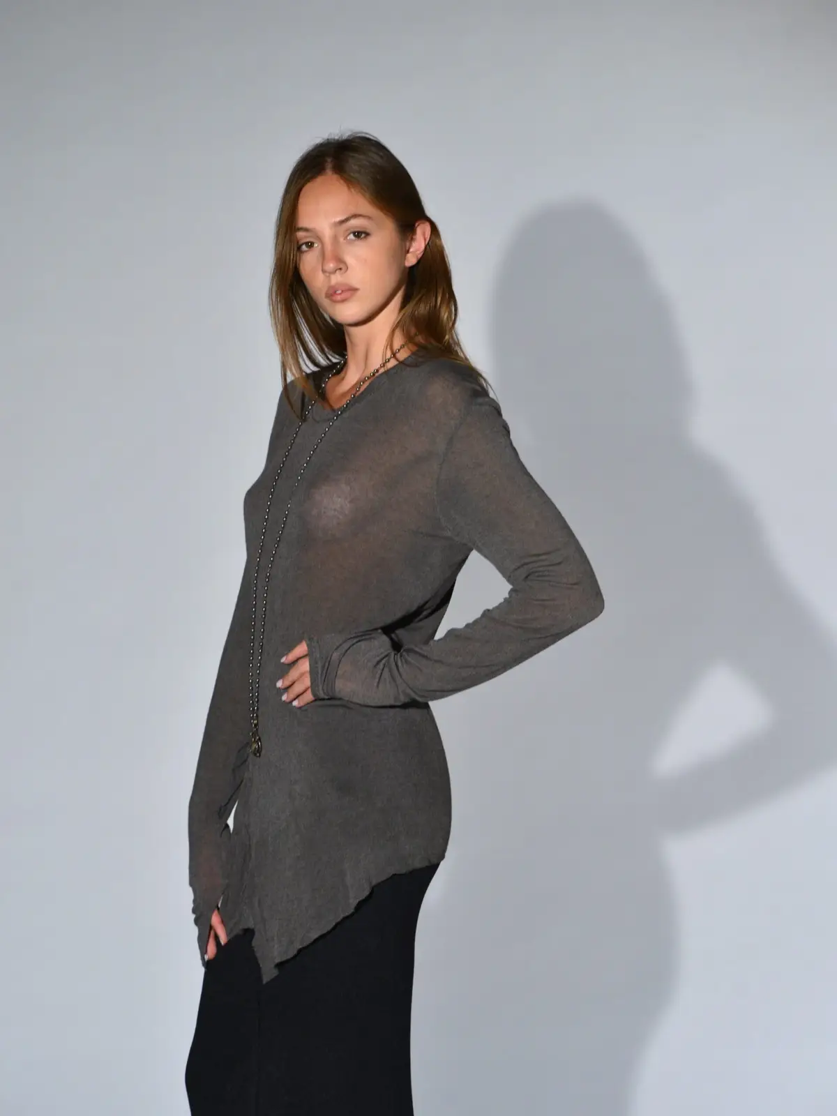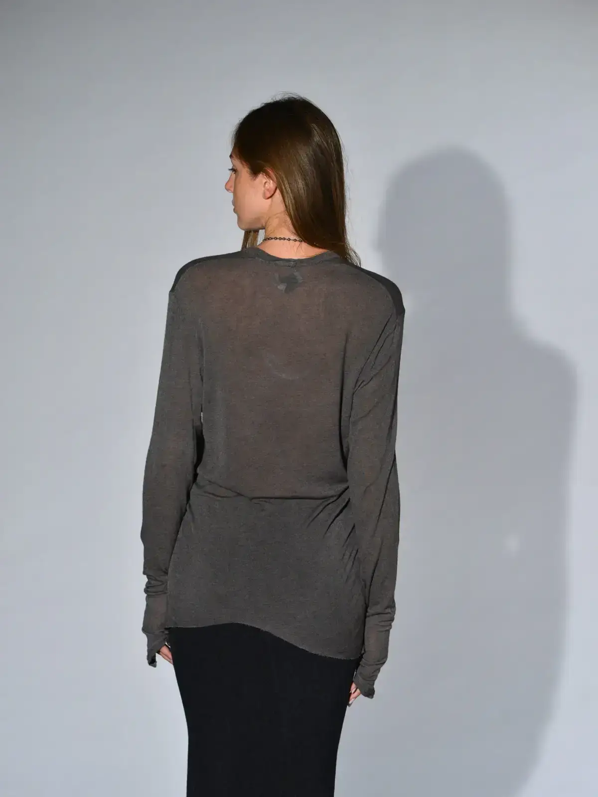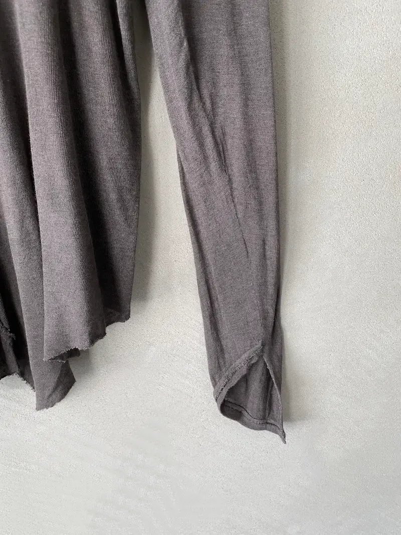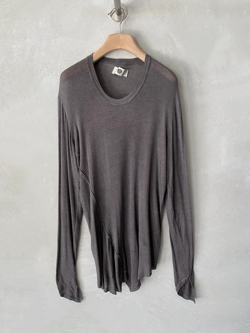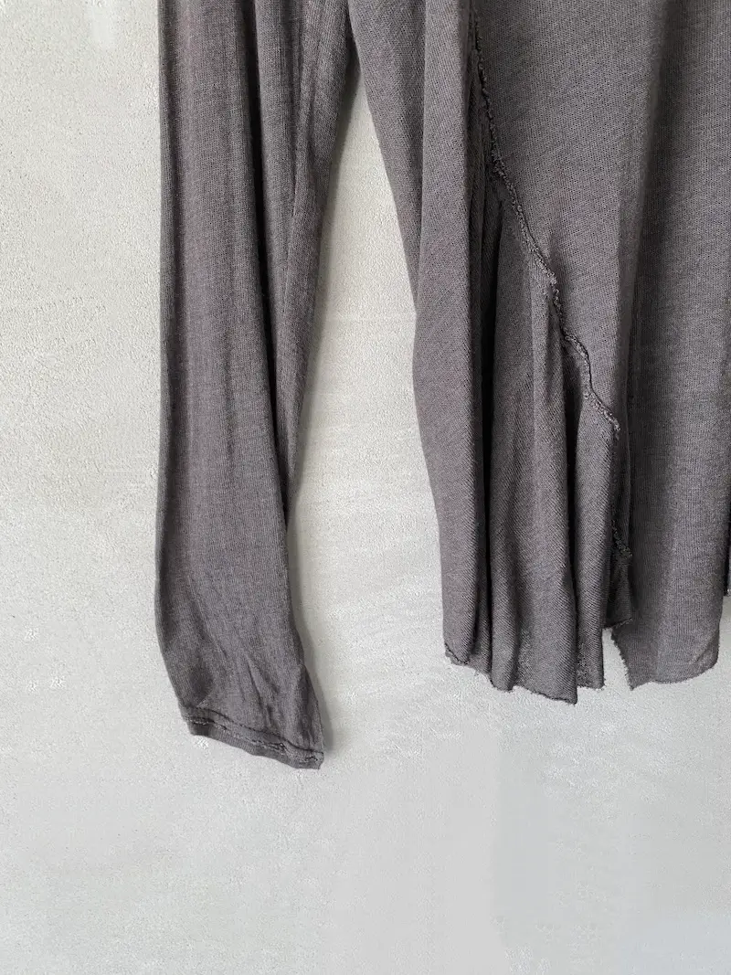 Long asymmetrical jersey fabric T-shirt with gathered pattern on right side and long sleeves, U-neck, raw cut hem trim, two lengths. Size 38 measurements: length 84 cm.