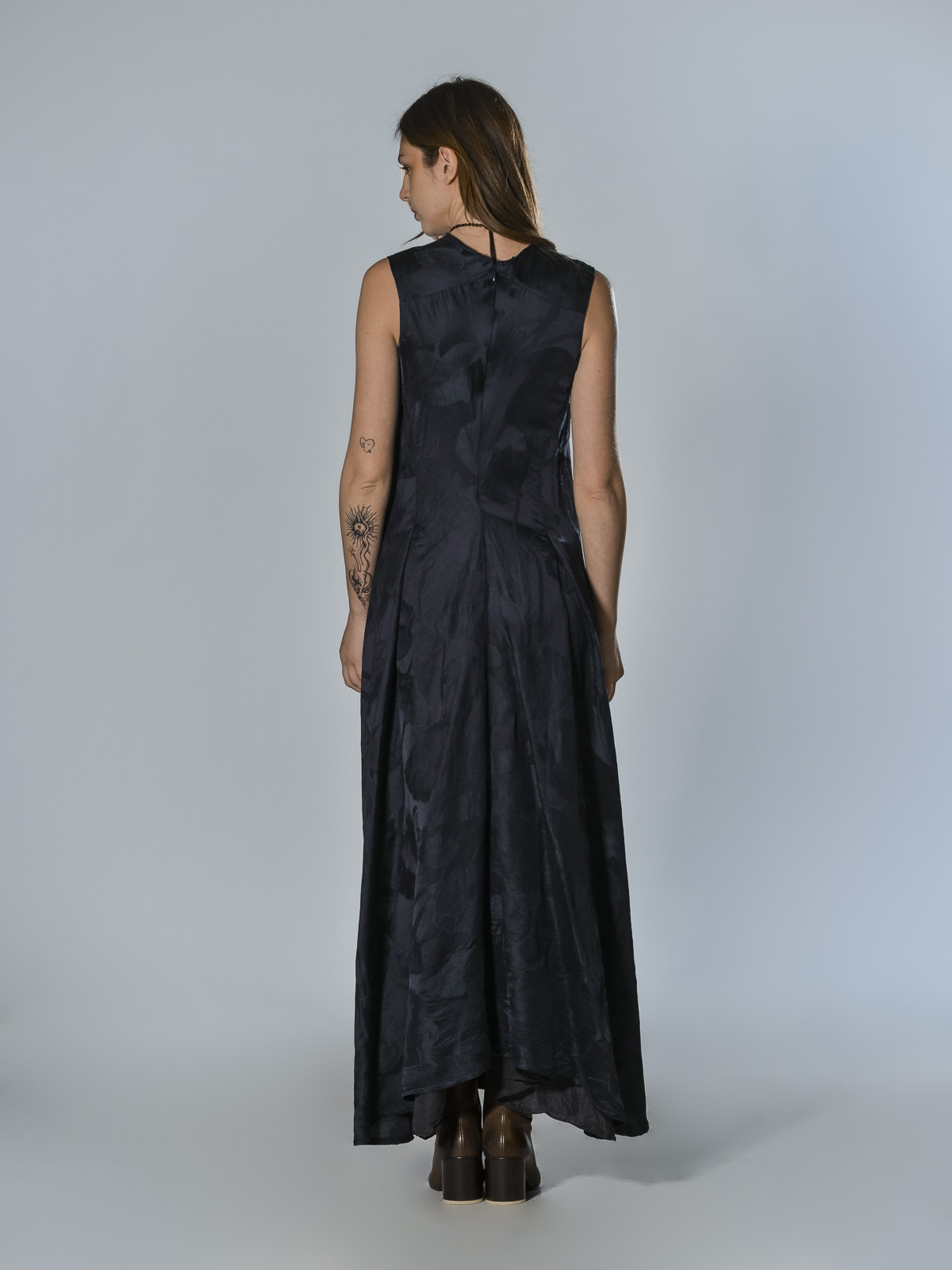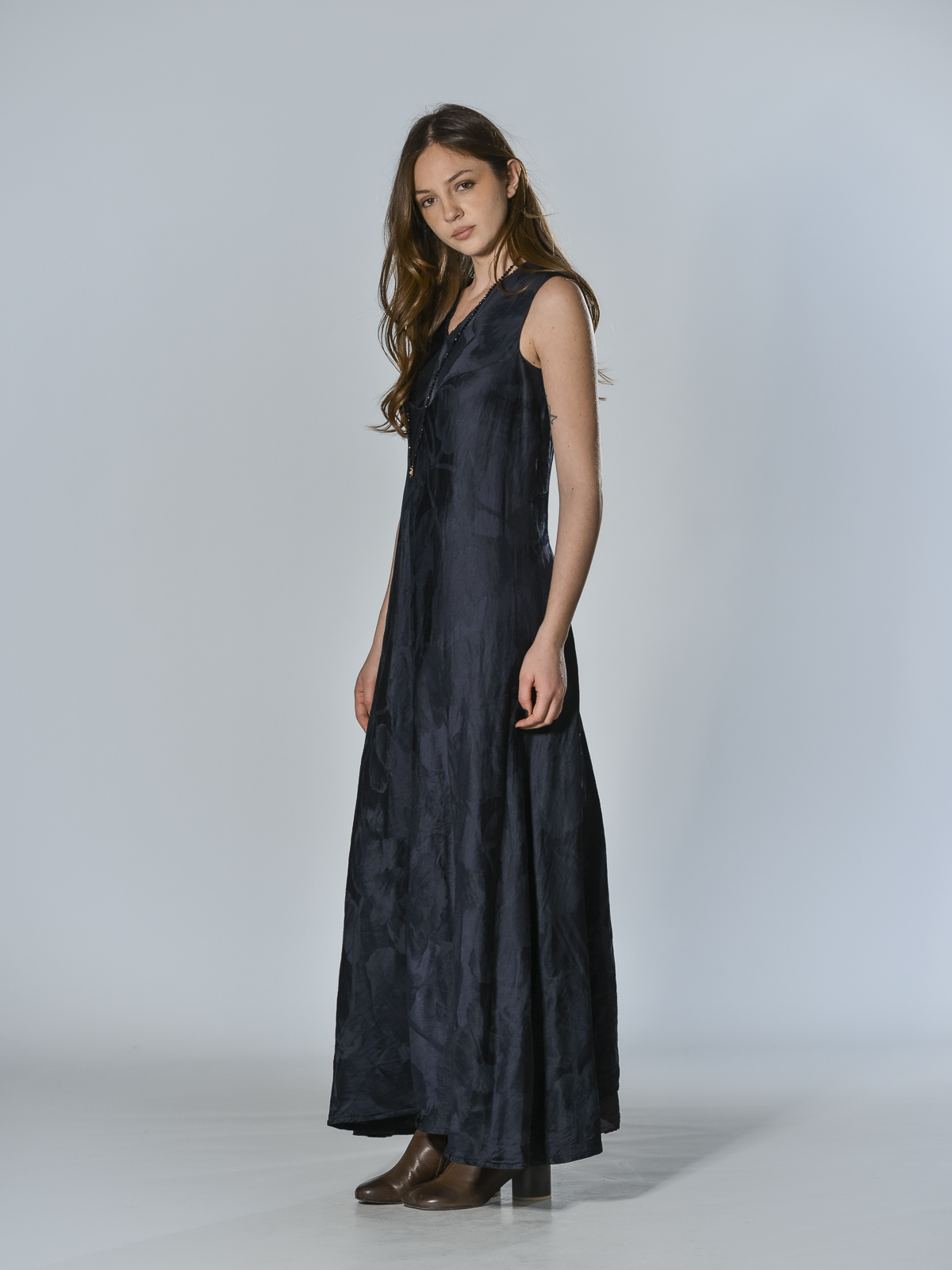 Long linen and viscose dress with a floral motif. It features a V-neck, sleeveless, and a flowing silhouette. The garment is cut on the bias, allowing the fabric to adapt naturally to the body, following its curves for a soft, flowing fit, flattering the silhouette with a fluid, natural drape. The hem is slightly flared with movement. It closes at the back with an invisible center zip.