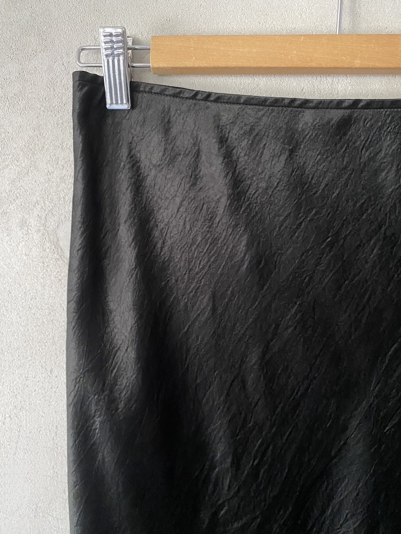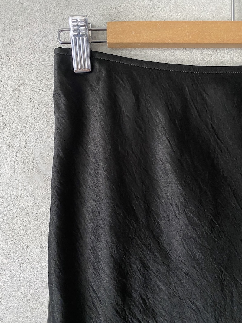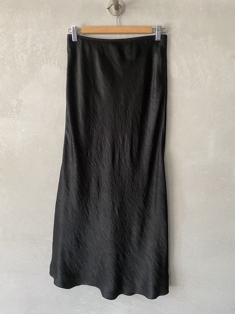 Long bias-cut skirt with elastic waist in slightly wrinkled acetate fabric. The bias cut allows the fabric to fit the body shape perfectly. It is recommended not to iron and let it dry by hanging.