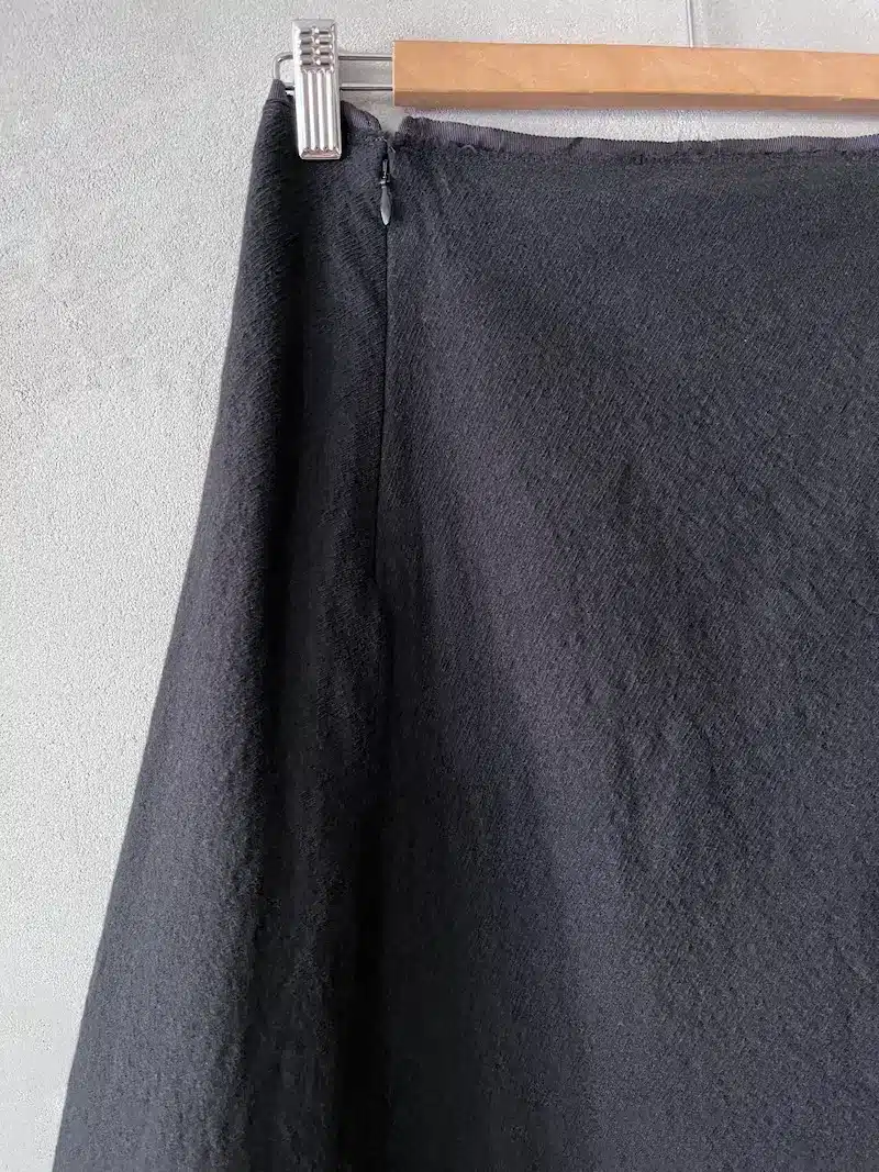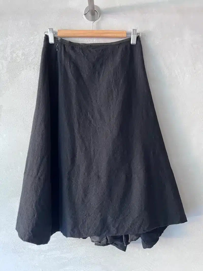 Semi-wheel midi skirt made of gauzy wool fabric, fully lined with silk, high doubled hem, wide wedge pleat to wear in front, back or side, invisible zipper closure, low grosgrain webbing strap. Size 38 measurements: length 65 cm, waist circumference 72 cm. Later size measurements will increase 2 cm in length and 4 cm in circumference.