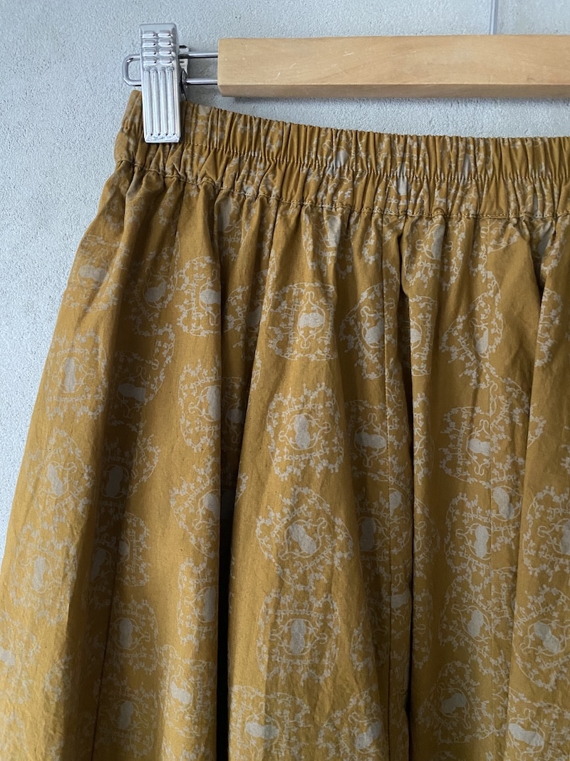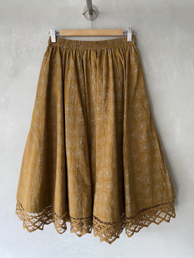Wedge-cut midi skirt in tone-on-tone printed cotton. Full-length with a light gathering at the waist and a soft elastic waistband. Two in-seam side pockets. The hem is finished with a decorative macramé cotton trim that creates a lace effect and subtle movement. Comfortable fit. Made in Japan. Length: 76 cm.