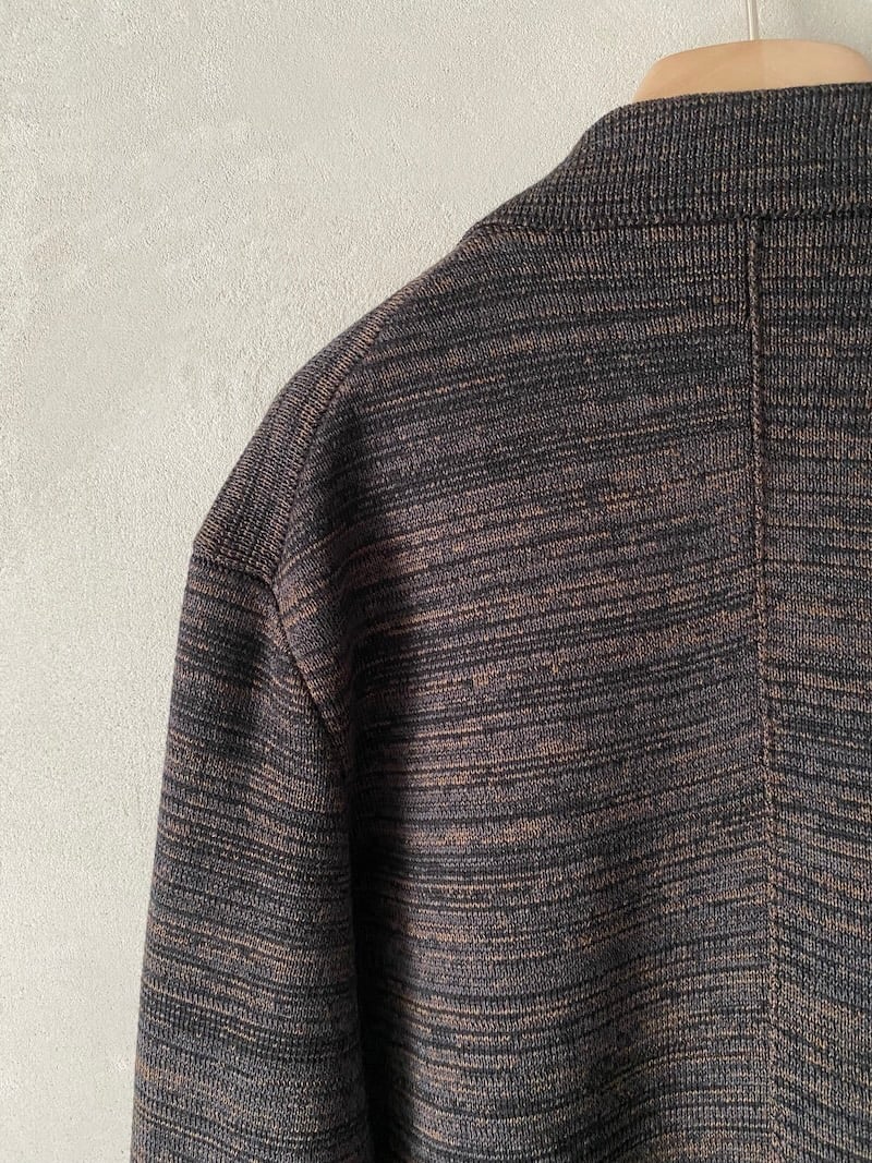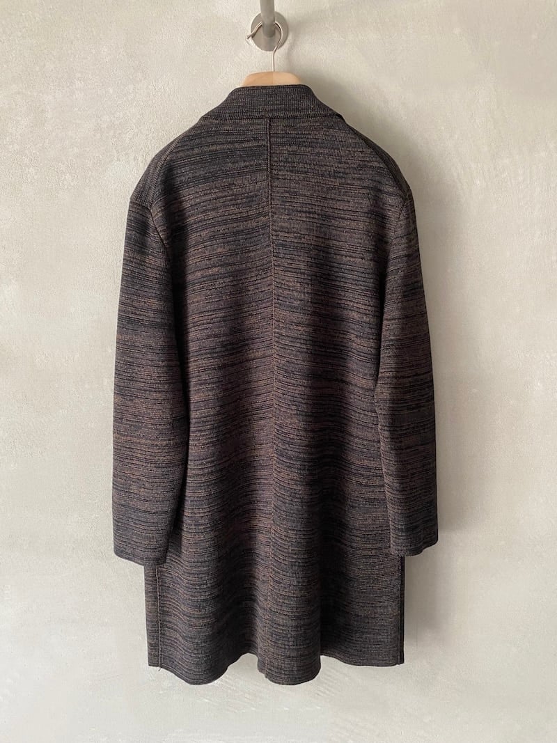 Oversized coat in wool and linen knit fabric with woven stitch work, two side pockets with flap, and classic lapels. Size I measurements: length 92 cm, width 58 cm. Later size measurements will increase by 2 cm in length and 4 cm in circumference.