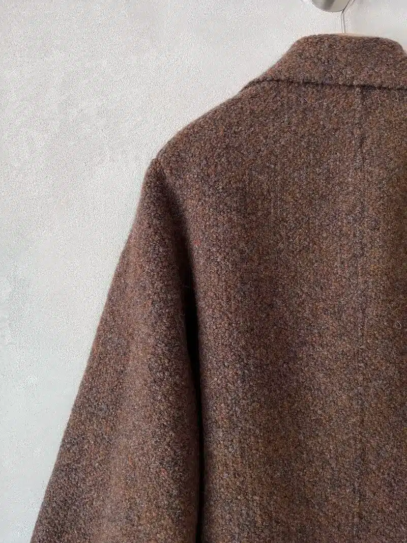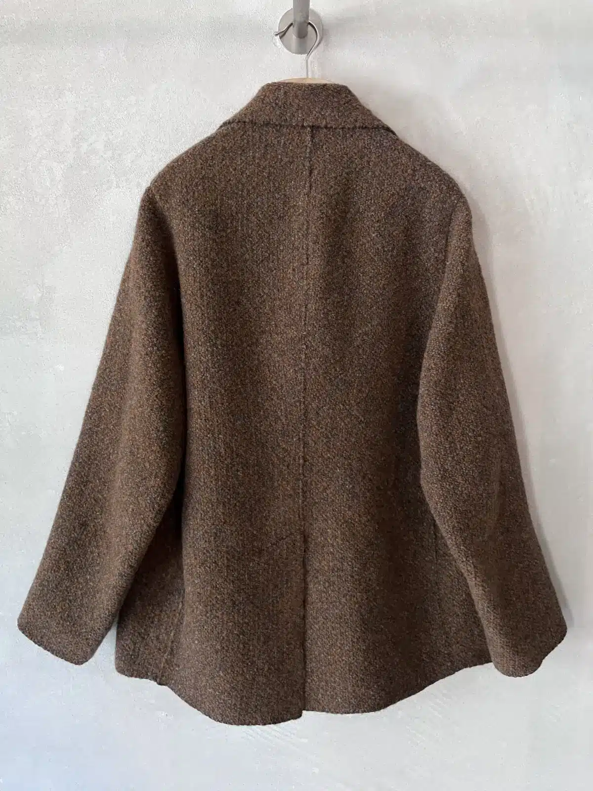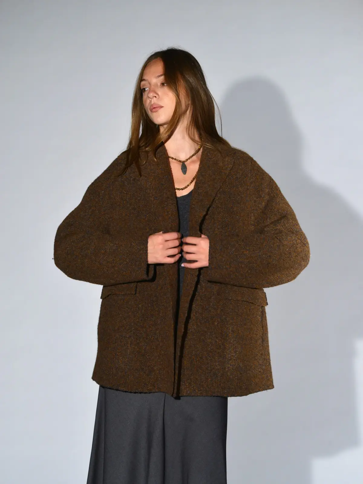 Oversize, medium-weight jacket in mixed yarns and color mix, matte stitch work, wide lapels, two large flap pockets with side opening, wide sleeve turn. Size XS measurements: length 72 cm, width 56 cm. Later size measurements will increase 2 cm in length and 4 cm in circumference.