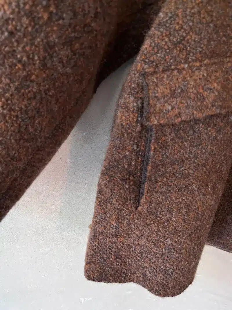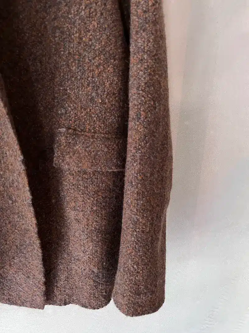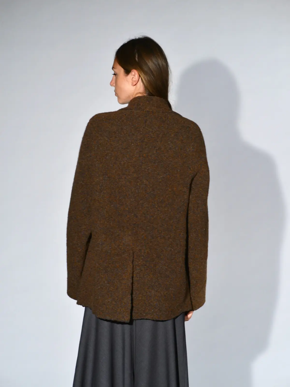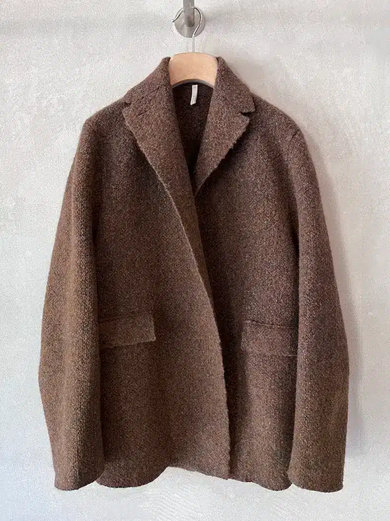 Oversize, medium-weight jacket in mixed yarns and color mix, matte stitch work, wide lapels, two large flap pockets with side opening, wide sleeve turn. Size XS measurements: length 72 cm, width 56 cm. Later size measurements will increase 2 cm in length and 4 cm in circumference.