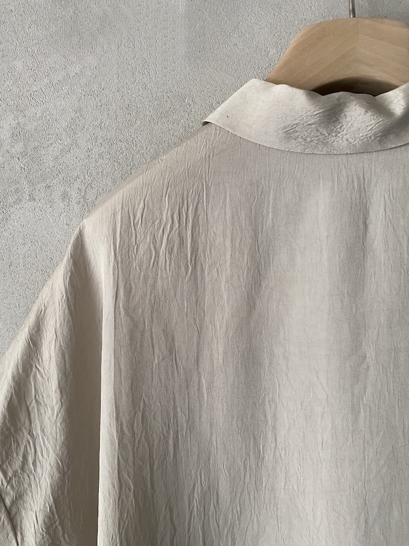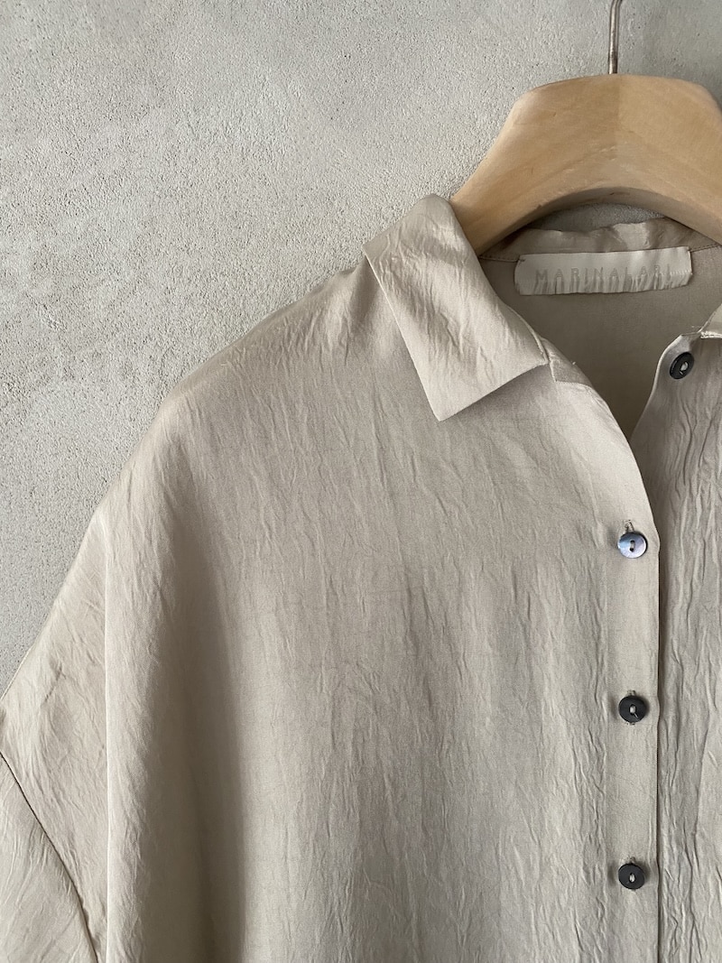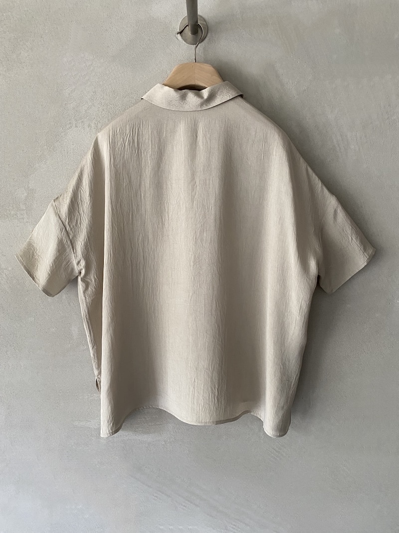 Oversized shirt in fabric with a slightly creased finish. Classic collar, front fastening with seven mother-of-pearl buttons. Wide short sleeves with dropped shoulders. Side slits. Oversized fit.