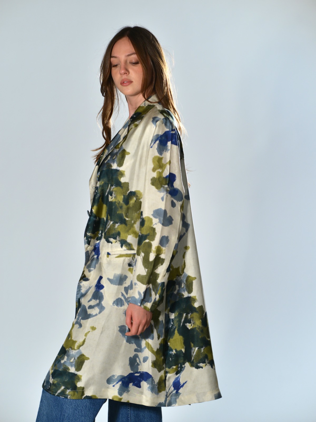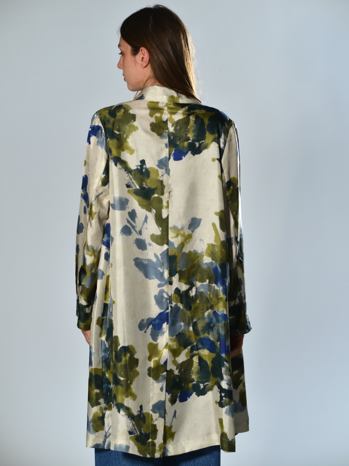 Oversized duster coat in printed silk. Center front closure with four covered buttons. Featuring two horizontal welt pockets, long sleeves, and a center back vent. Oversized fit.