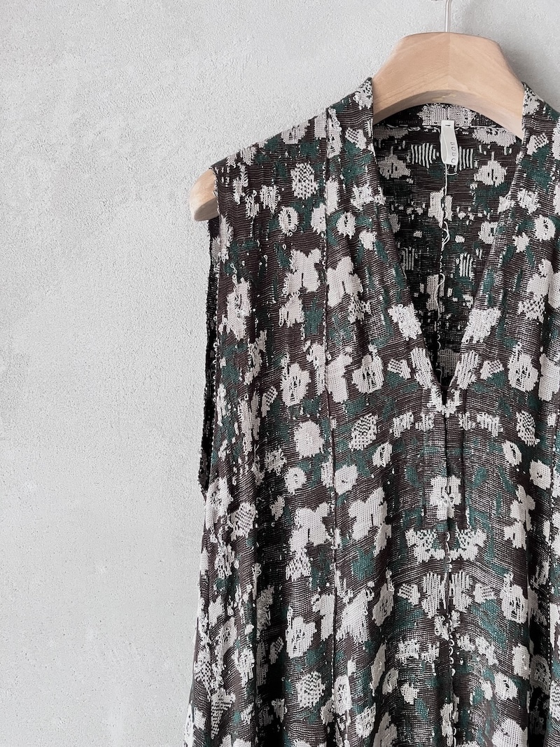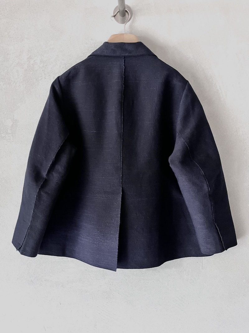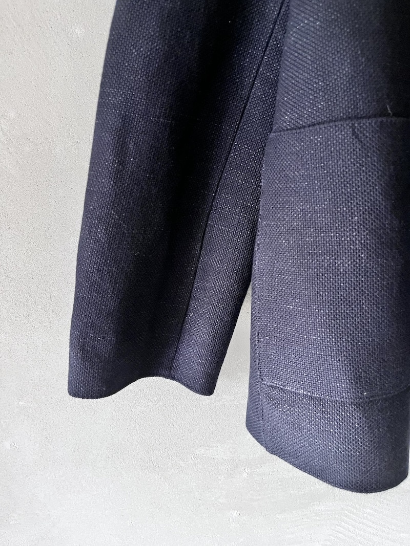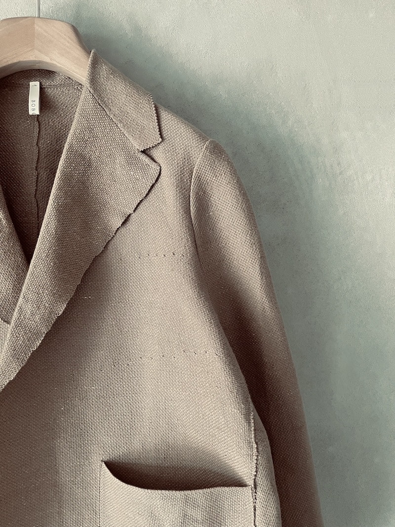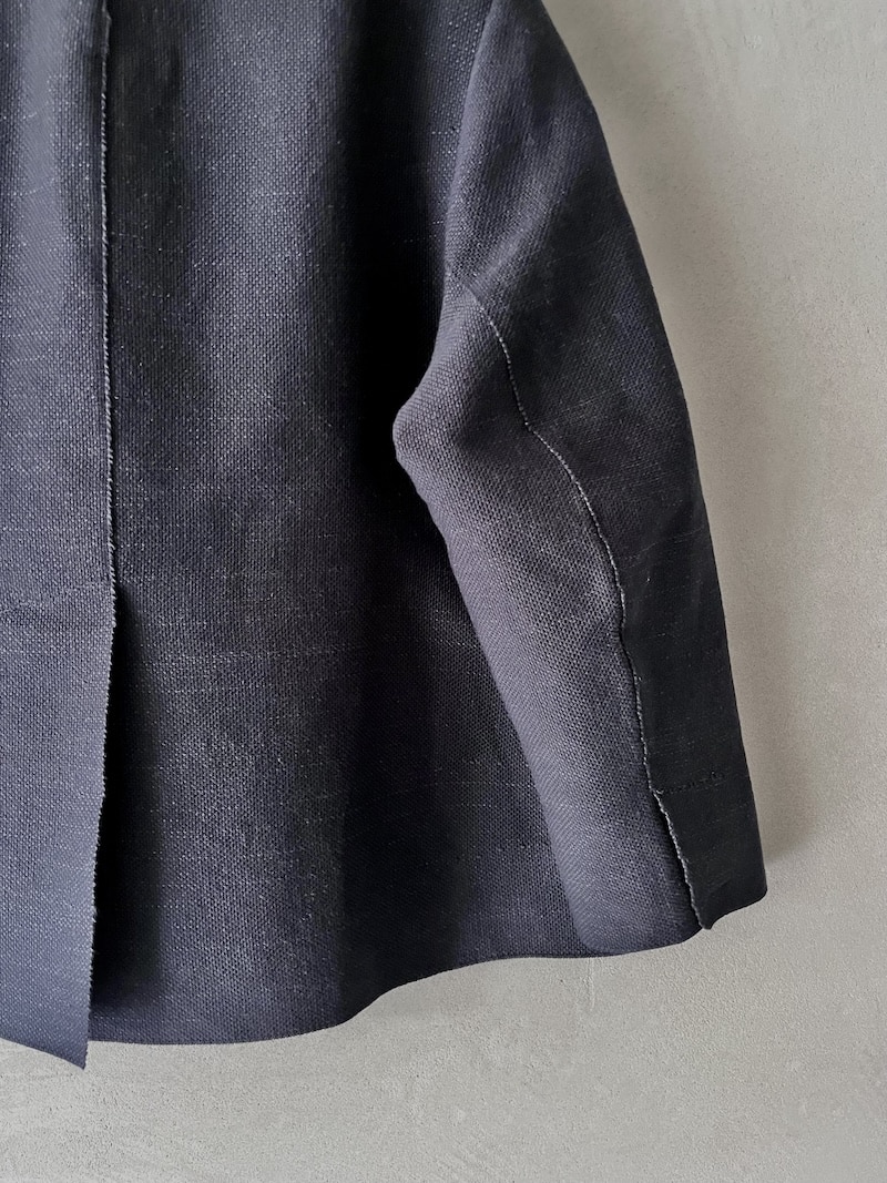 Oversized jacket in cotton, linen, and silk knit with a woven effect, crafted on knitting machines without traditional cuts or assembly. Each piece is constructed directly during the process, using knitting techniques that shape the volume in a natural and structured way.