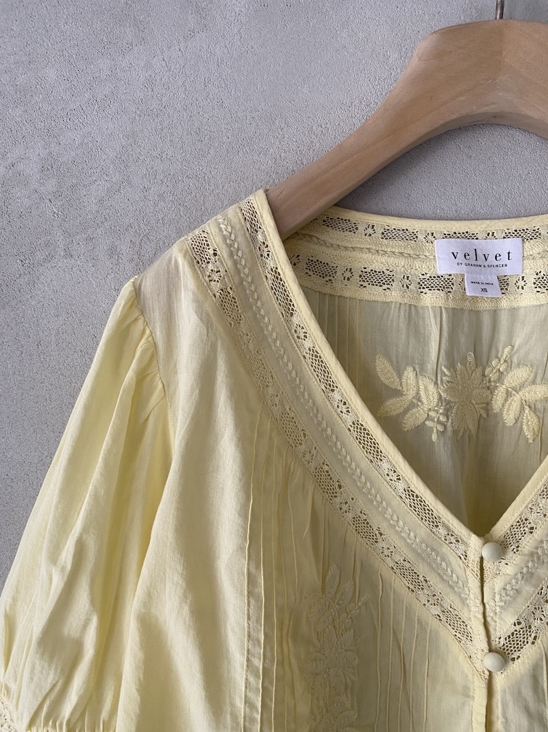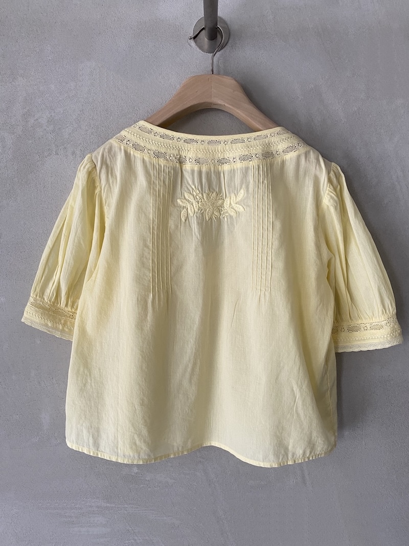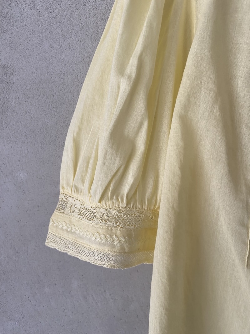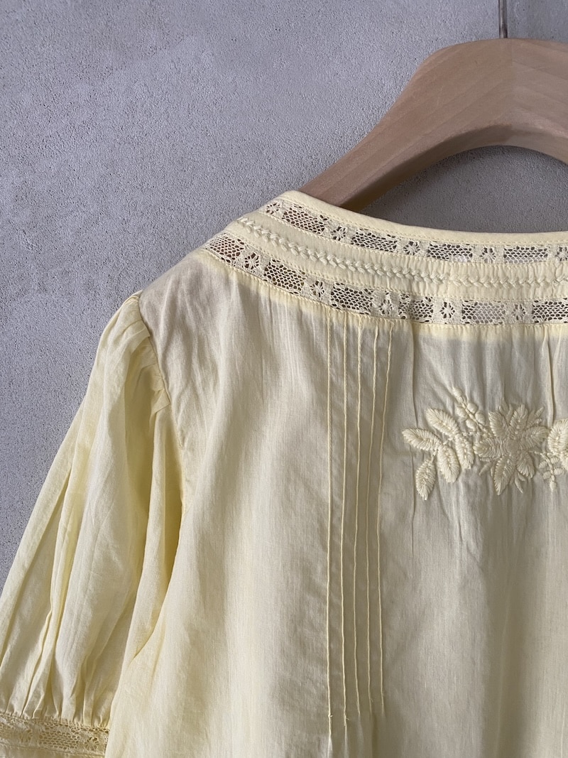 Oversized cotton muslin shirt. Deep V-neckline finished with lace inserts. Front closure with covered buttons. Vertical pleats at the front and floral embroidery appliqués. Short sleeves with light gathers at the shoulder and a lace-inset band at the cuffs. Slightly flared silhouette with a relaxed fit. Straight hem with a simple finish.
