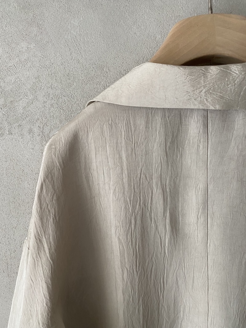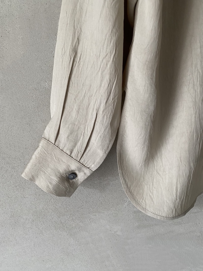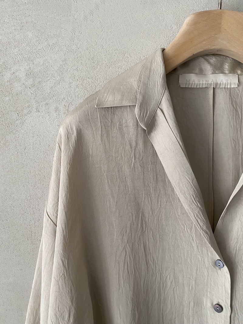 Oversized shirt in fabric with a slightly creased finish. Open collar with a deep V-neck, five-button front closure, dropped shoulders, and rounded hem at the sides. Oversize fit.