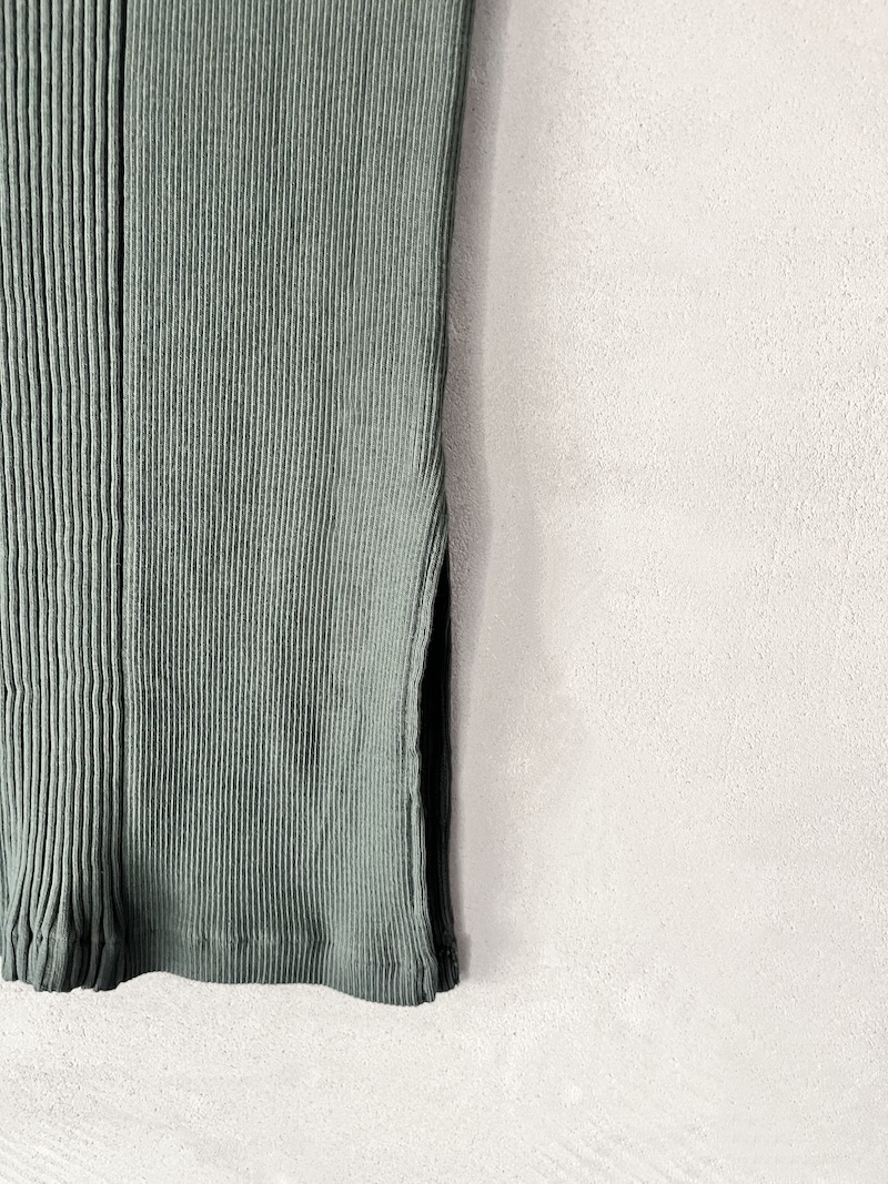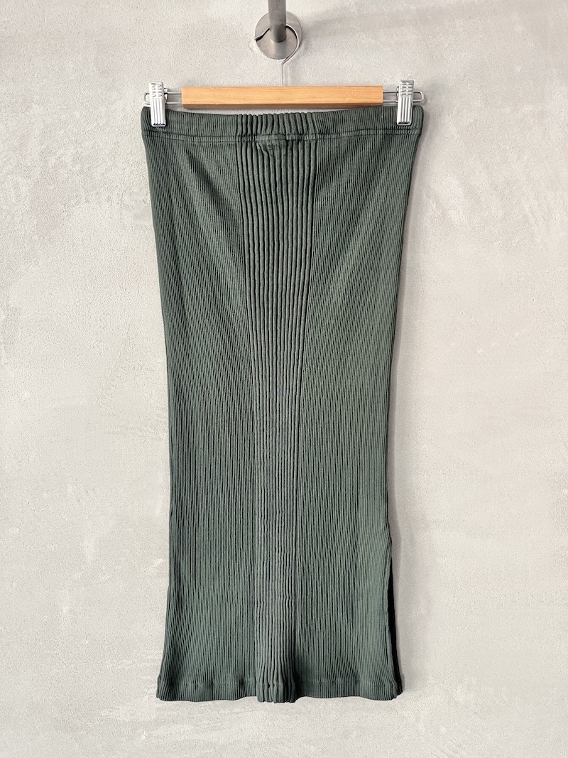 Straight skirt in ribbed cotton jersey. Featuring an elastic waistband with an adjustable drawstring, a fitted silhouette with slim volume, a midi length, and a straight hem with a side slit. Tight fit. The width is not definable as the ribbed knit adapts to the body, expanding and contracting according to the fit.