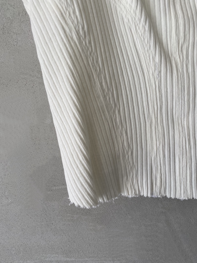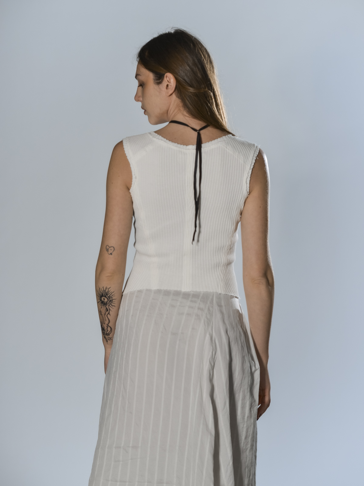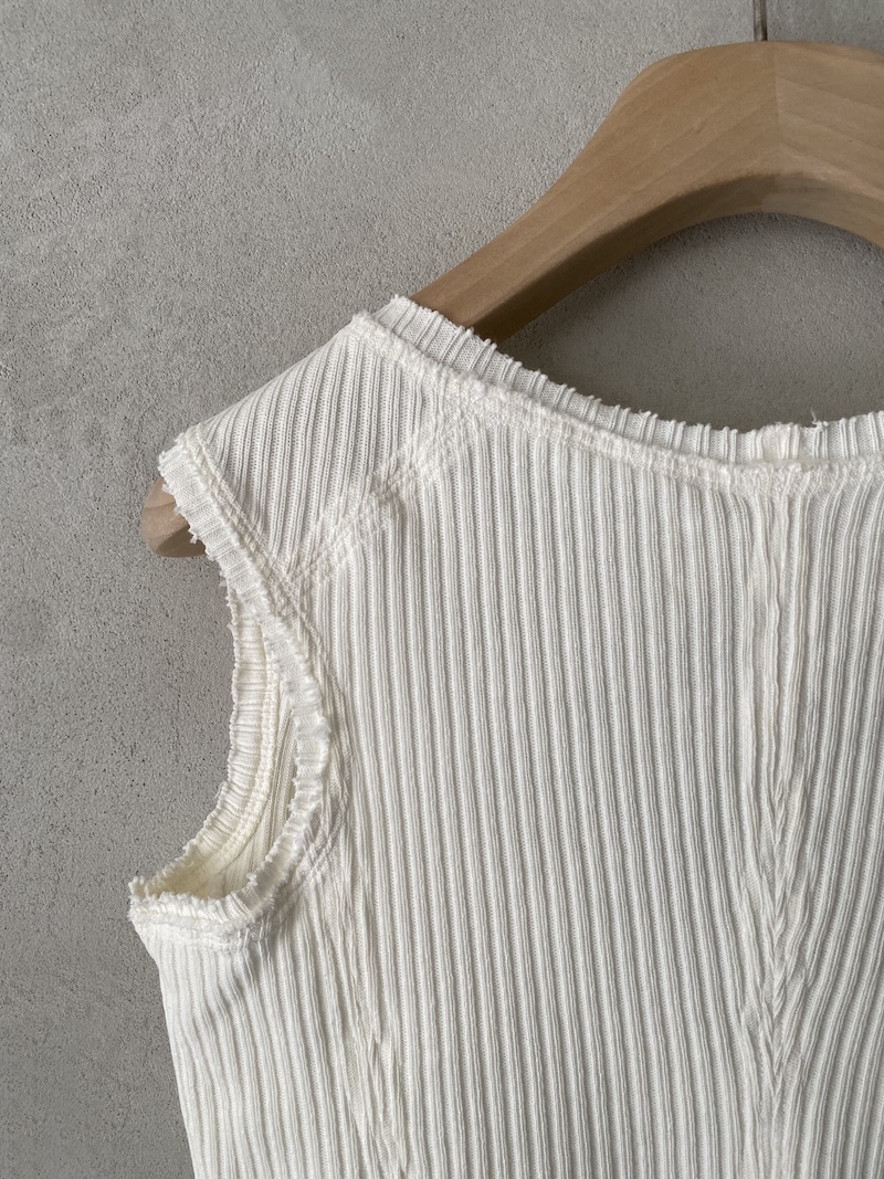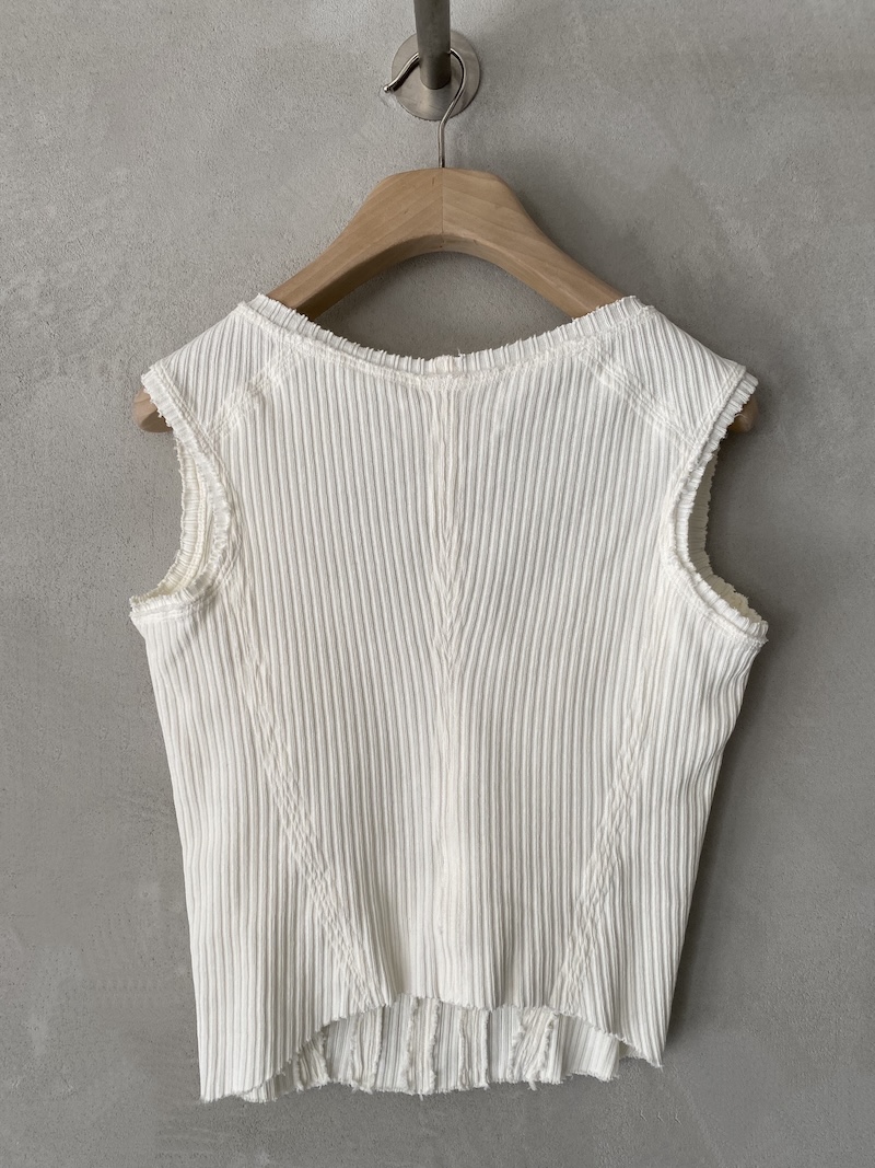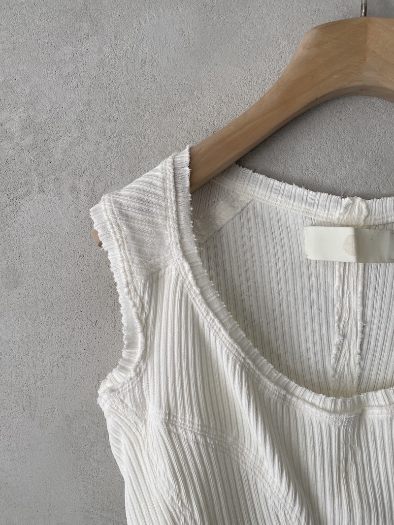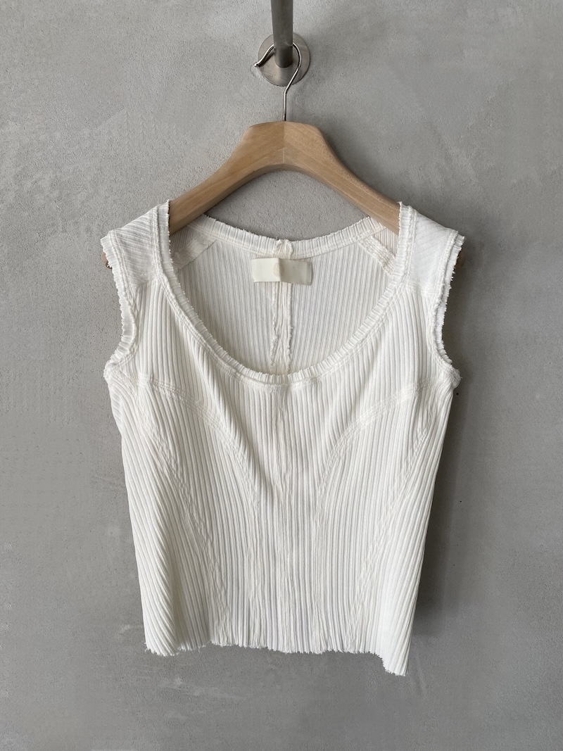 Ribbed cotton top. Featuring a wide, rounded neckline and sleeveless design. The visible, decorative seams define the garment and enhance the bust, naturally following the body’s contours. Raw-cut edges at the neckline and armholes create a slightly frayed effect. Raw-cut hem. The fabric’s natural stretch provides a snug fit.