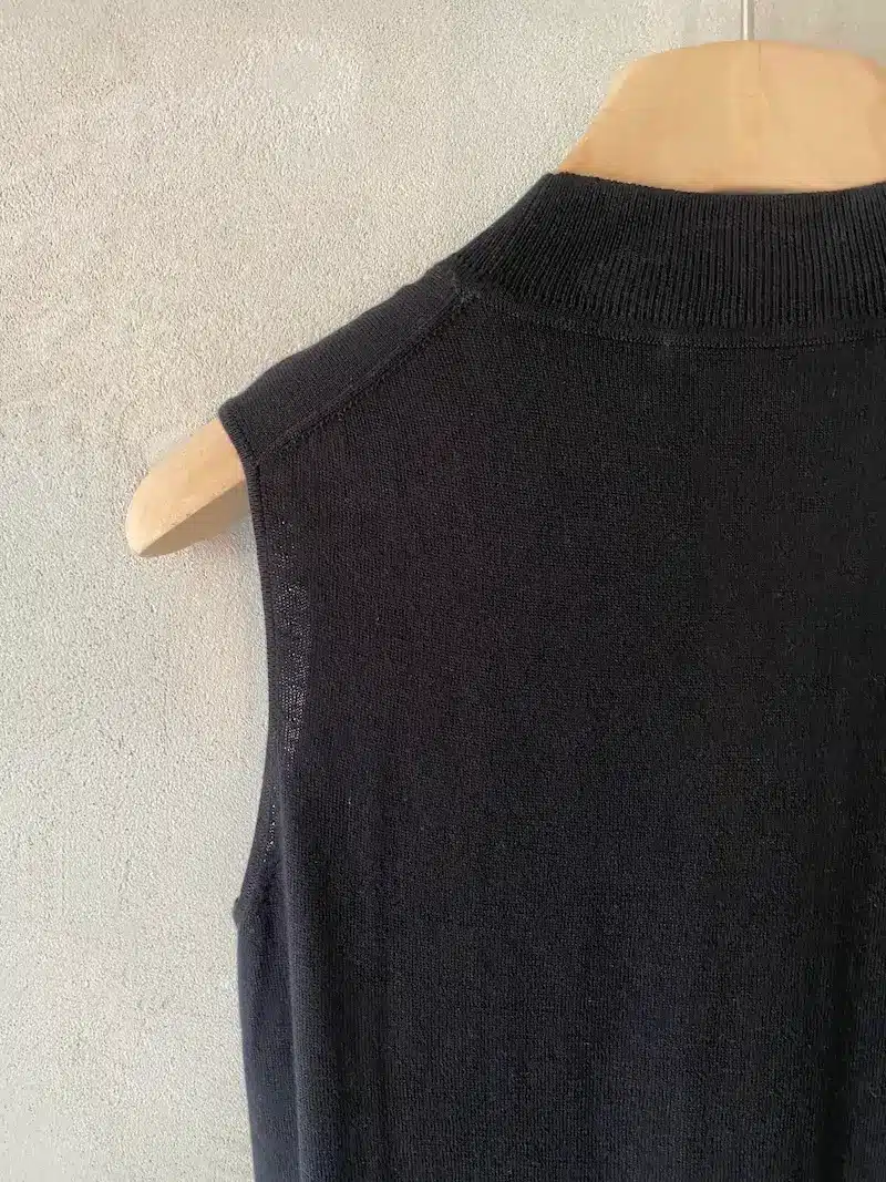 Silk and cotton ribbed knit top, sleeveless, wide shoulder and round neckline. Measurements size 40: length 63 cm. Later size measurements will increase 2 cm in length and 4 cm in circumference.