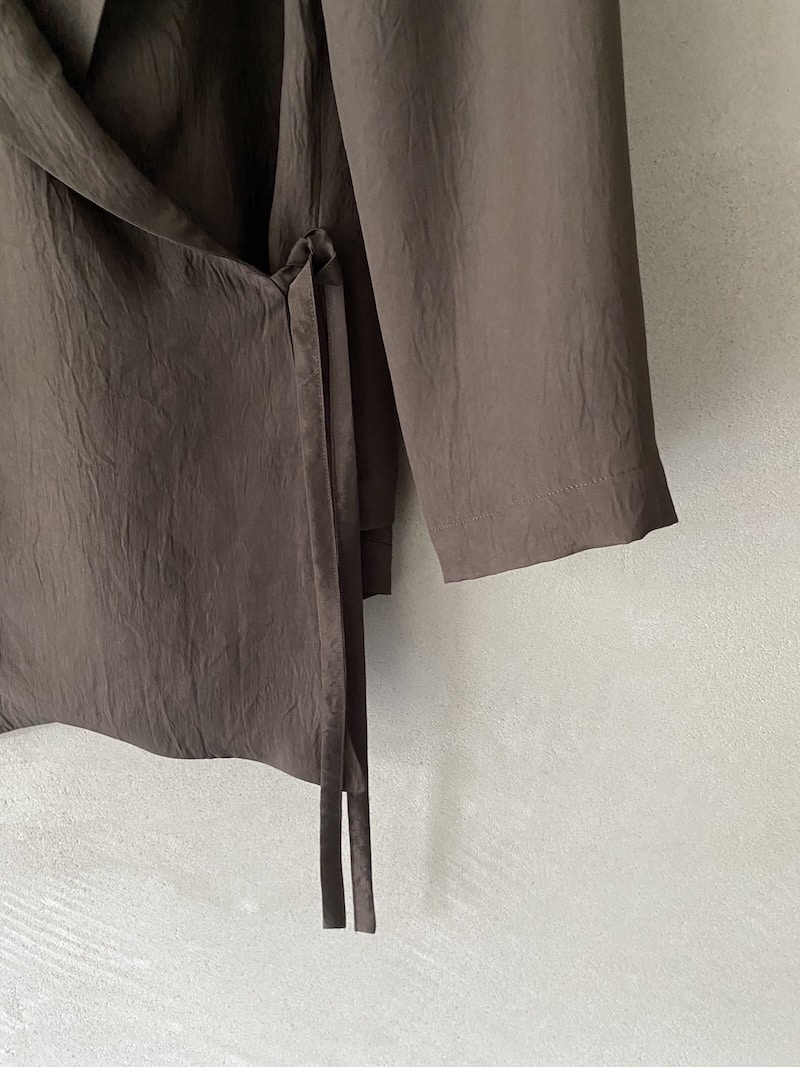 Wrap-over jacket in fabric with a slightly creased finish. Wide lapels and side closure with an adjustable internal drawstring. Relaxed fit with an asymmetrical hem. Three-quarter sleeves with wide cuffs. Regular fit.