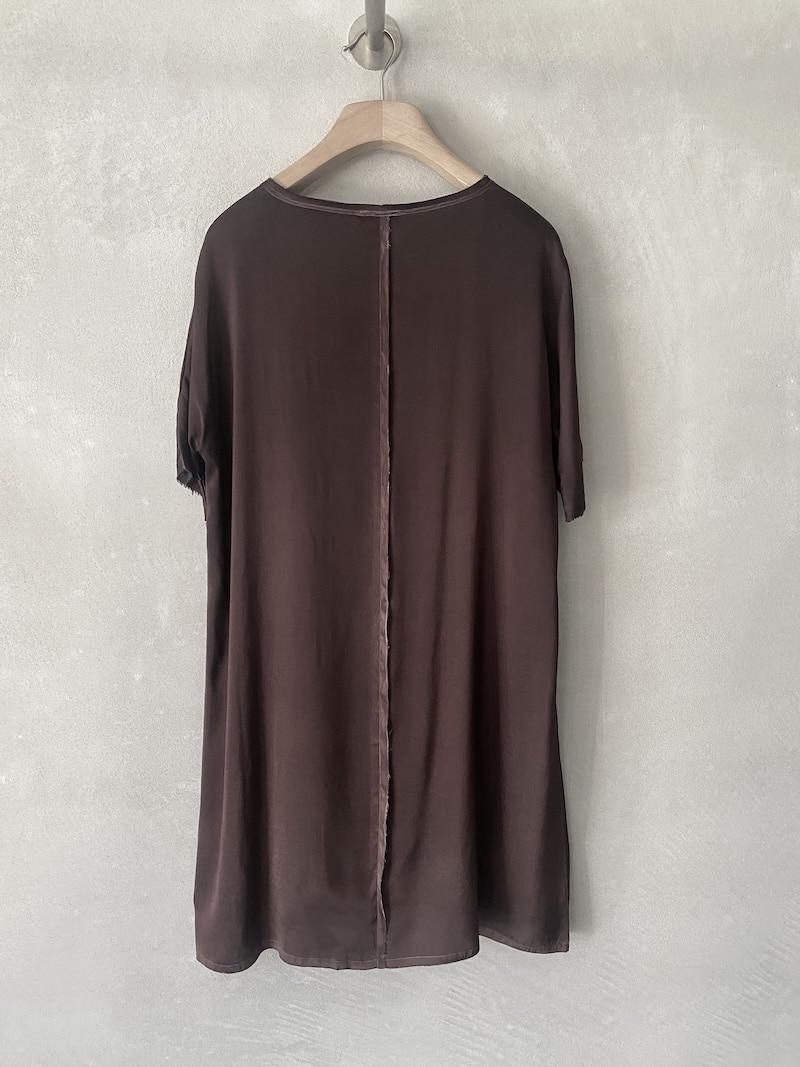 Oversized dress in stretch silk satin, completely hand-sprayed. V-neck and 3/4 sleeves, raw-edge seams and trims. Oversize fit.