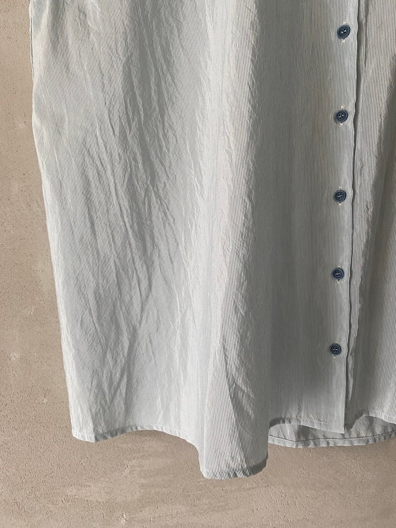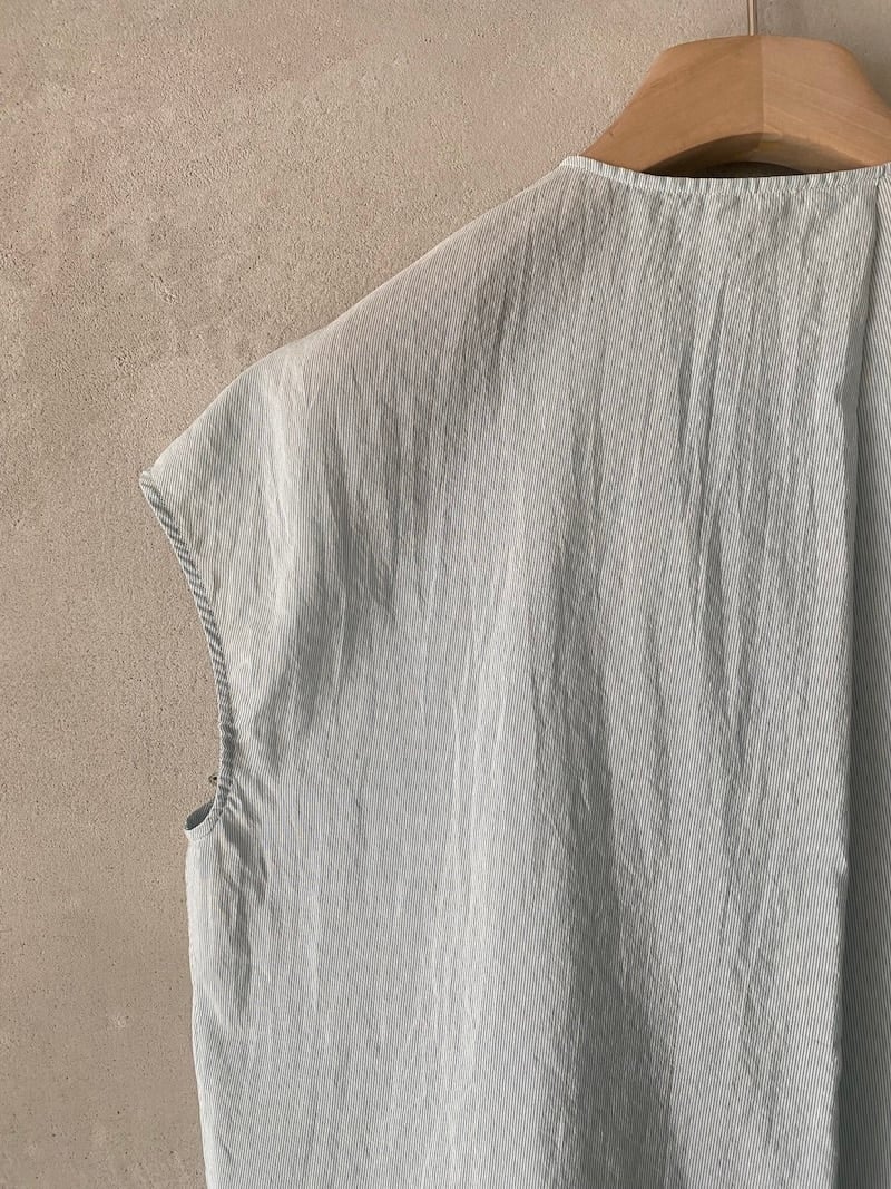 Sleeveless boxy pattern shirt made of cotton-silk cloth micro-striped design, central 9-button closure, round neckline, dropped shoulder. Size XS measurements: length 64 cm, width 59 cm. Later size measurements will increase 2 cm in length and 4 cm in circumference.