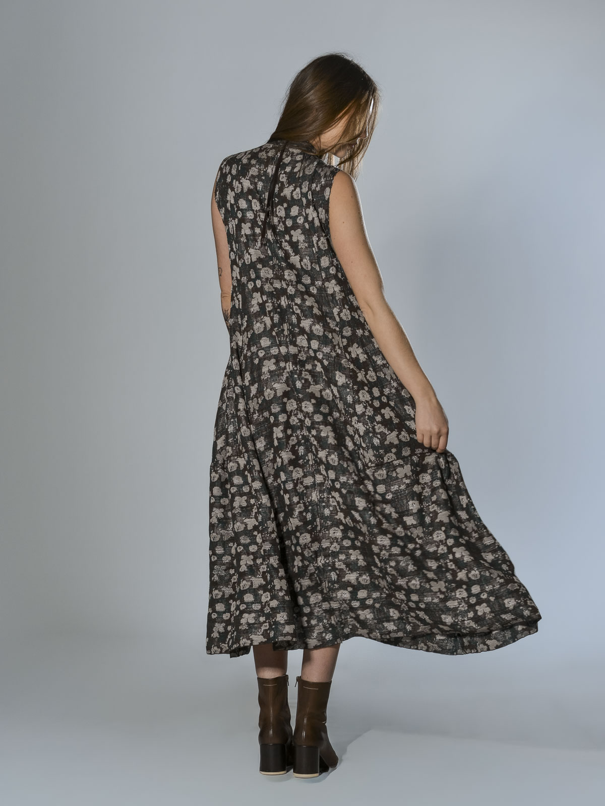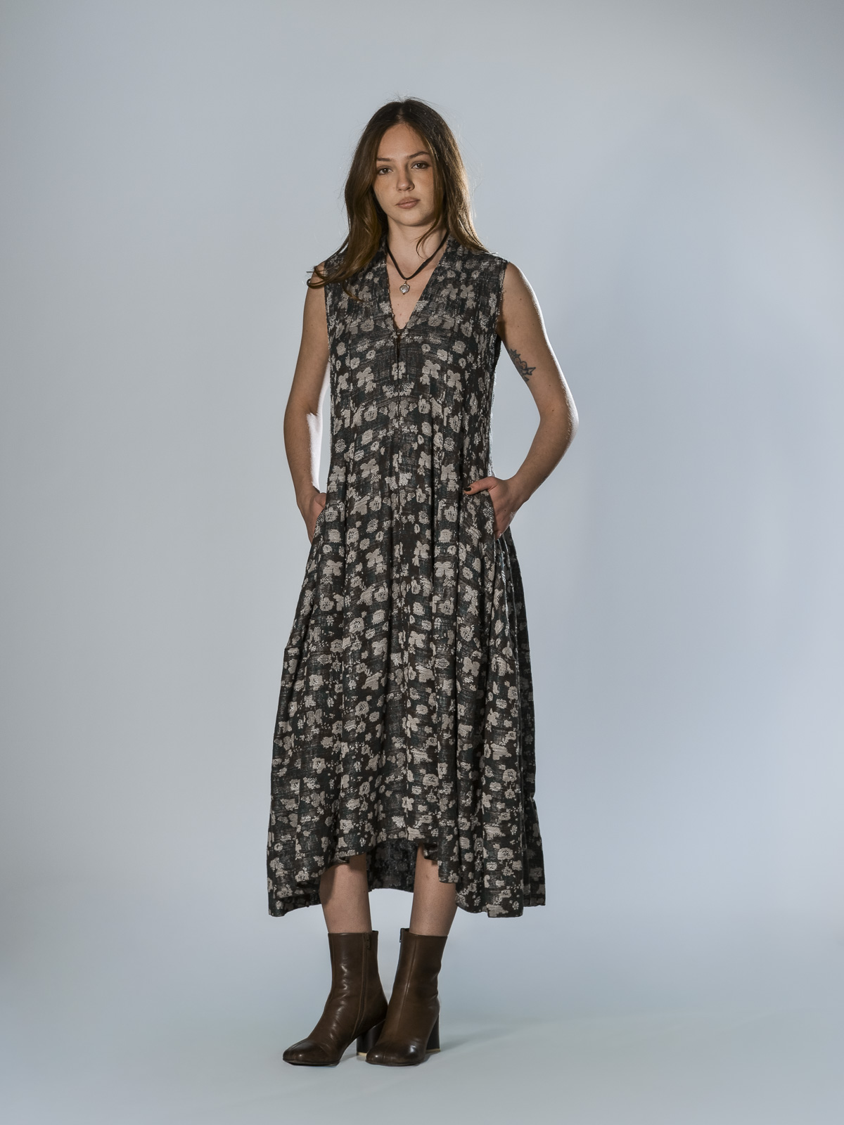 The surface features a delicate floral jacquard motif integrated into the workmanship. The clean and simple bodice features a deep V-neckline closed by two hidden buttons. The line follows the bust and then opens into a full, rounded skirt with two inset side pockets. A highly crafted dress, where technique and form meet in a sophisticated balance between craftsmanship and contemporary research.