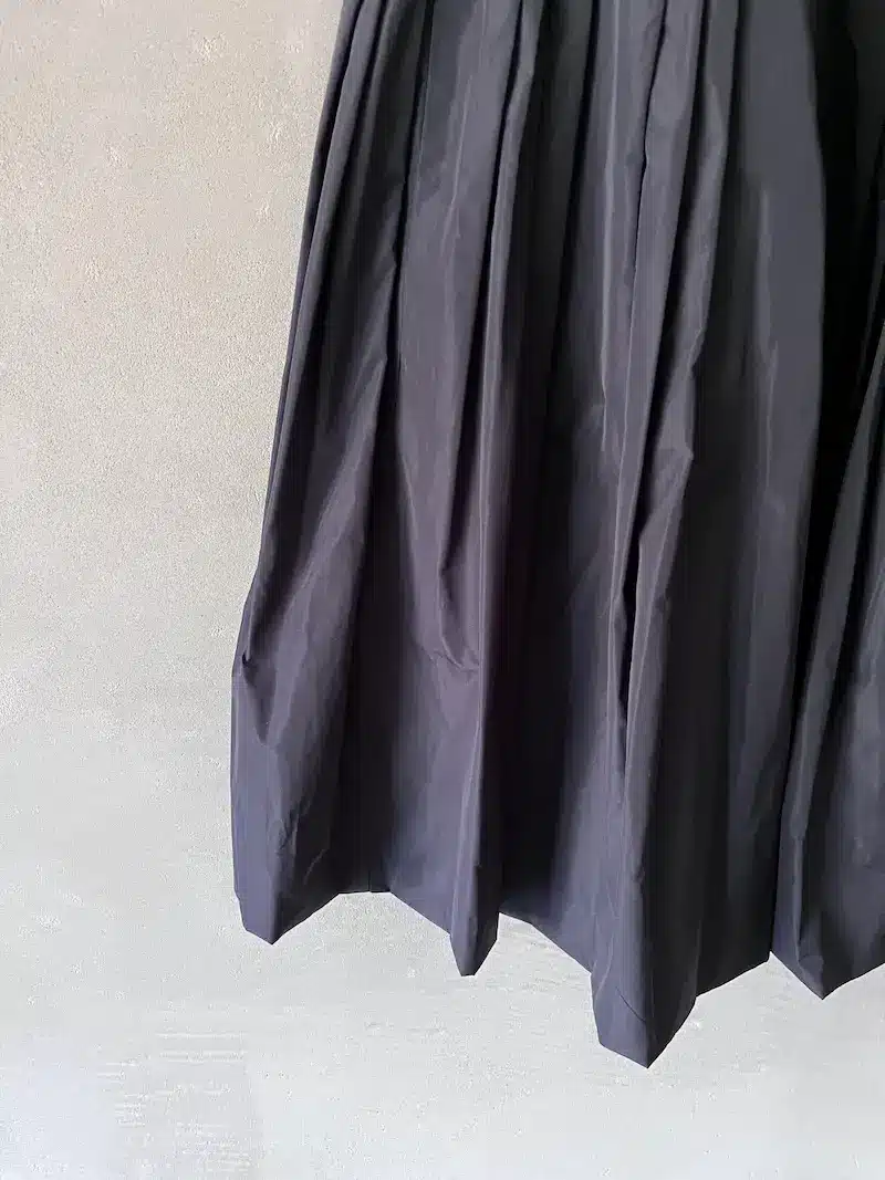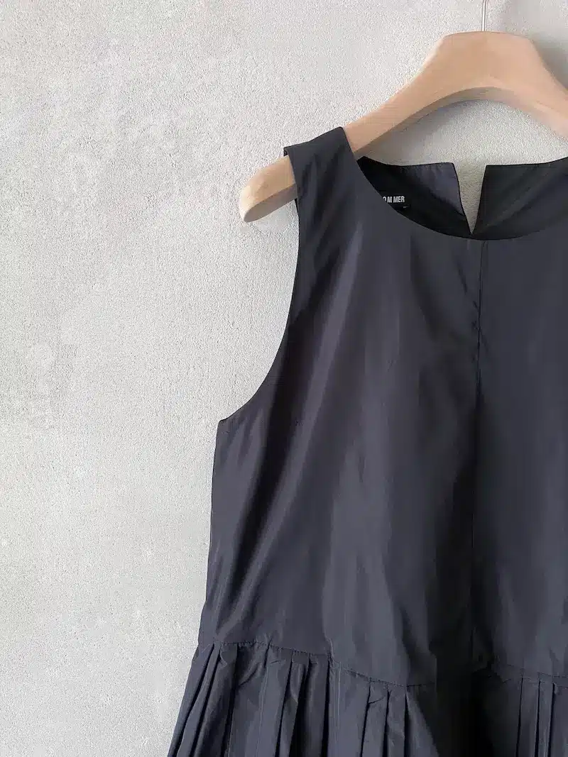 Sleeveless oversize dress fully doubled with tulle fabric, wide round neckline, dropped waist cut, wide skirt constructed with small flat pleats, and two vertical pockets in seam. Size 36 measurements: length 104 cm, chest circumference 94 cm, waist circumference 104 cm. Later size measurements will increase 2 cm in length and 4 cm in circumference.