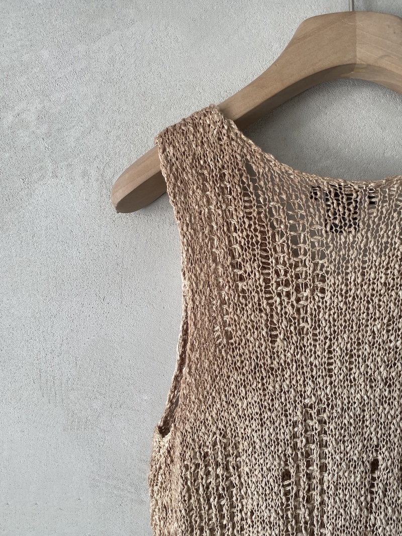 Sleeveless cotton sweater featuring weave irregularities, hand-painted. V-neck. Regular fit. It adapts to the shape of the body, stretching and contracting.