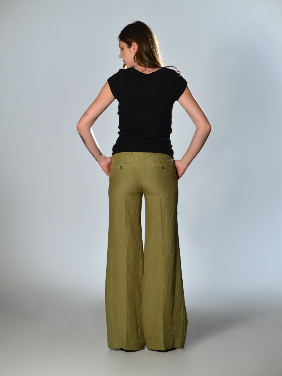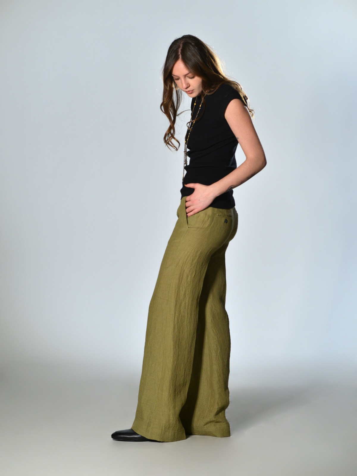 Straight-leg trousers with a slightly flared hem. Low-rise waistband with belt loops and a single button closure. Button and front zip fly. Two slanted side pockets and two back welt pockets with buttonholes.