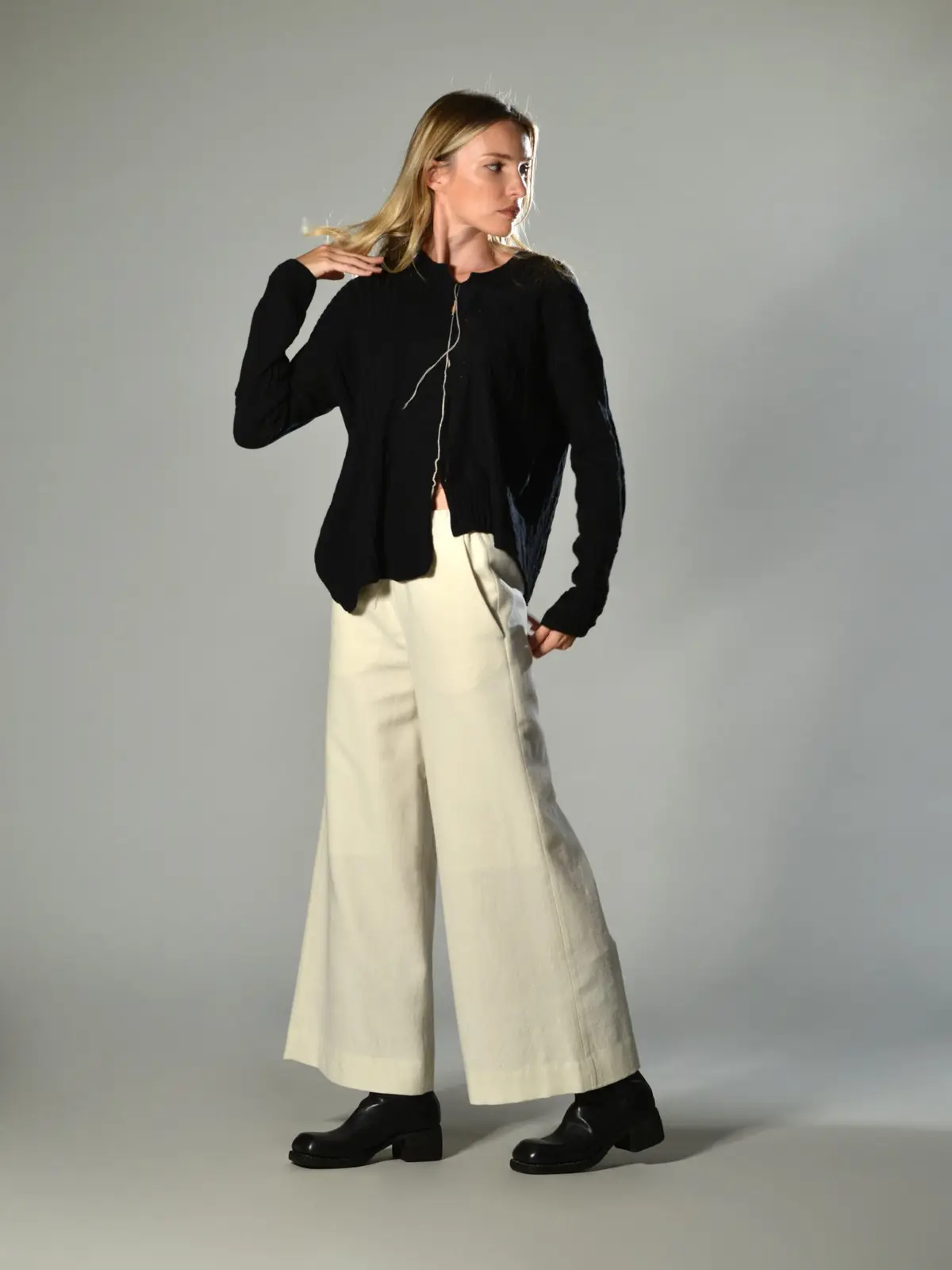 Two-tone merino wool oversize sweater with asymmetrical inlays and workings, deep U-neck, dropped shoulder, long sleeves. Size I measurements: length 53/59, width 70 cm. The next size measurements will increase by 3 cm in length and 6 cm in circumference.