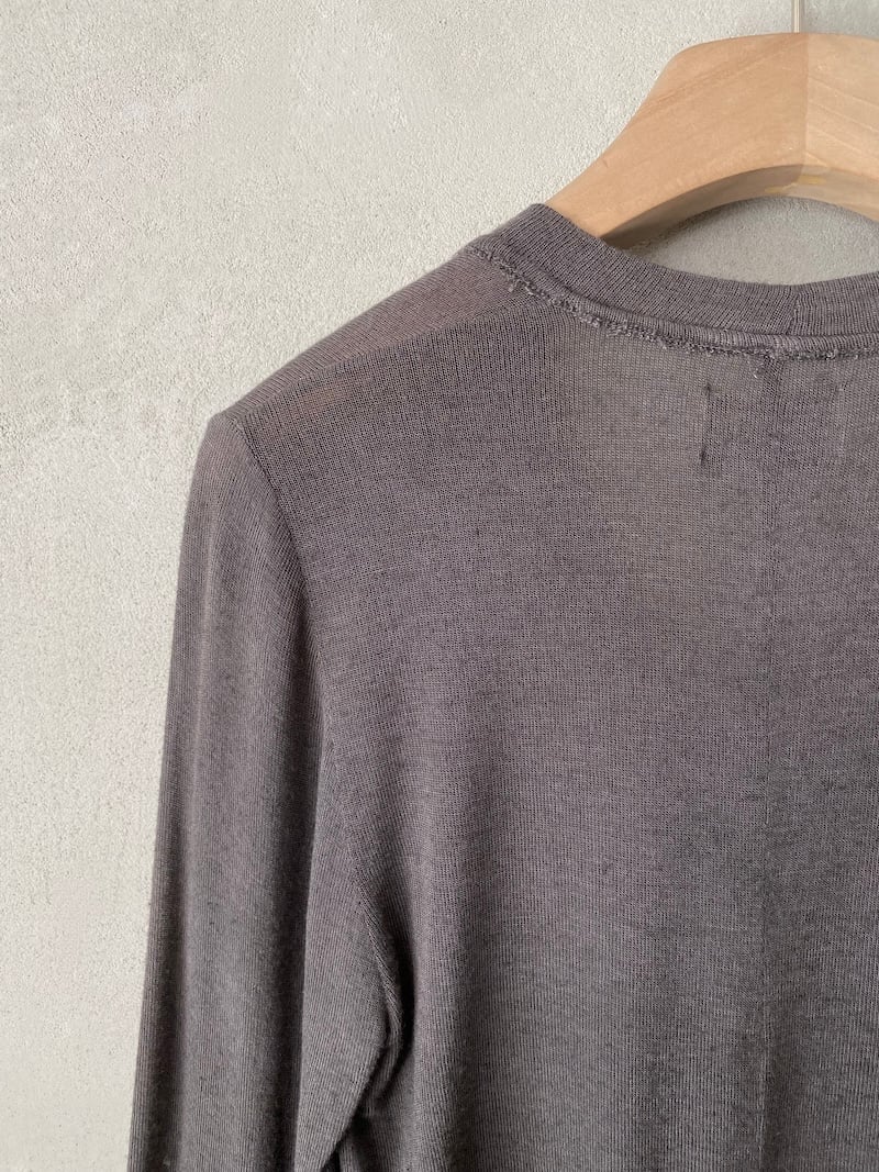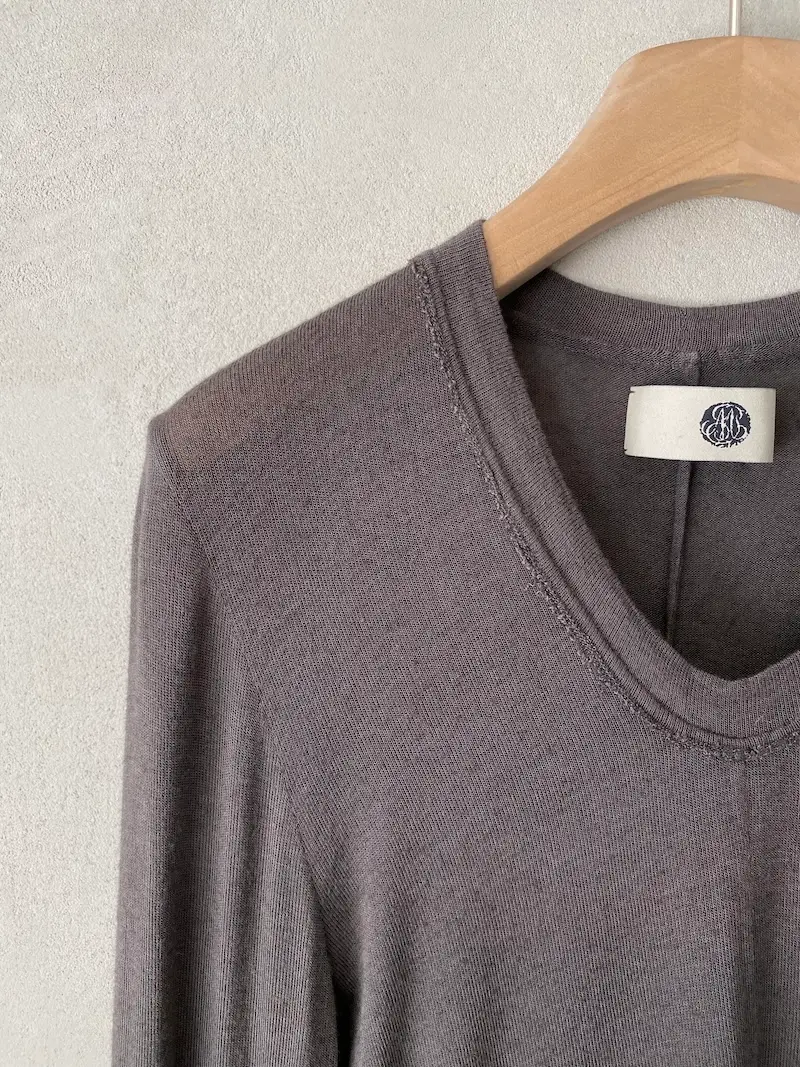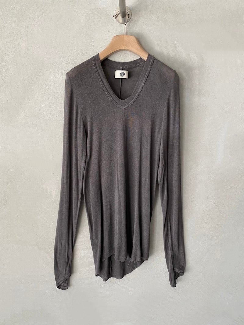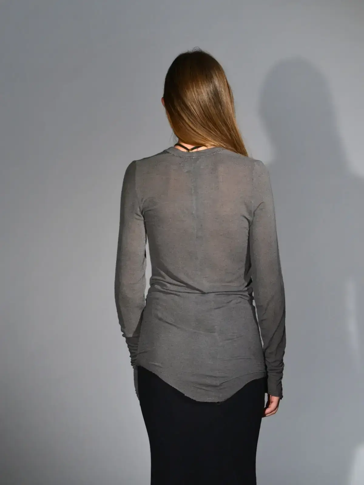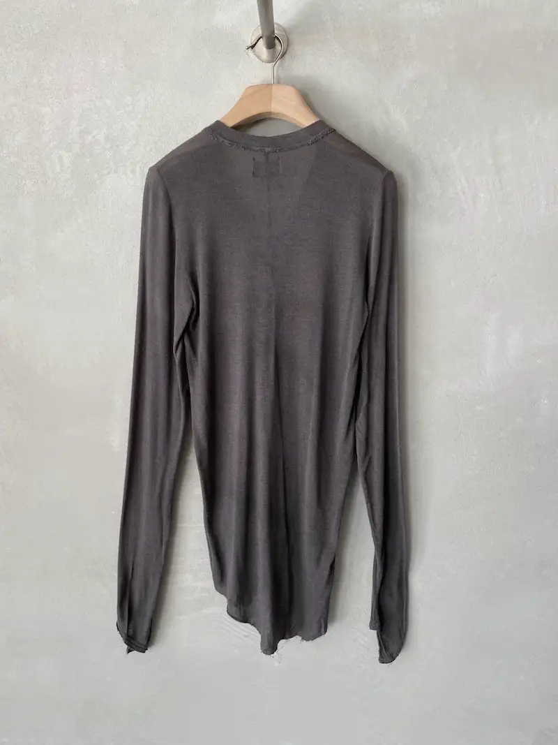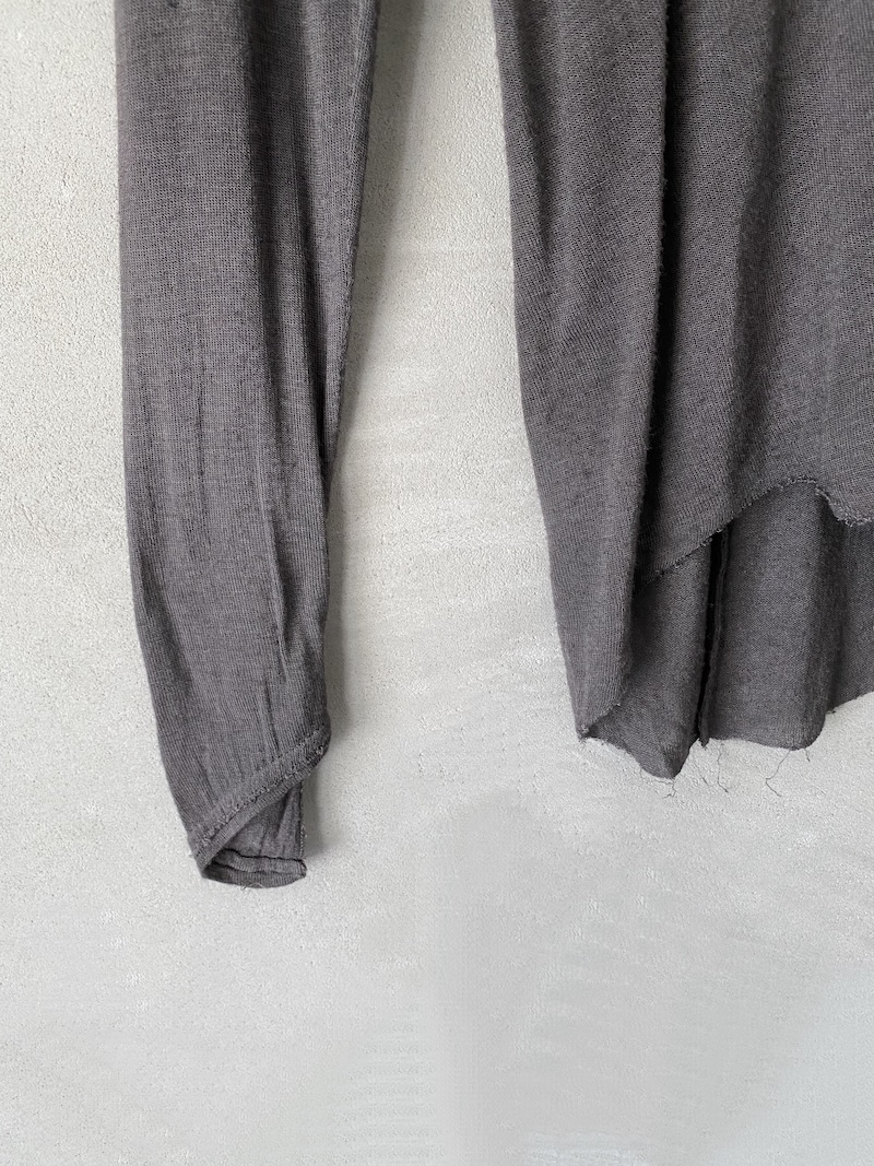 Long T-shirt in jersey fabric with asymmetrical hems and long sleeves, U-neck, raw cut hem trim, two lengths. Size 38 measurements: length 76/84 cm.
