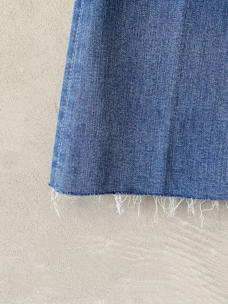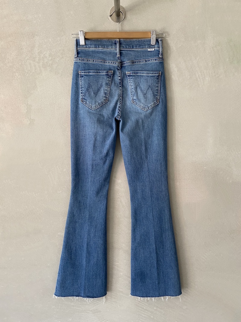 Slim-fit trumpet jeans in stretch cotton denim with a faded wash and a soft feel. Classic five-pocket construction with a front zip and fly closure and a buttoned waistband with belt loops. Slim fit through the thigh with a trumpet opening from the knee to the bottom. Frayed hem and contrasting topstitching. Fitted at the top and loose at the bottom. Total length: 104 cm. American sizes.