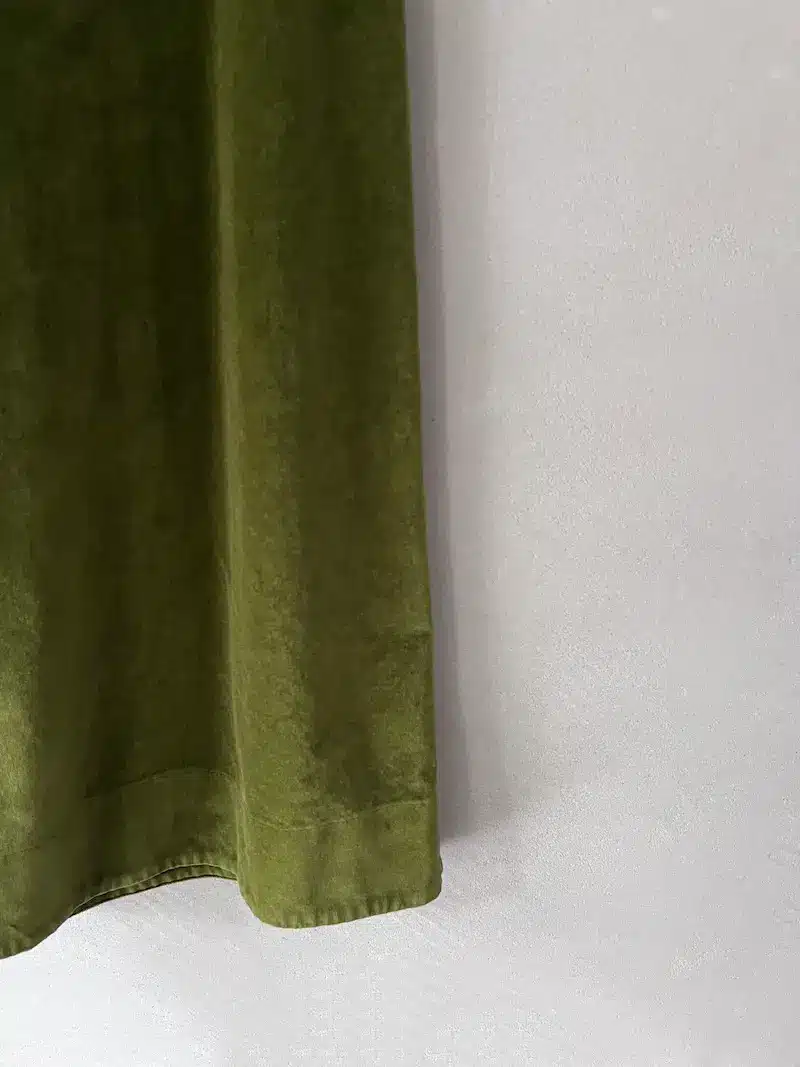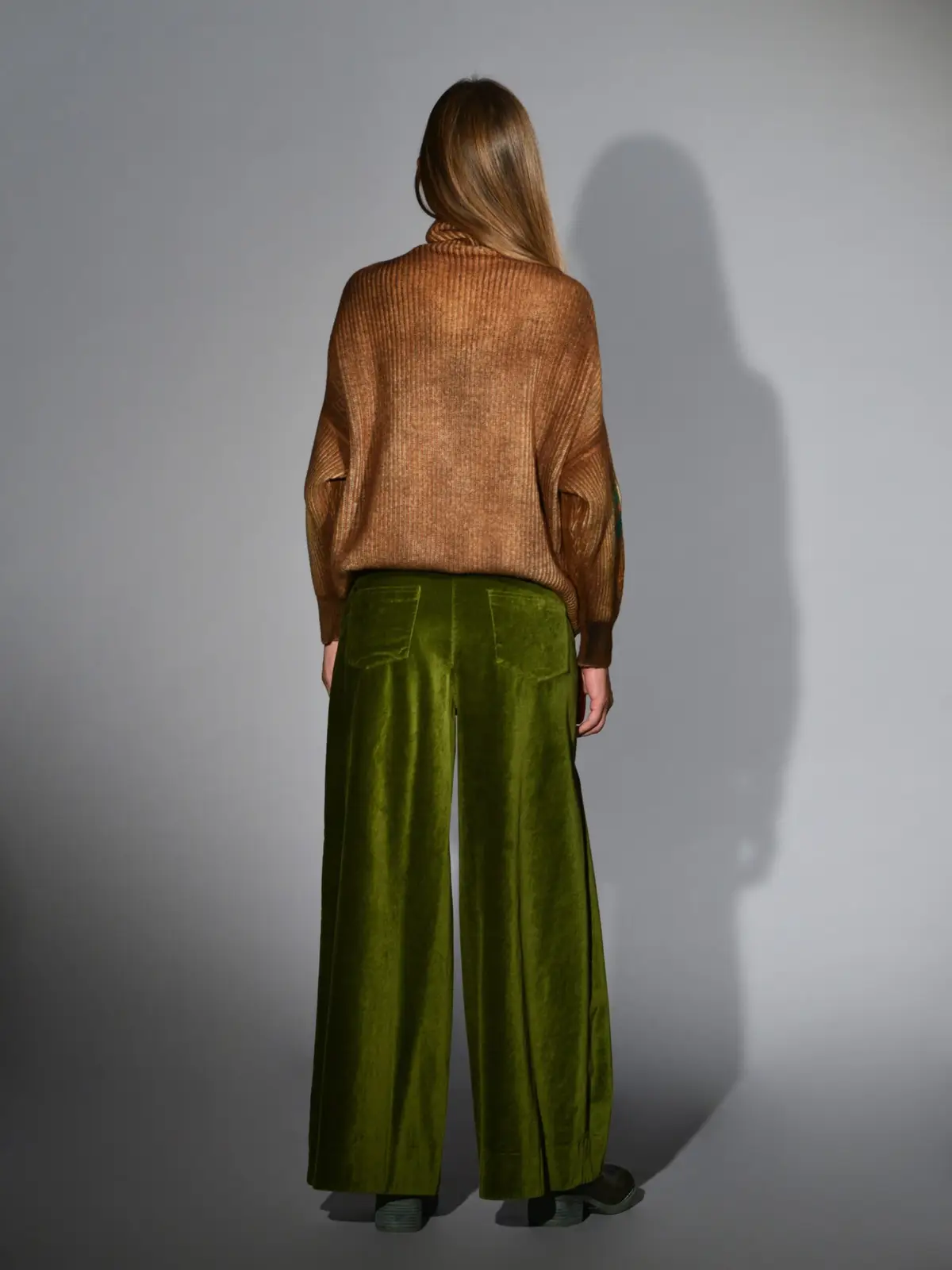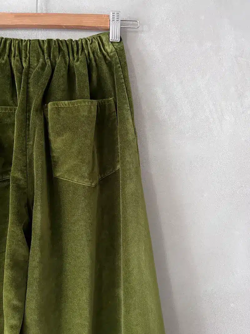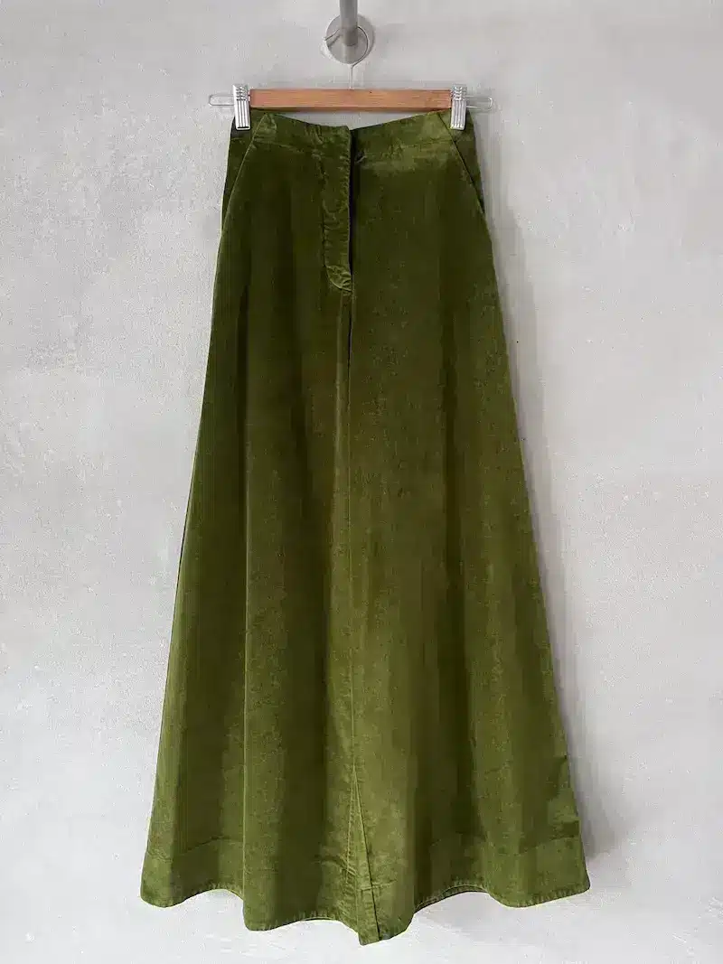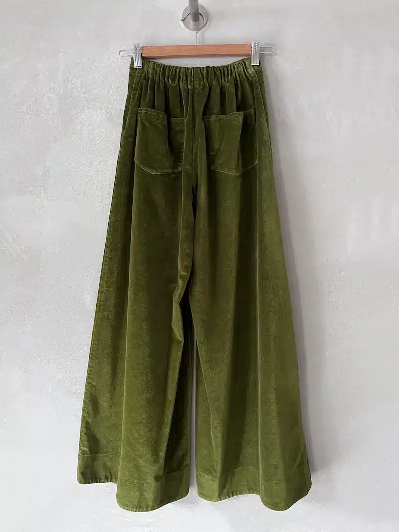 Wide-leg trousers made of stretch cotton-viscose velvet, high waist, closed in front with a zipper and inside hook, two side slant pockets, two patch pockets in back, waistband in back with elastic. Size 38 measurements: length 102 cm, hem bottom width 42 cm. Subsequent sizes will increase by 2 cm in length and 4 cm in circumference.