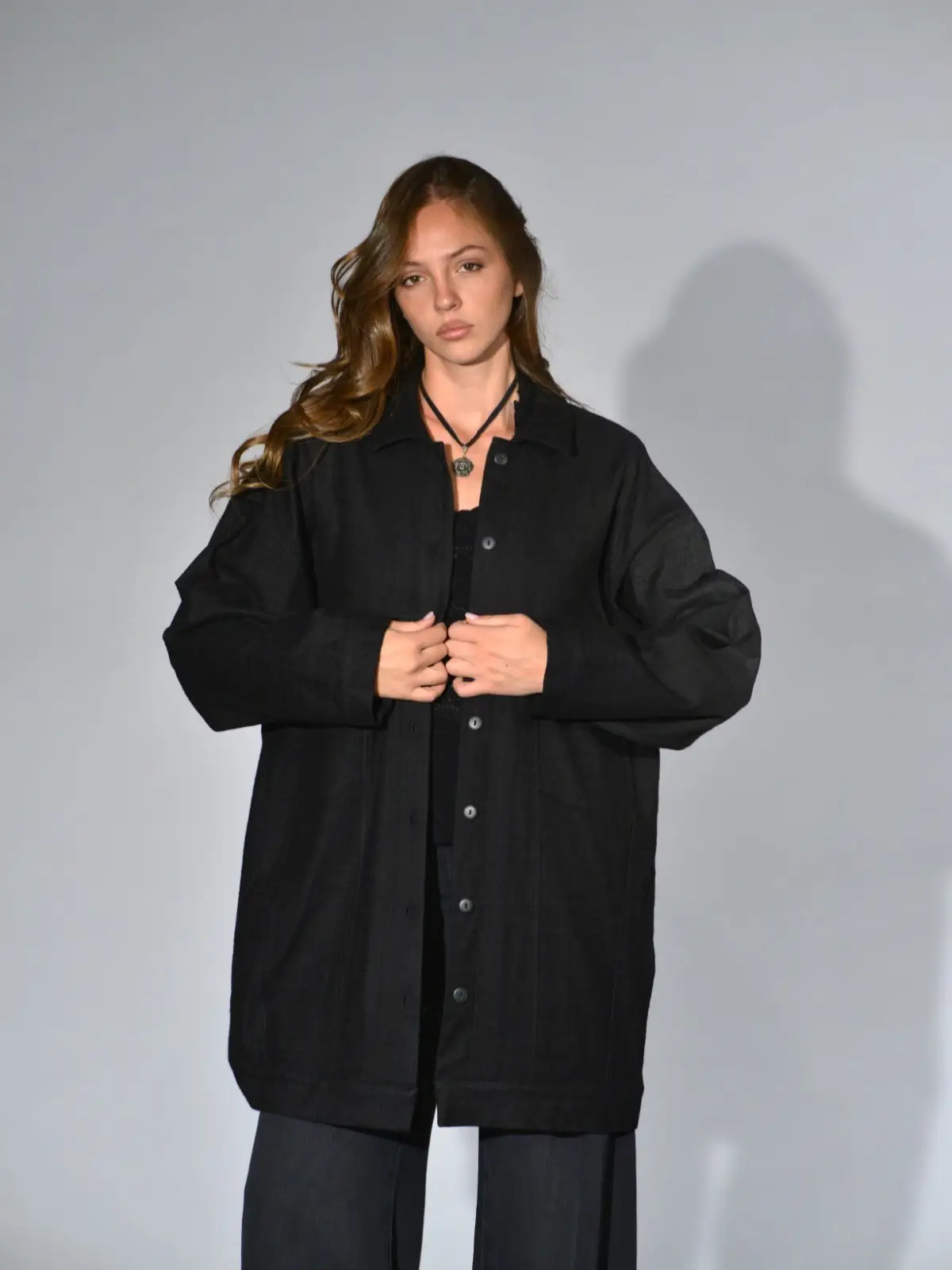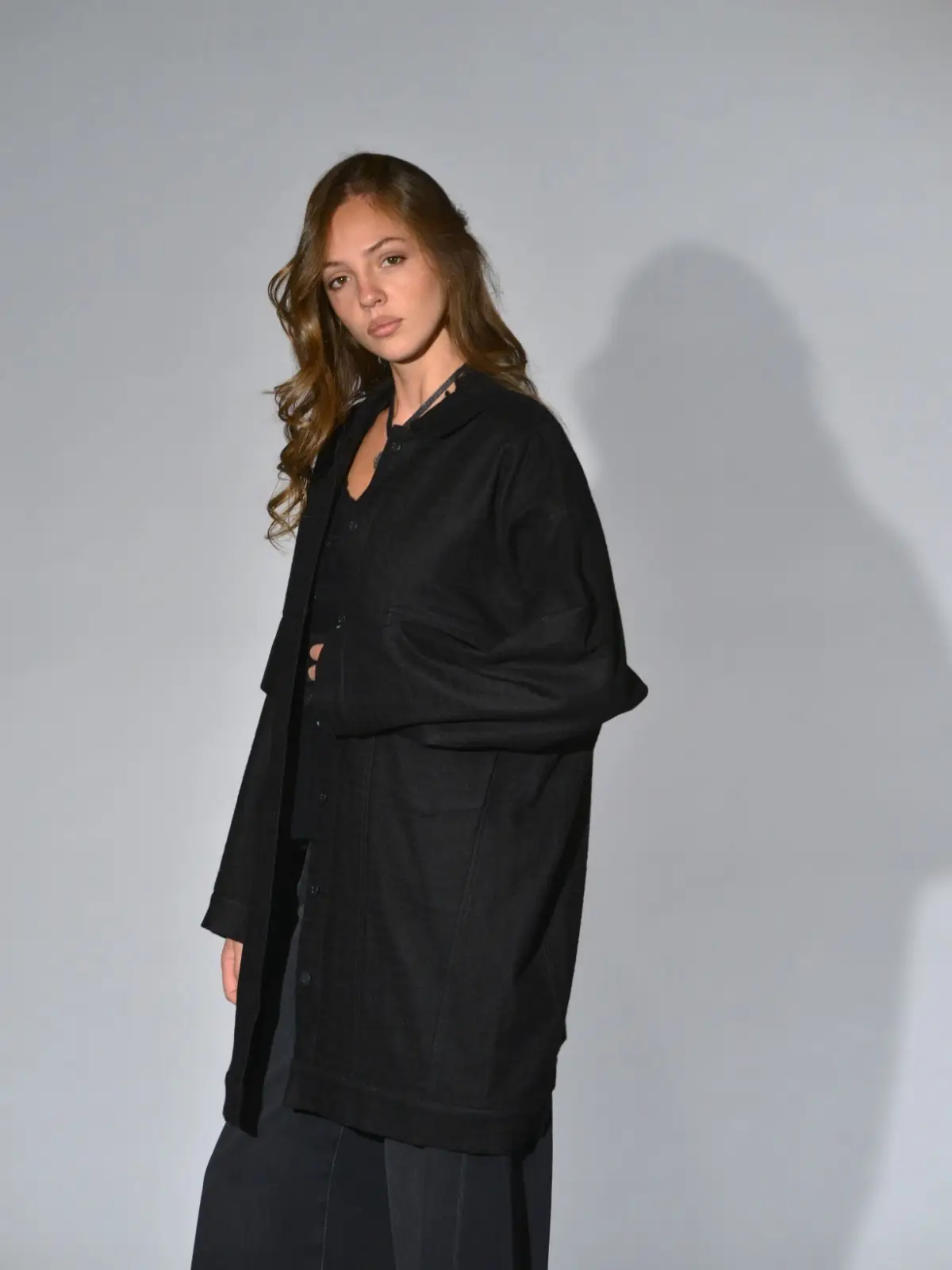 Long silk front buttoned dress, collar with small lapels, 135 cm length, loose fit, long sleeve, frayed raw-cut trim.
