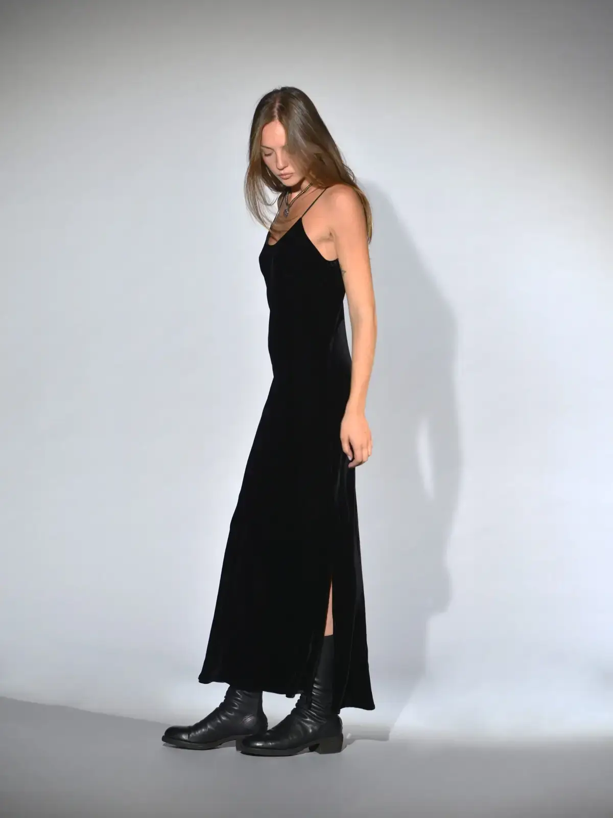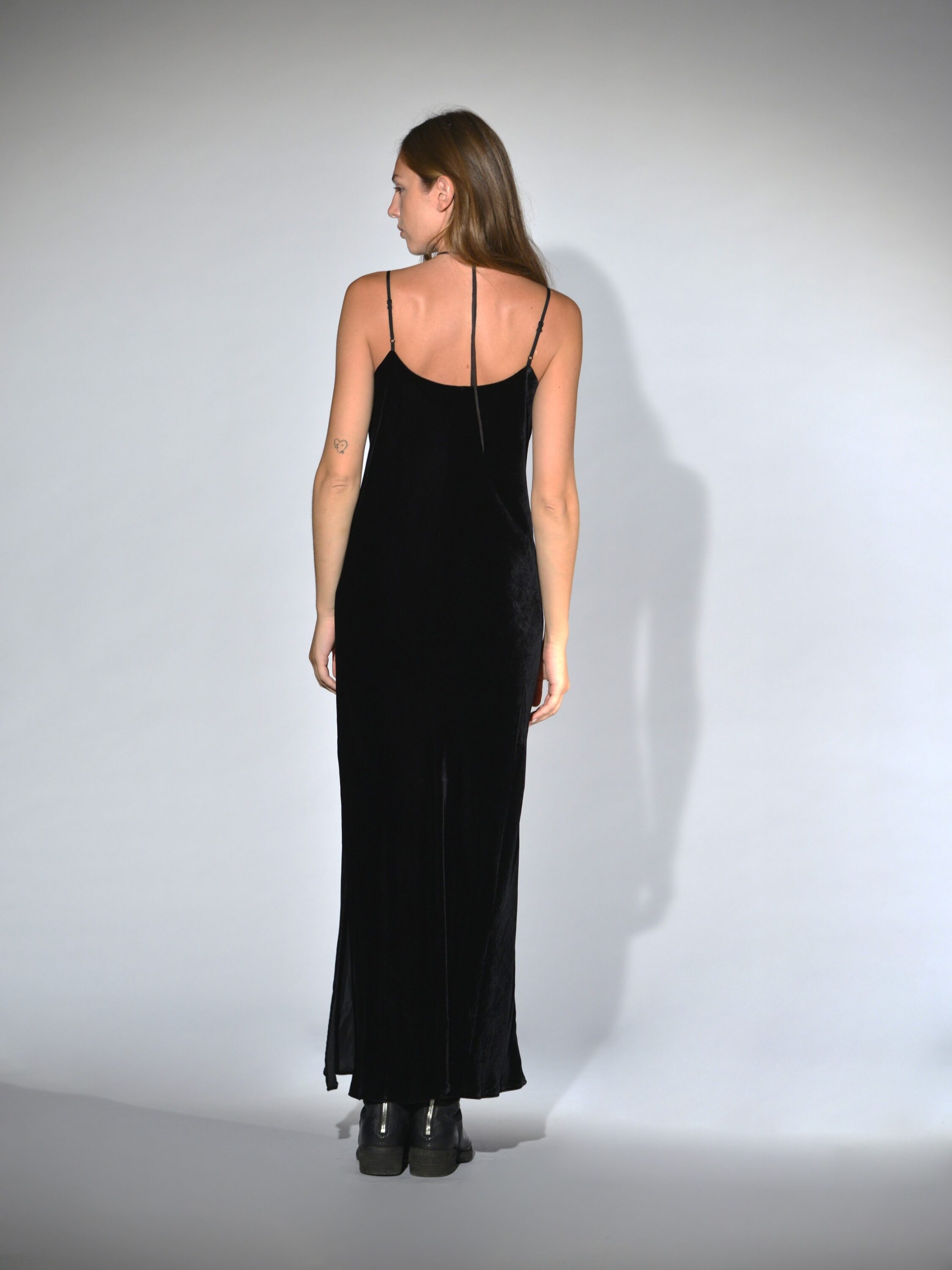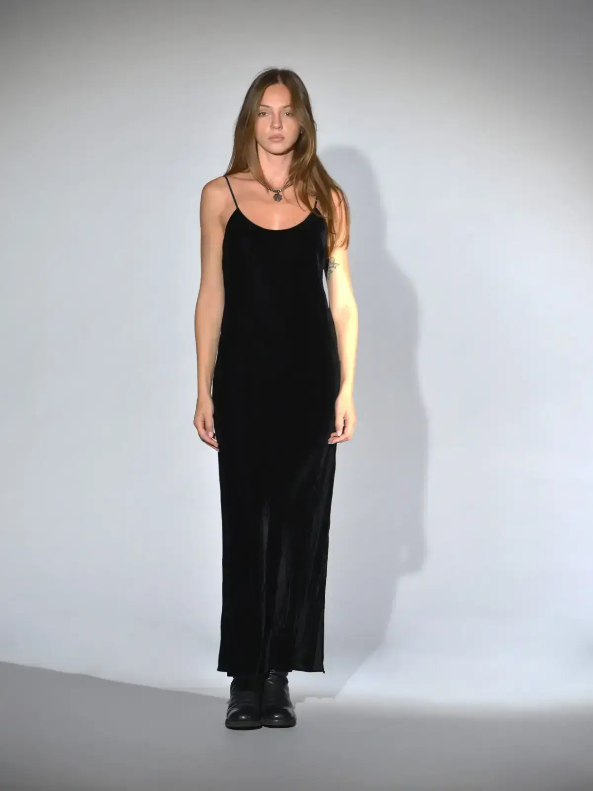 Long velvet dress with adjustable straps, fully bias cut, side slit, half lining. Size S measurements: length 130 cm, chest circumference 88 cm. Later size measurements will increase by 2 cm in length and 4 cm in circumference.