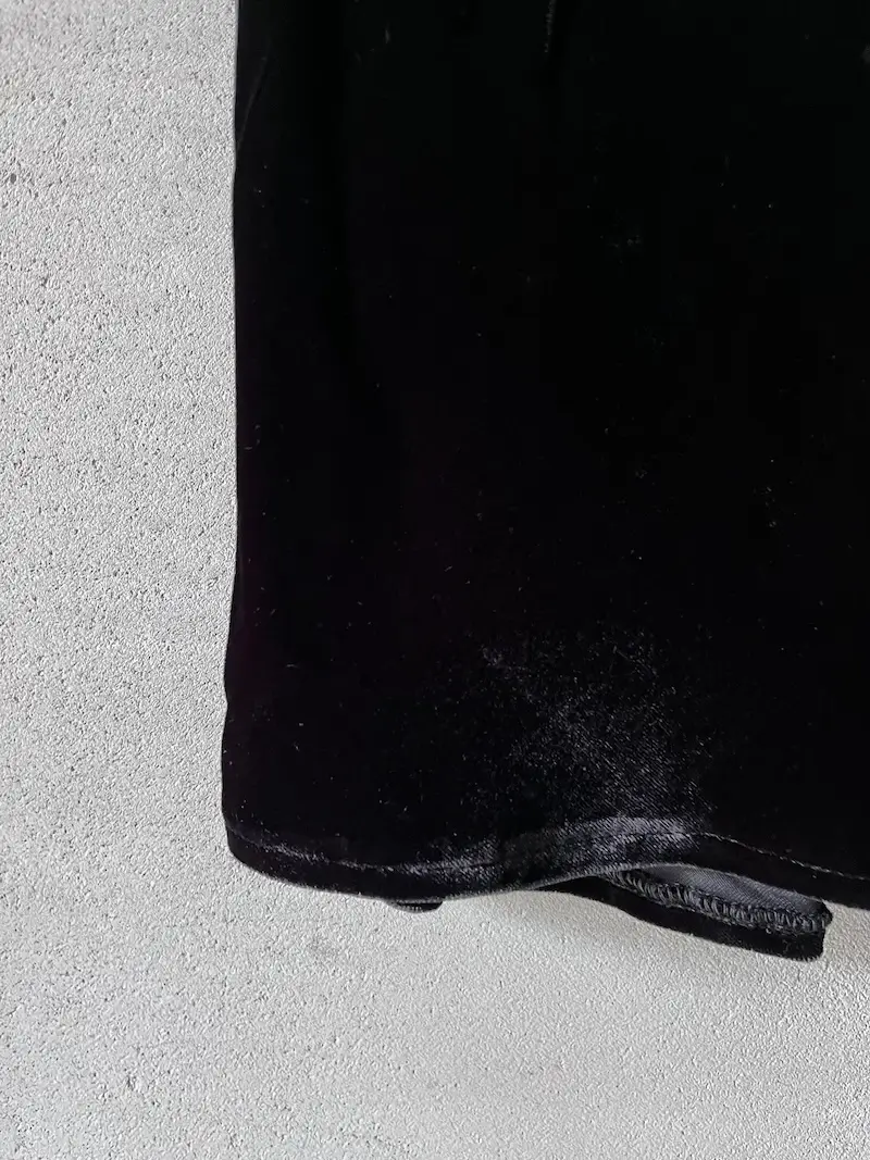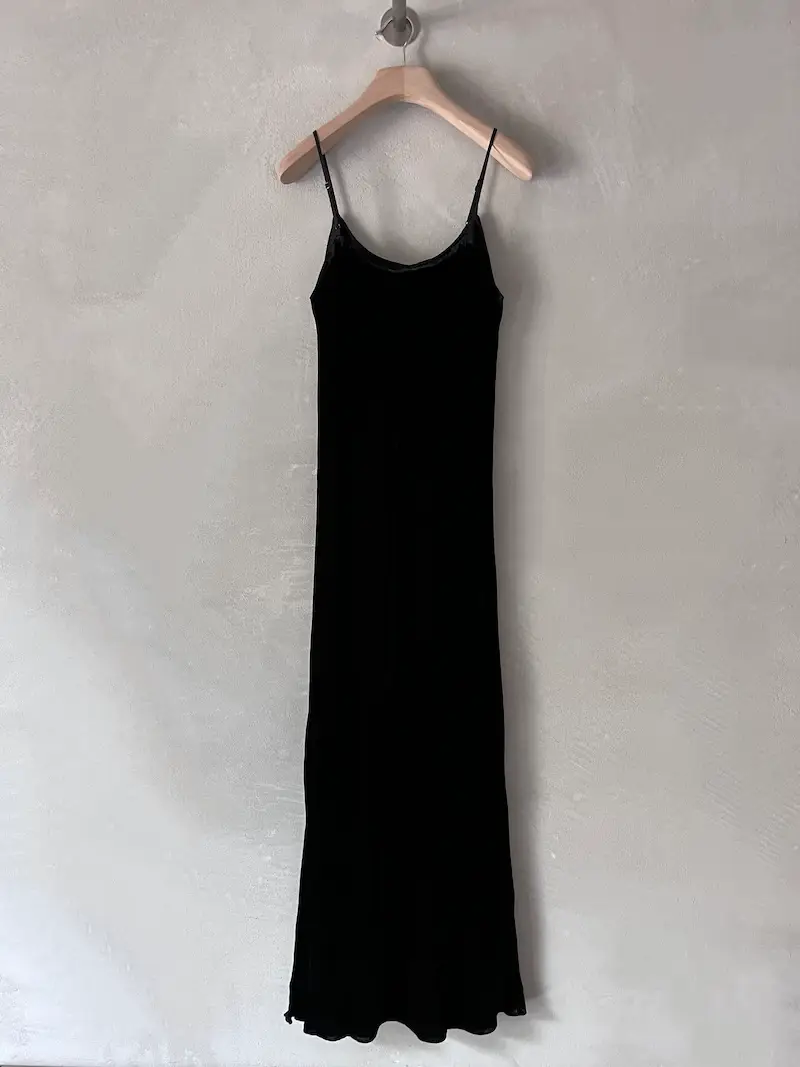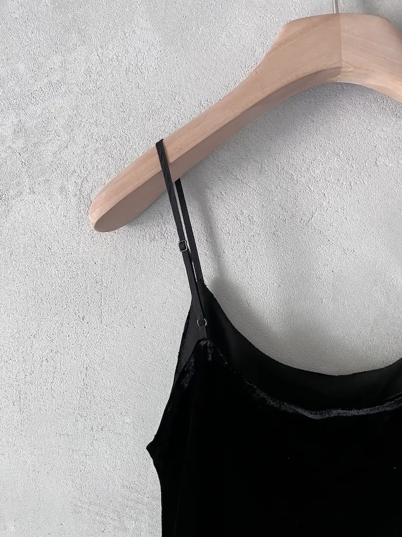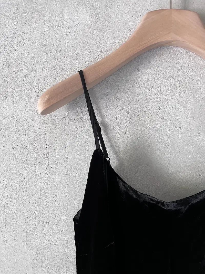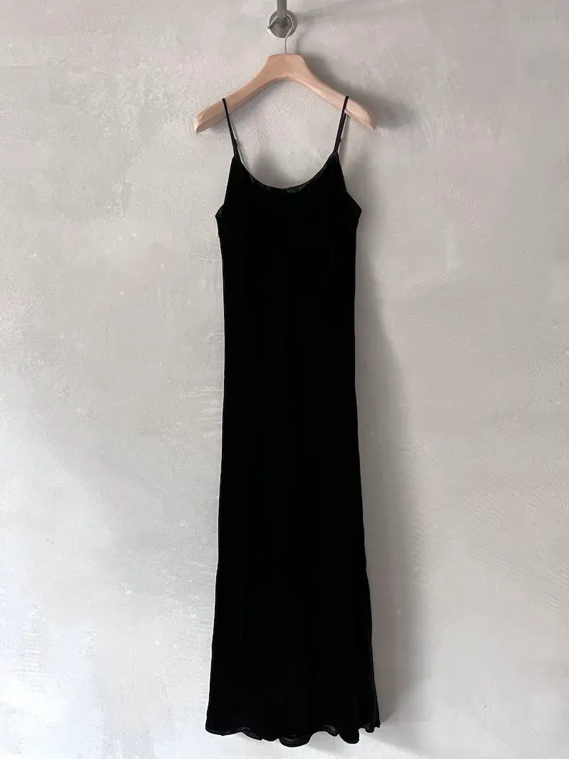 Long velvet dress with adjustable straps, fully bias cut, side slit, half lining. Size S measurements: length 130 cm, chest circumference 88 cm. Later size measurements will increase by 2 cm in length and 4 cm in circumference.