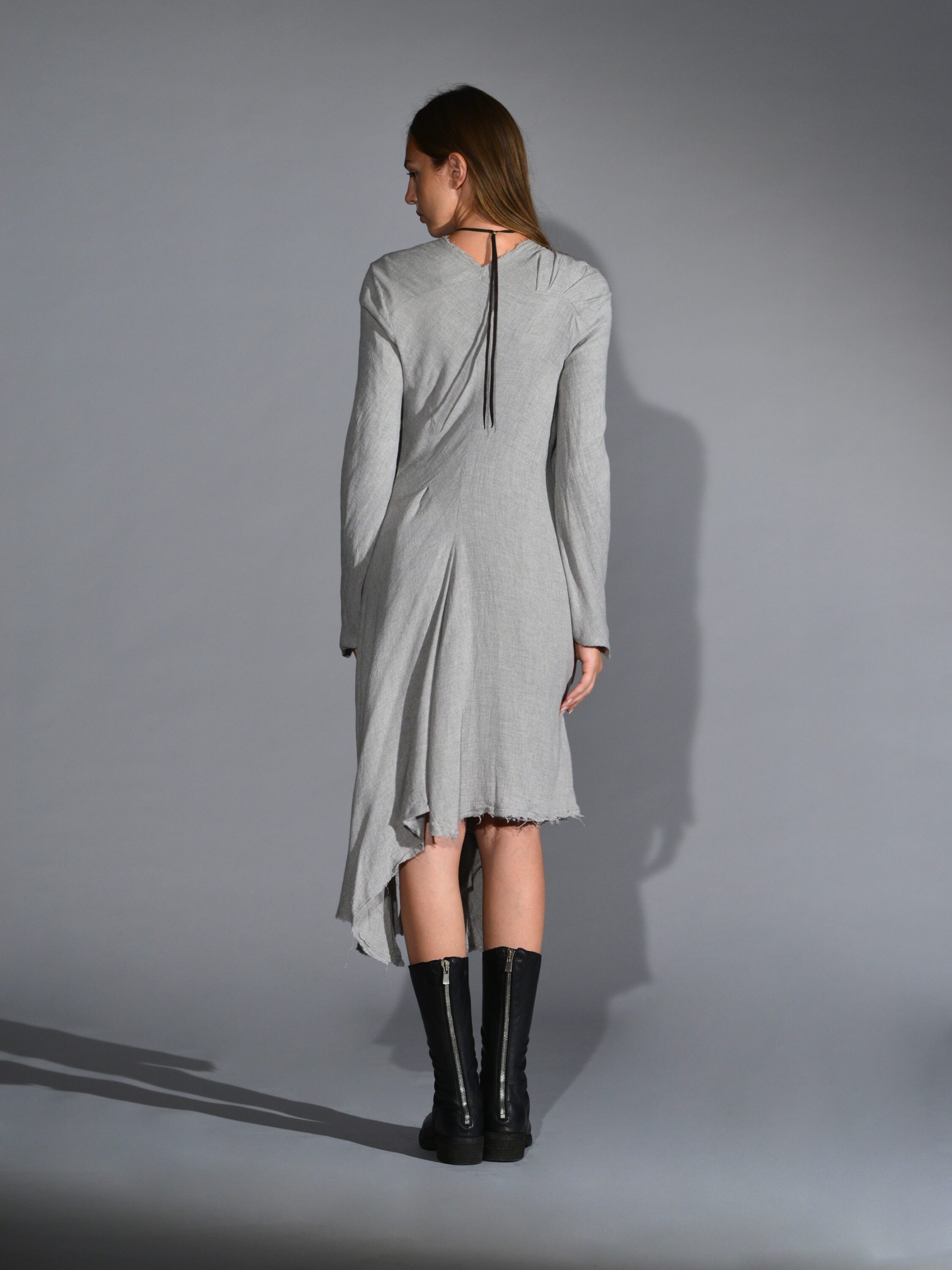 Wool and viscose melange midi dress with asymmetric lengths and cuts, V-neck formed by a knot, long sleeve with pointed cuff, fully lined in silk, raw-cut neckline and hem trim. Size 38 measurements: lengths 100/126, chest circumference 86 cm. Later size measurements will increase 2 cm in length and 4 cm in circumference.